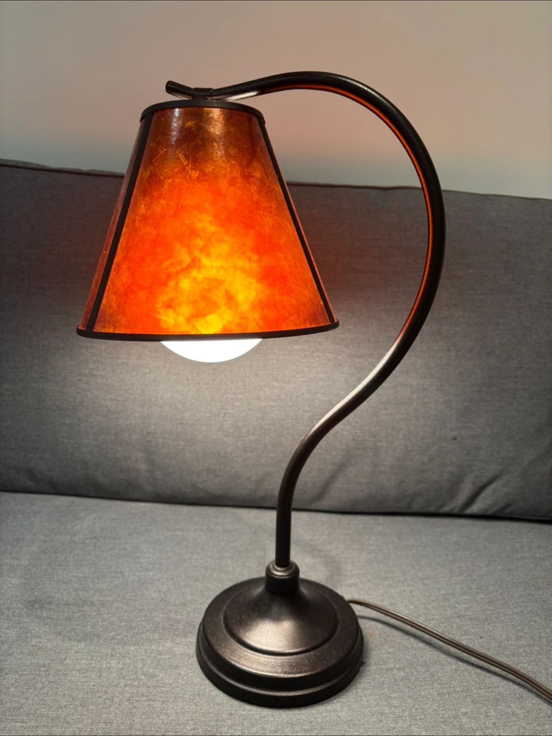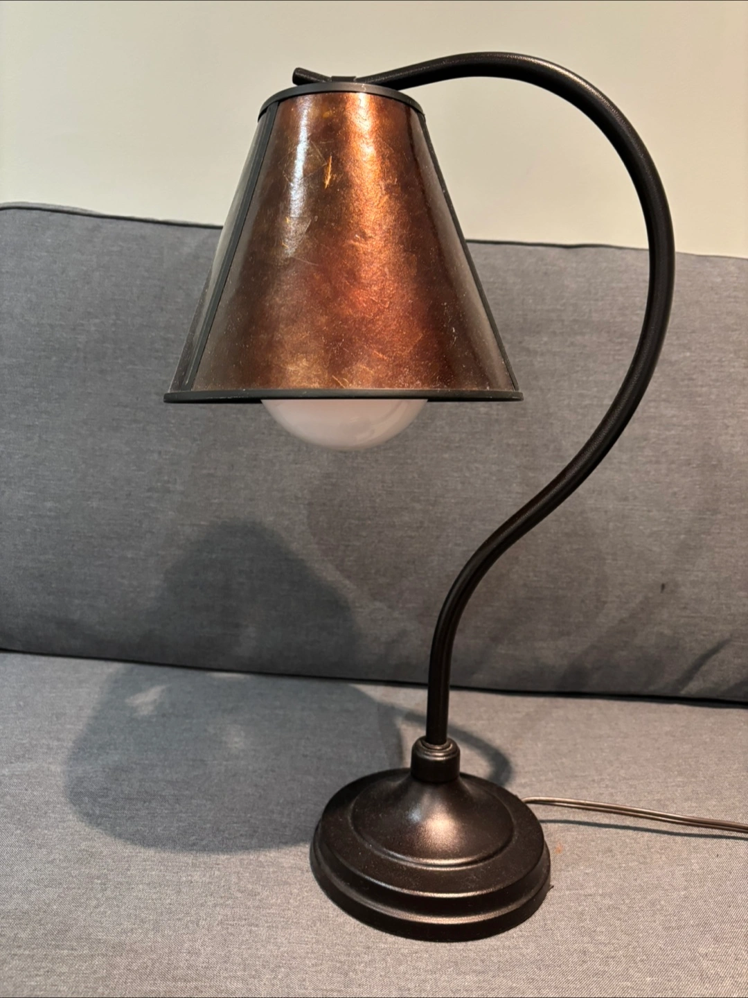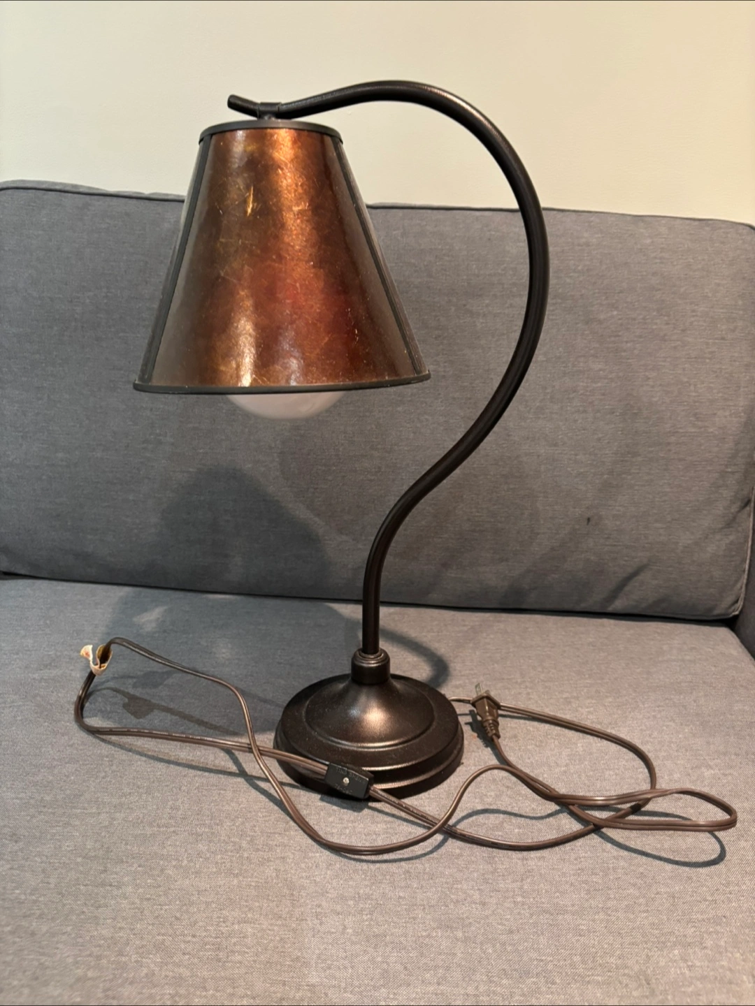 Here's a stylish desk lamp that would look great in any room! It features a bronze-coloured shade and a curved black metal stand. It's in great shape and ready to brighten up your space - great condition - perfect for any office or bedroom space - message for inquires - located at dufferin and Lawrence