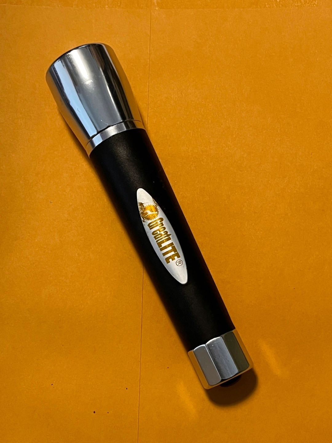 Very dim, old school AA-powered flashlight. Good for little kids who you don’t want blinding you as they learn flashlight etiquette. Also good for people who don’t really want to see.