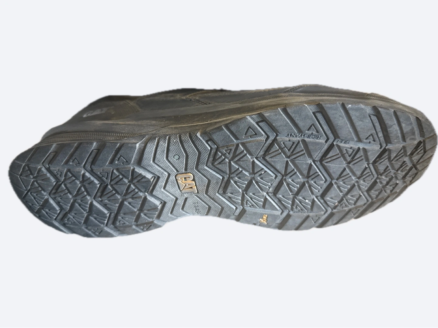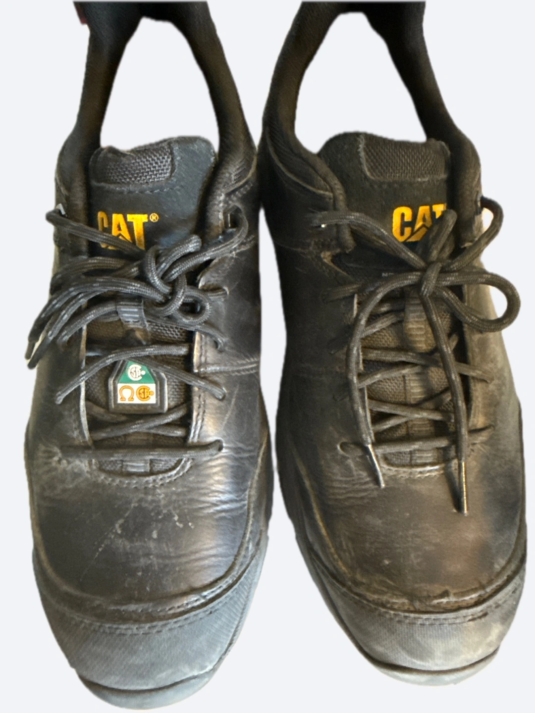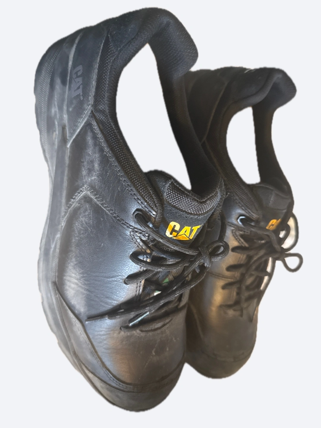 Selling a pair of CAT work shoes in black leather. They have some signs of use, but are still in good condition. Perfect for anyone needing durable work footwear!