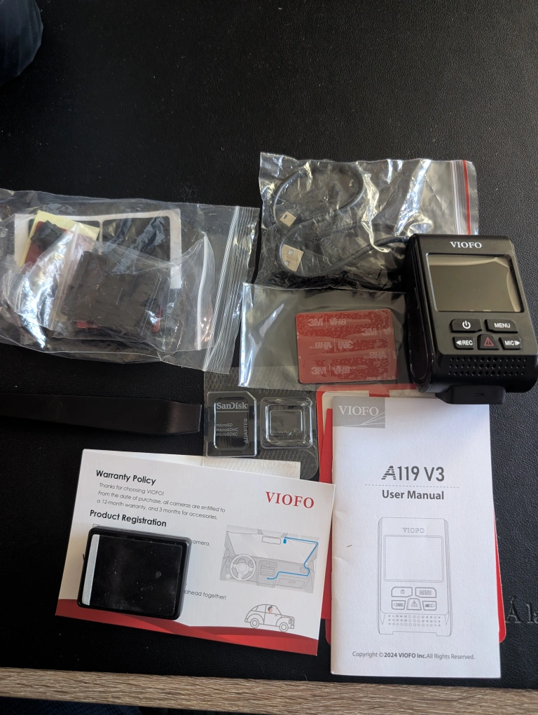 Selling a VIOFO A119 V3 dash cam with 128GB SD. It comes with all original components and the user manual. Additional adhesive strips and long USB cord included. Does not include cables to connect directly to battery (Did not come with original purchase).