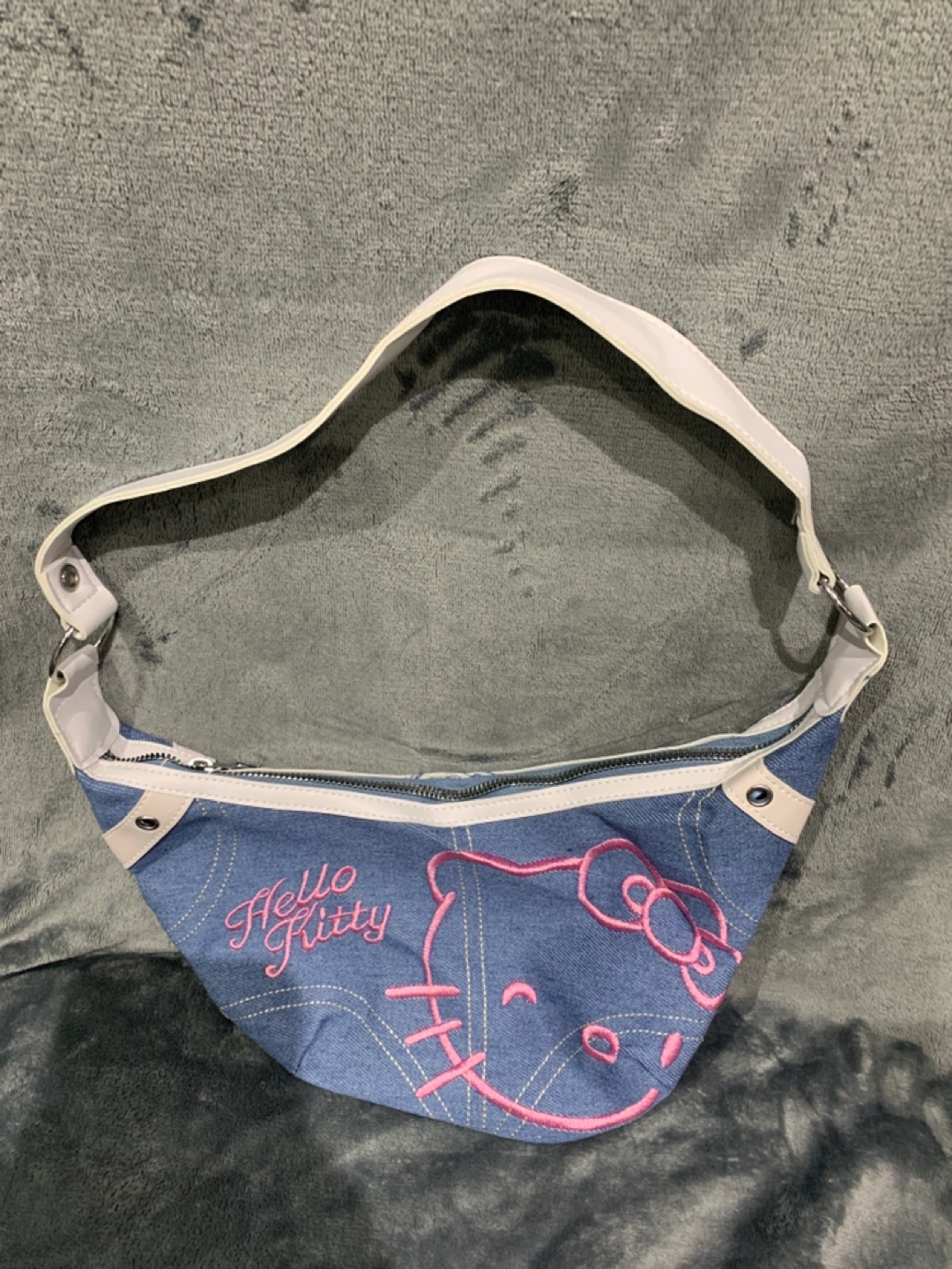 Super cute Hello Kitty denim shoulder bag! It features a white strap and pink Hello Kitty embroidery on the front. Perfect for any Hello Kitty fan!