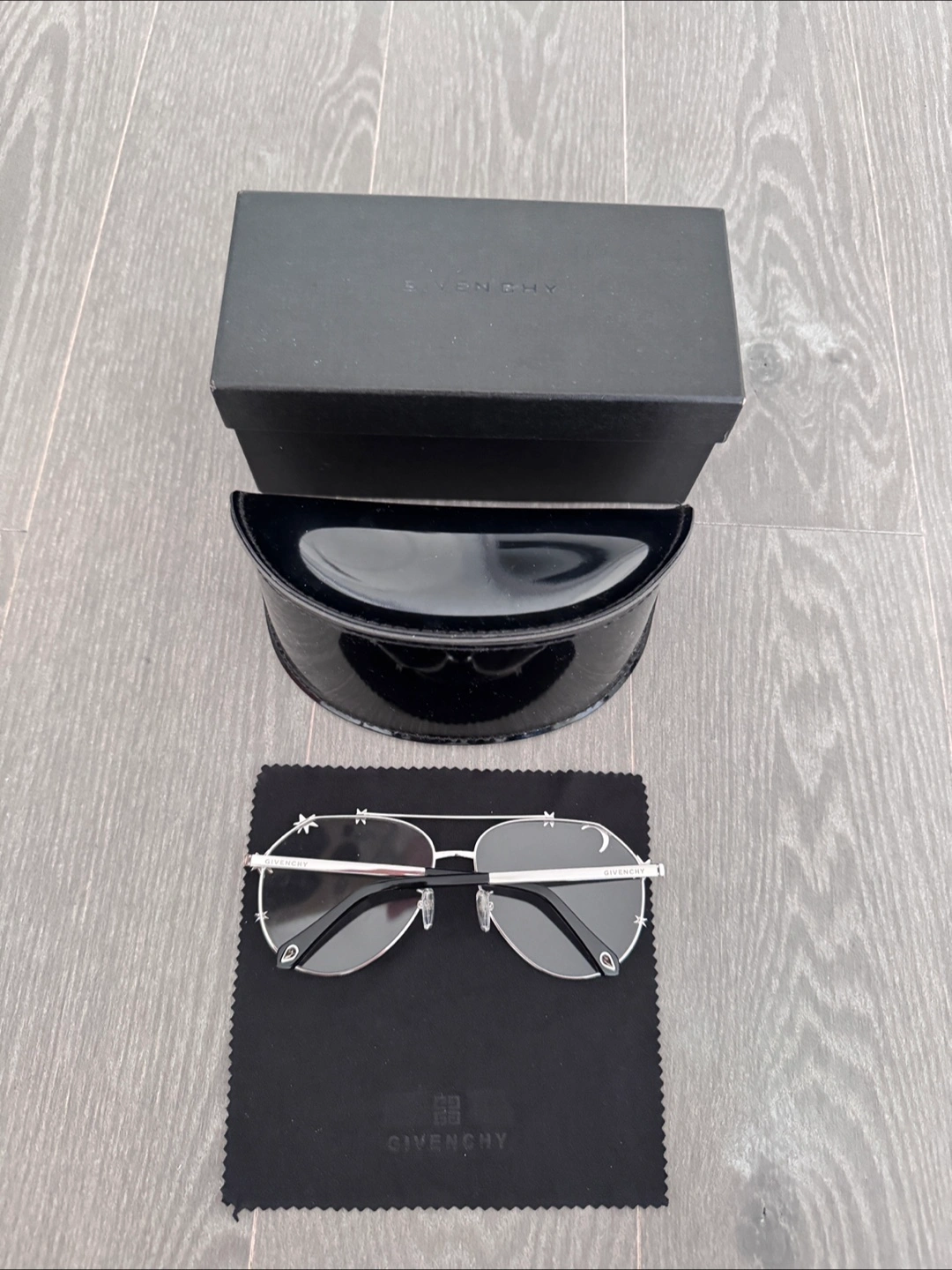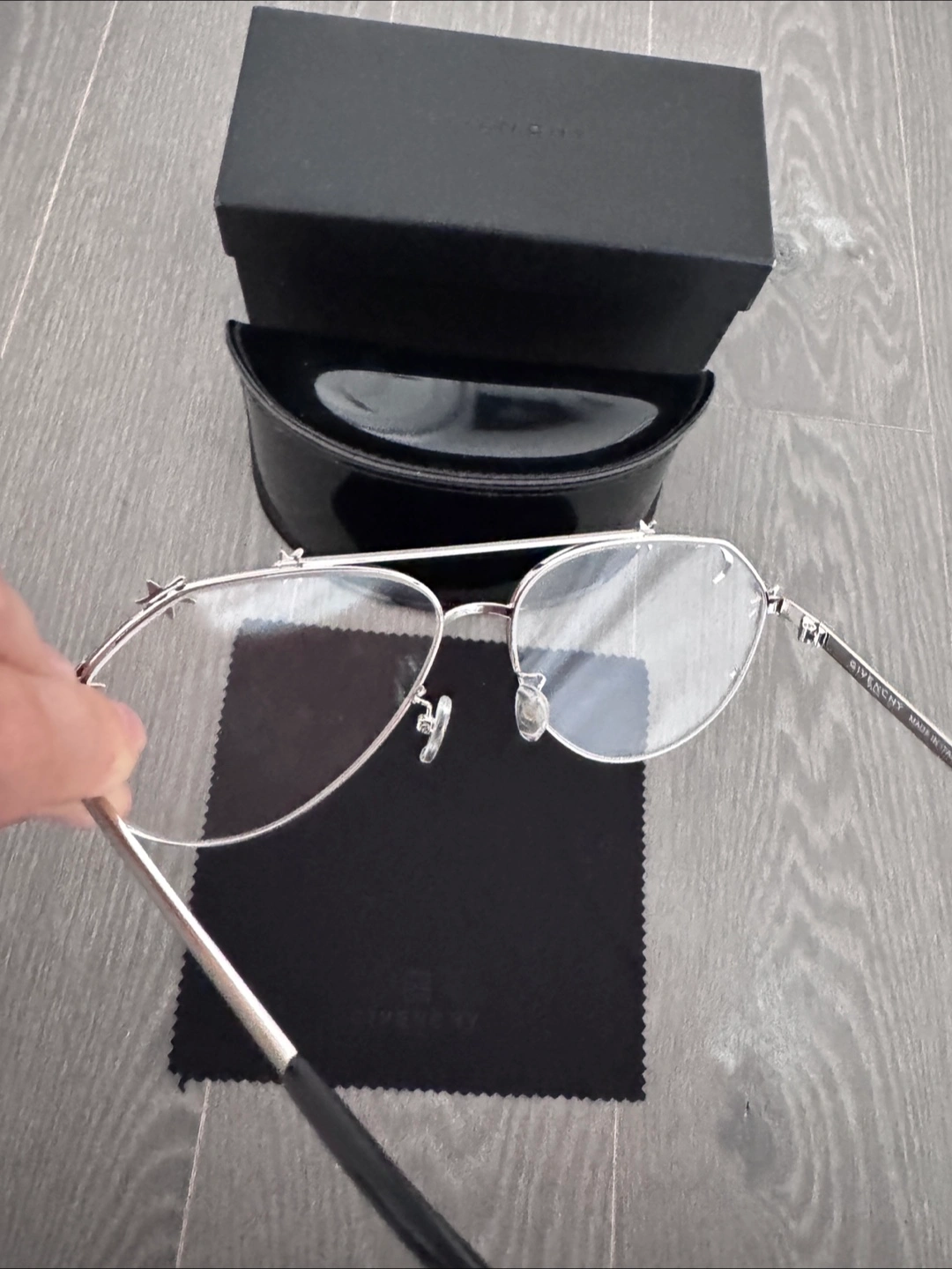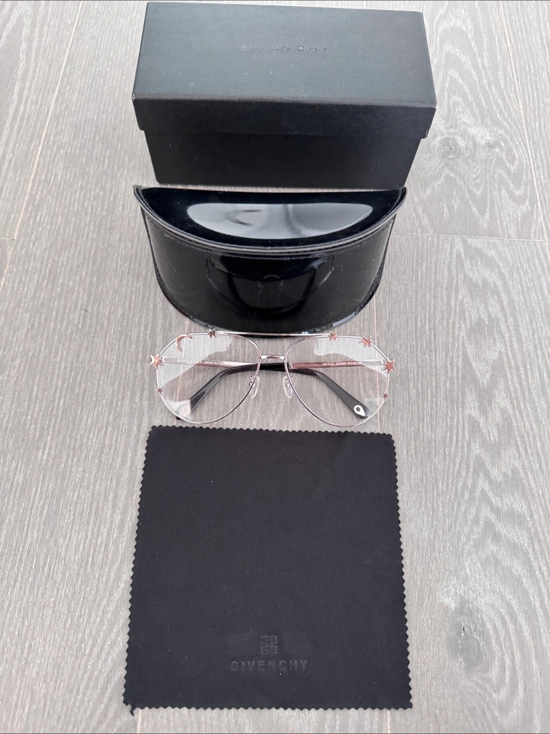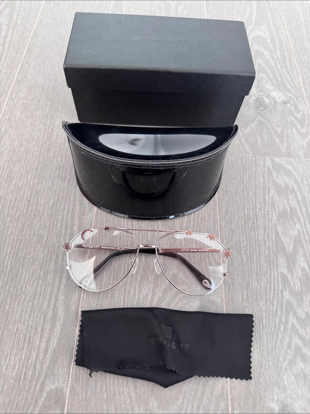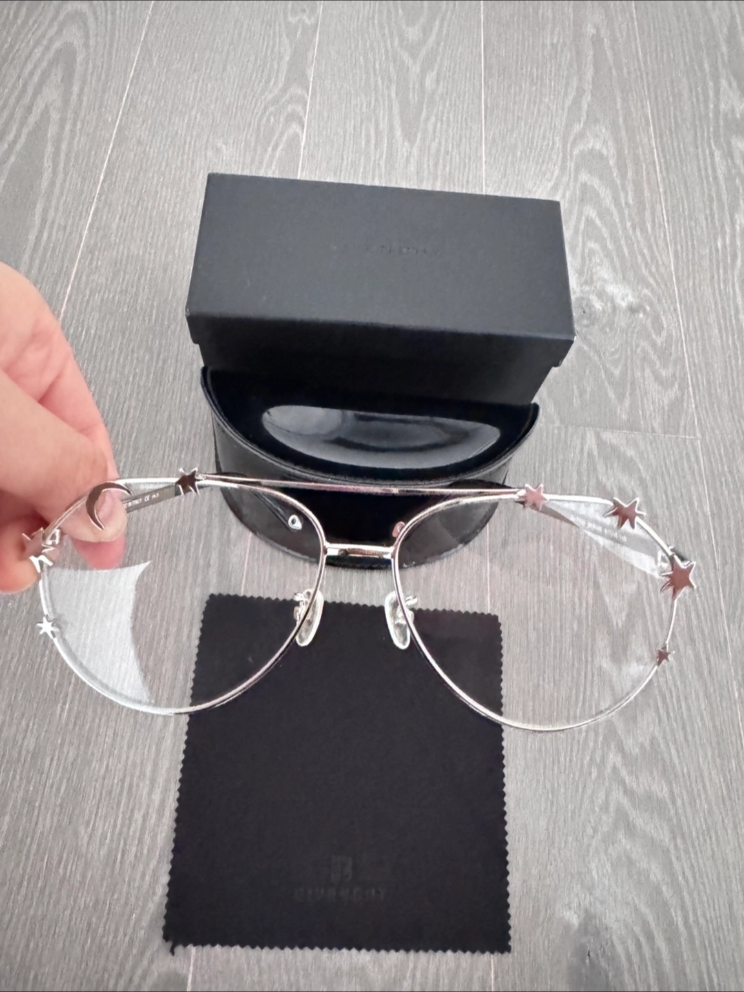 Selling a pair of brand new Givenchy eyeglasses! They come with the original box, case, and cleaning cloth. The frames are silver and feature a unique star and moon design on the top. They're in great condition and ready for a new home!