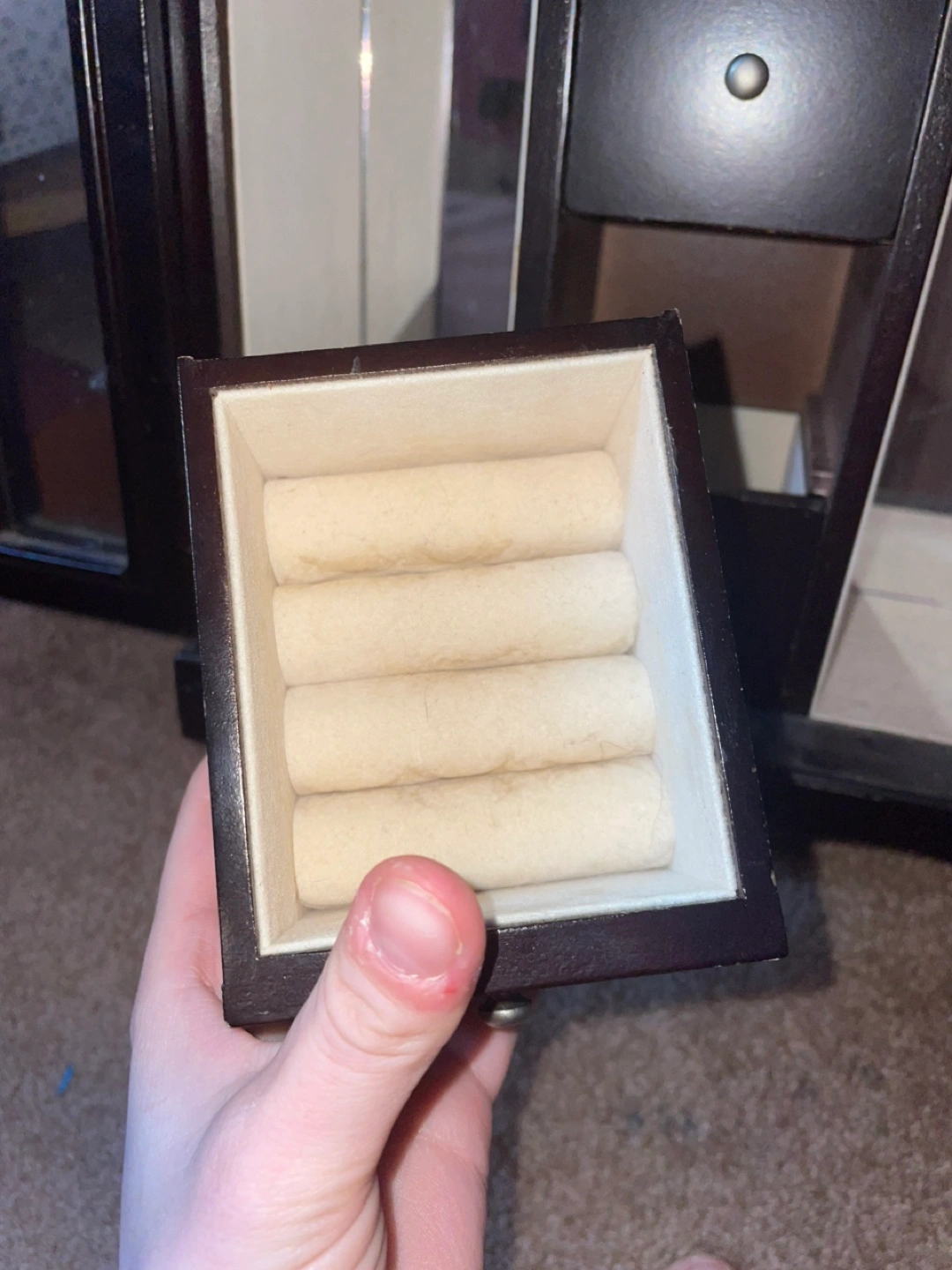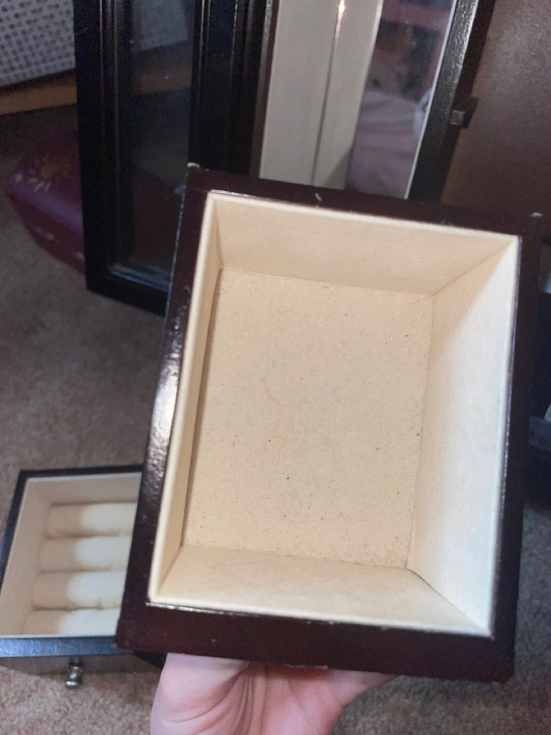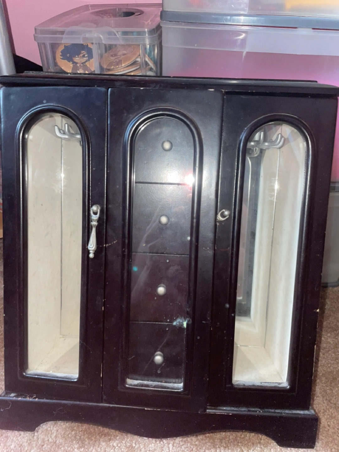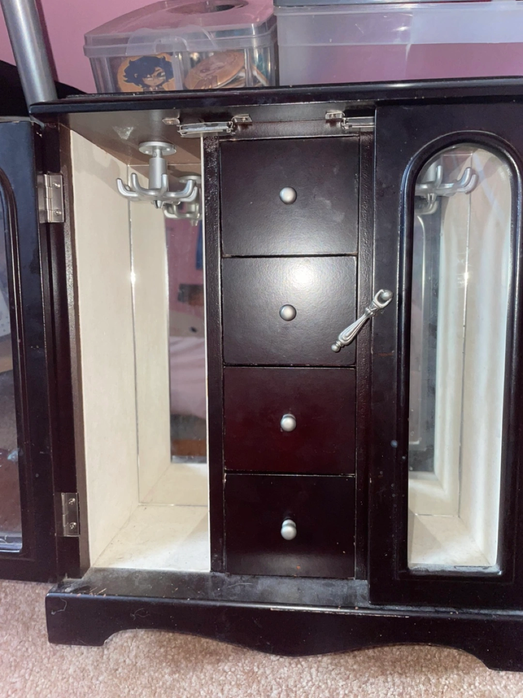 Selling a dark brown jewellery box! It features four drawers and side compartments with hooks for necklaces. Perfect for keeping your accessories organized and safe. Used but perfectly fine, just needs a cleaning.