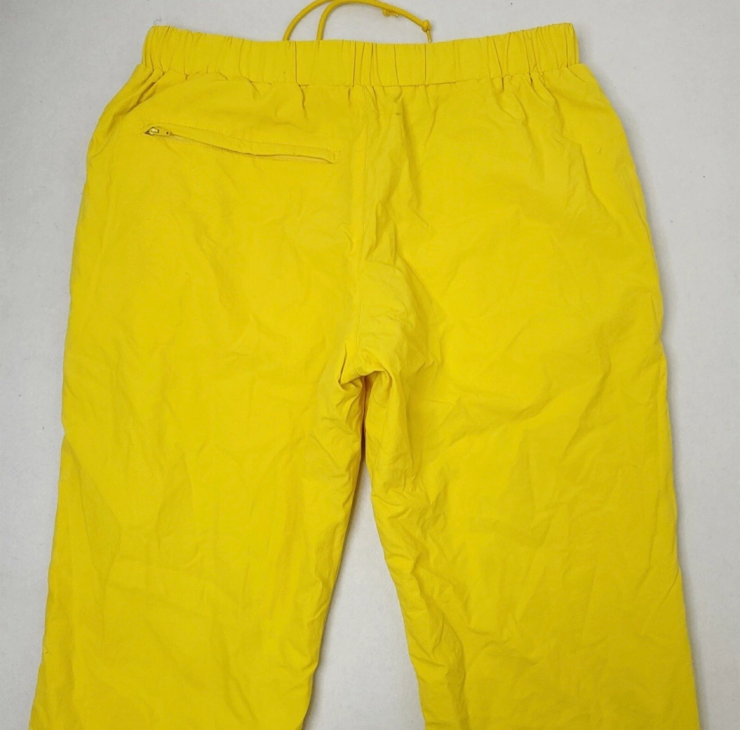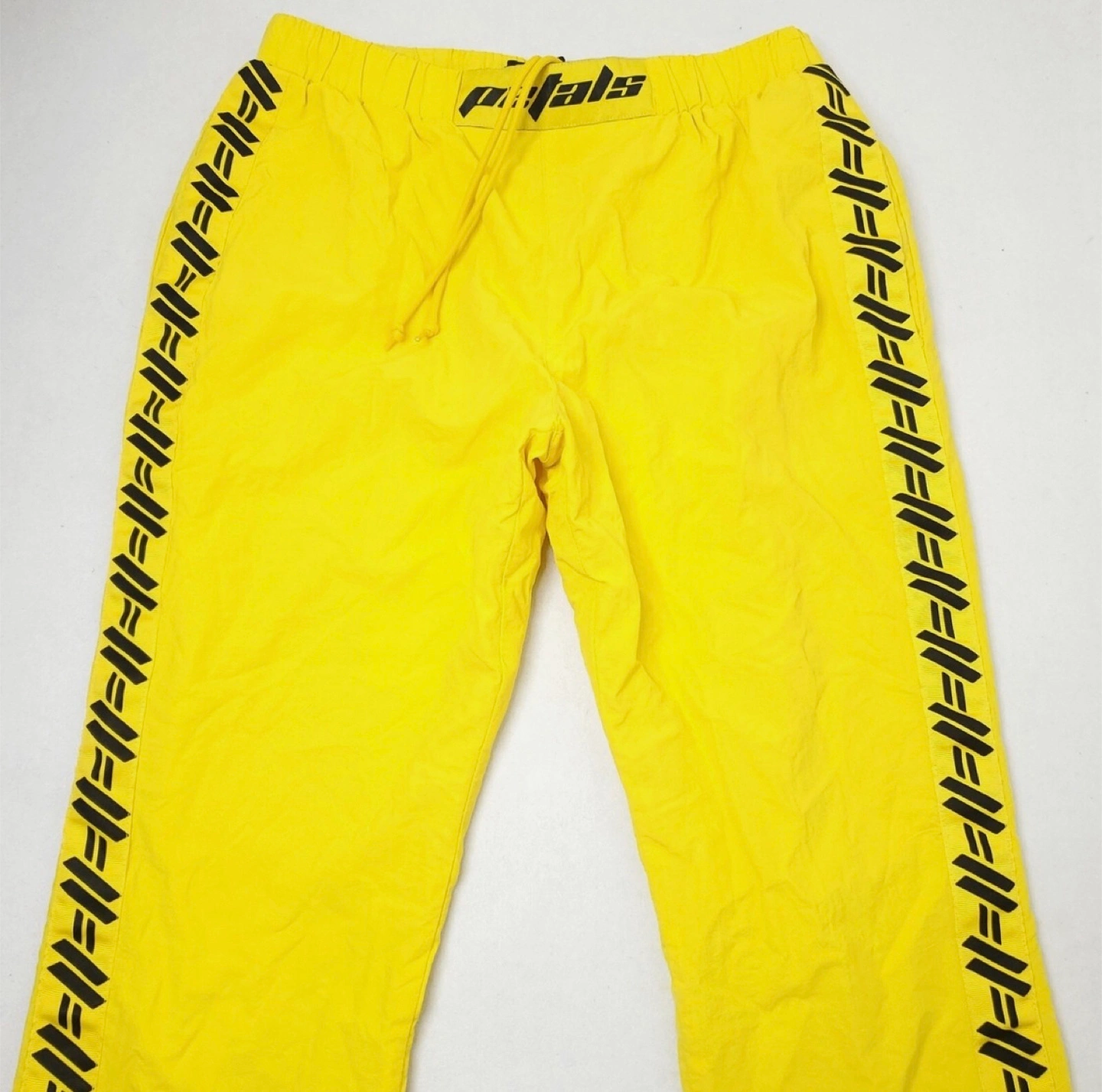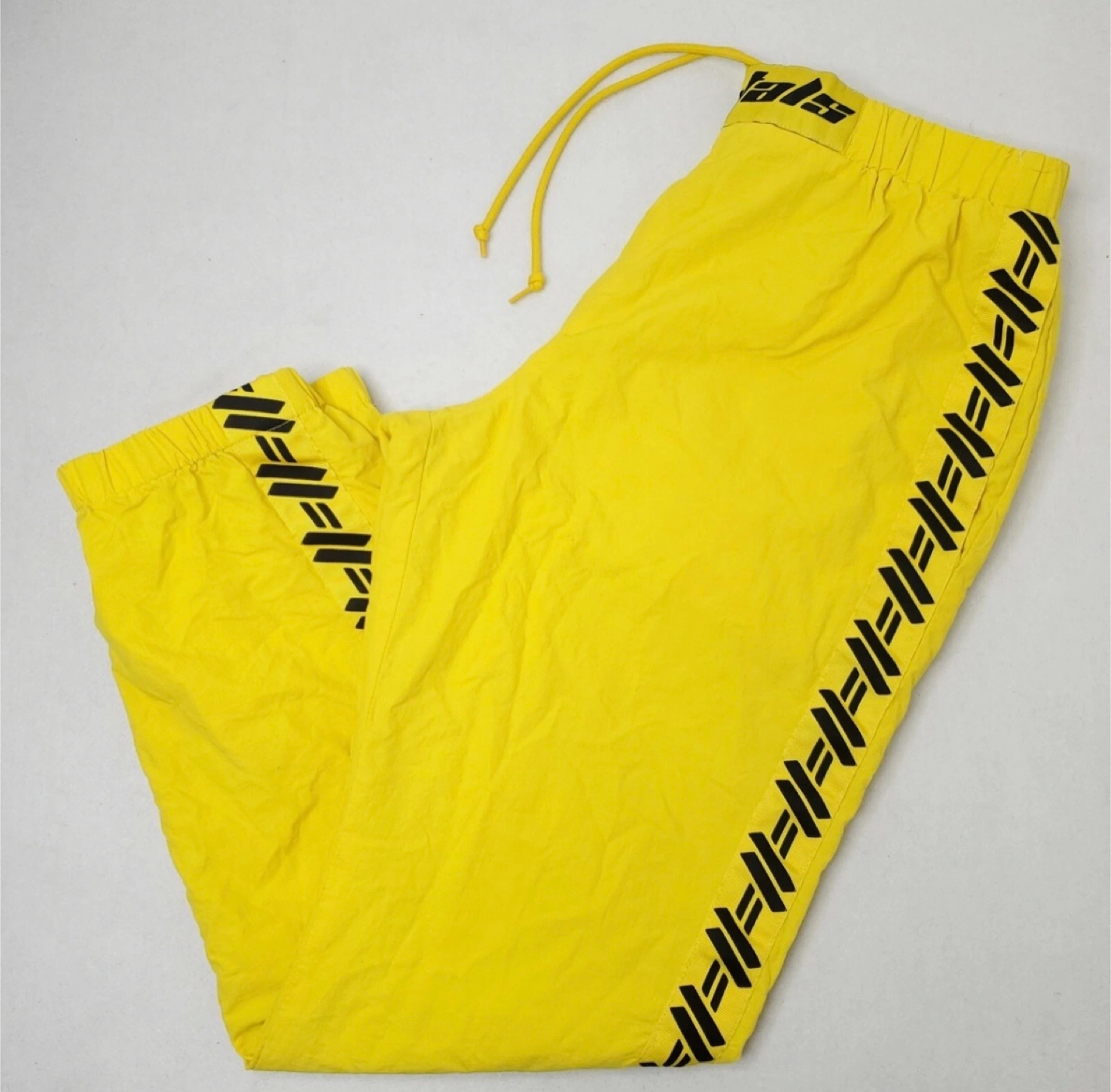 These track pants are a vibrant yellow with a unique design! They're perfect for adding a pop of colour to your wardrobe and are super comfy for everyday wear