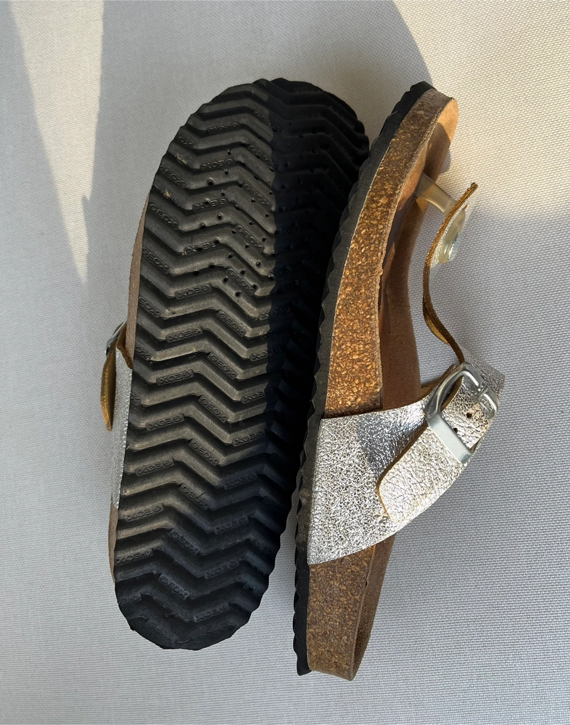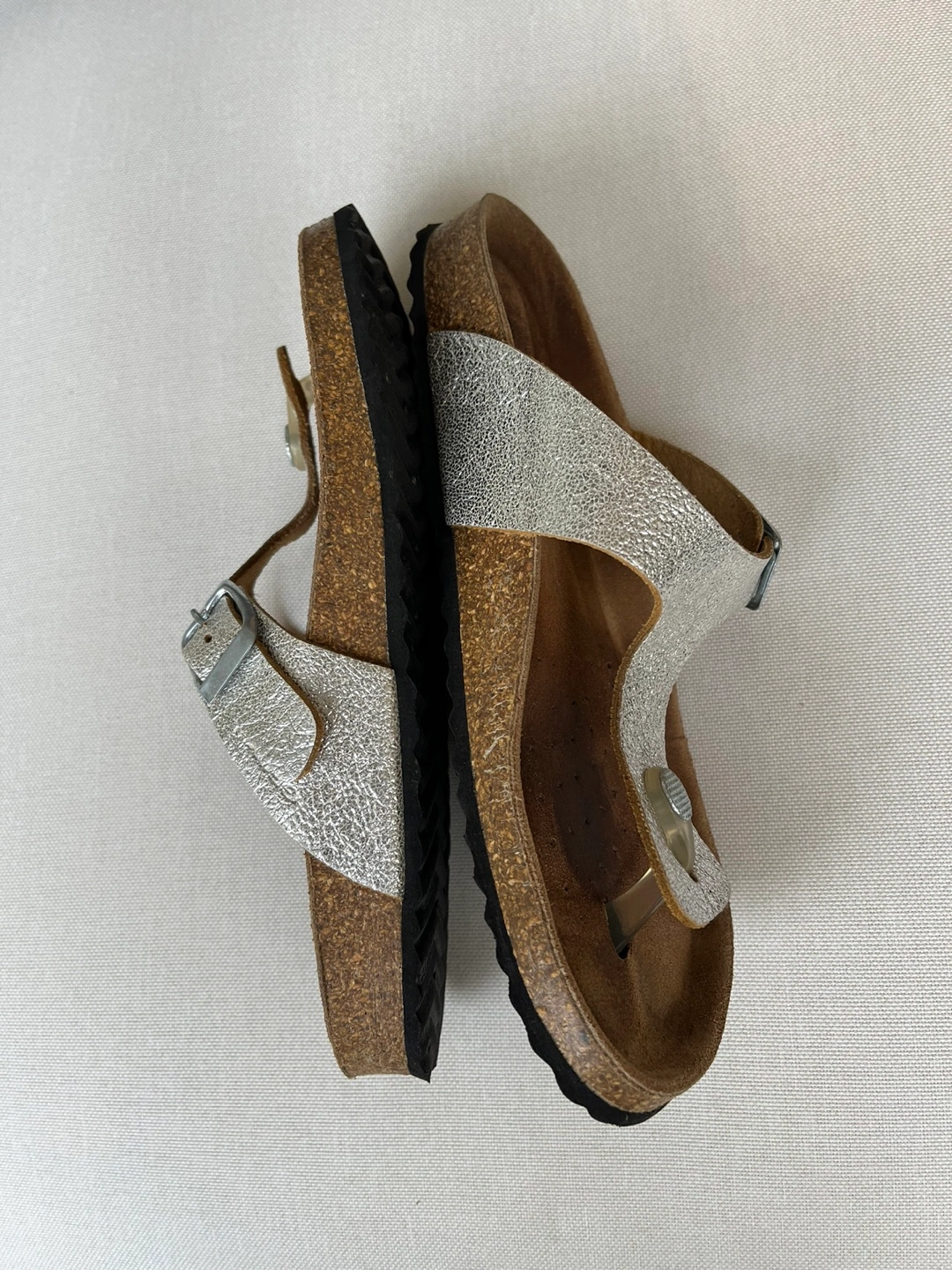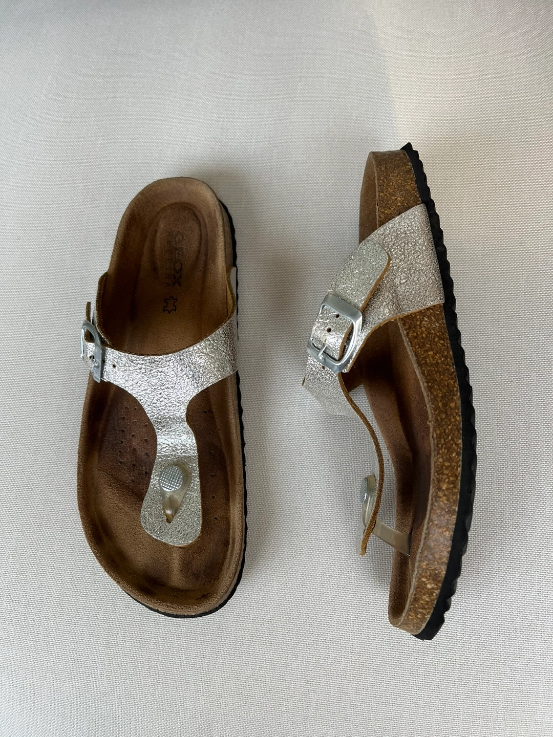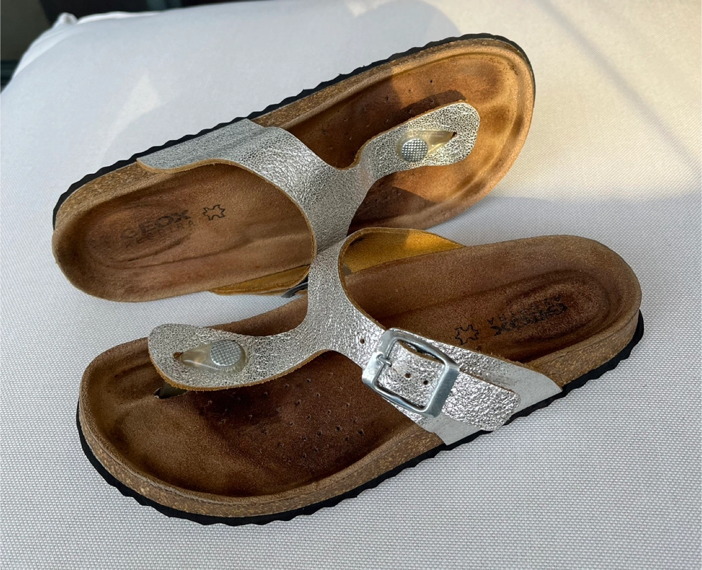 Beautiful GEOX Respira Silver Leather Thong Buckle Flip Flop Cork Sandals Women Size 7 Great Condition, soft and comfortable Pick Up Bloor and Islington Etobicoke