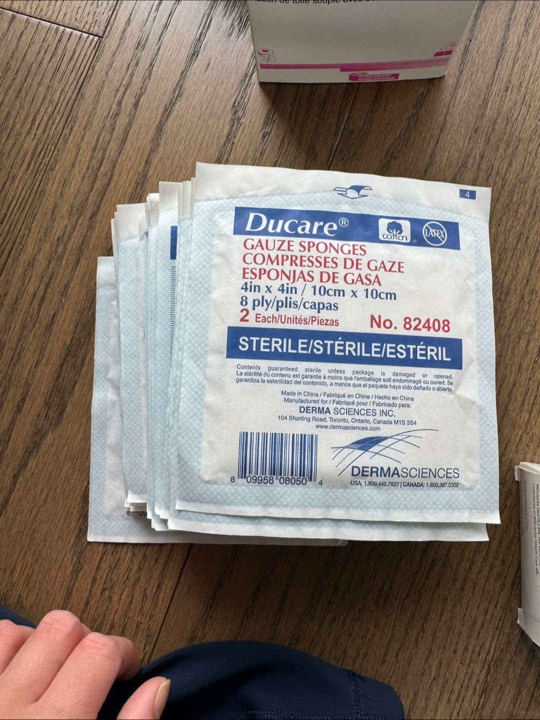 Selling a package of Ducare gauze sponges. They are 4in x 4in / 10cm x 10cm and come with 8 ply/plis/capas. 23 packs