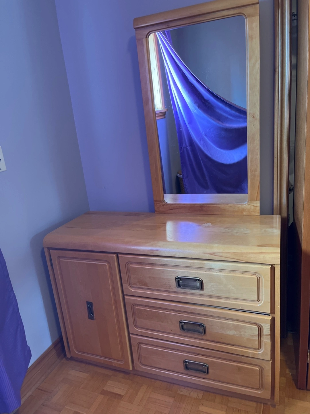 Selling a gently used single wooden bed frame and mattress has 2 drawers $70 also dresser with mirror set. $70 each Desk $30 $140 for set. It's in great condition and ready for a new home or cottage spare bedroom college/university. The frame has a classic design that would fit well in many bedrooms. Can be sold separately.