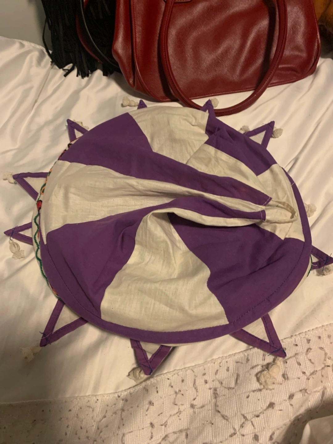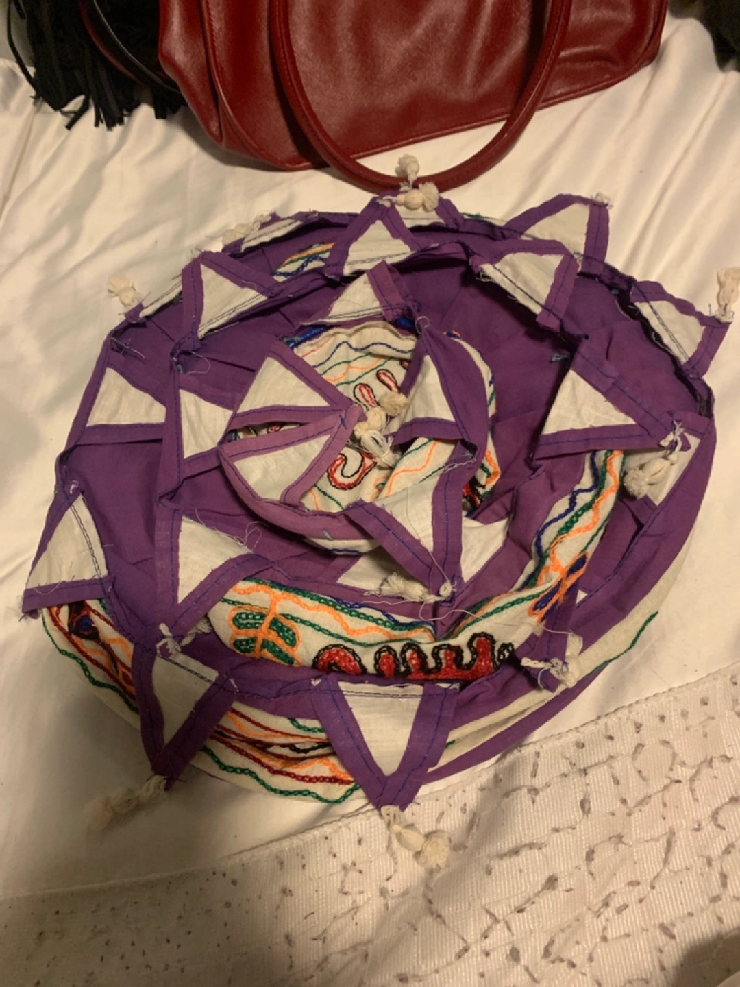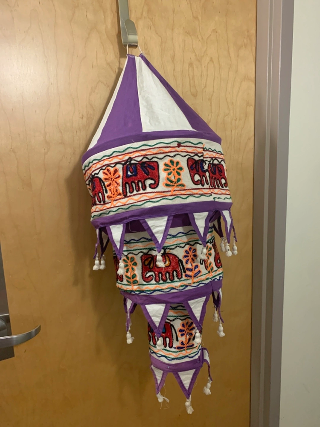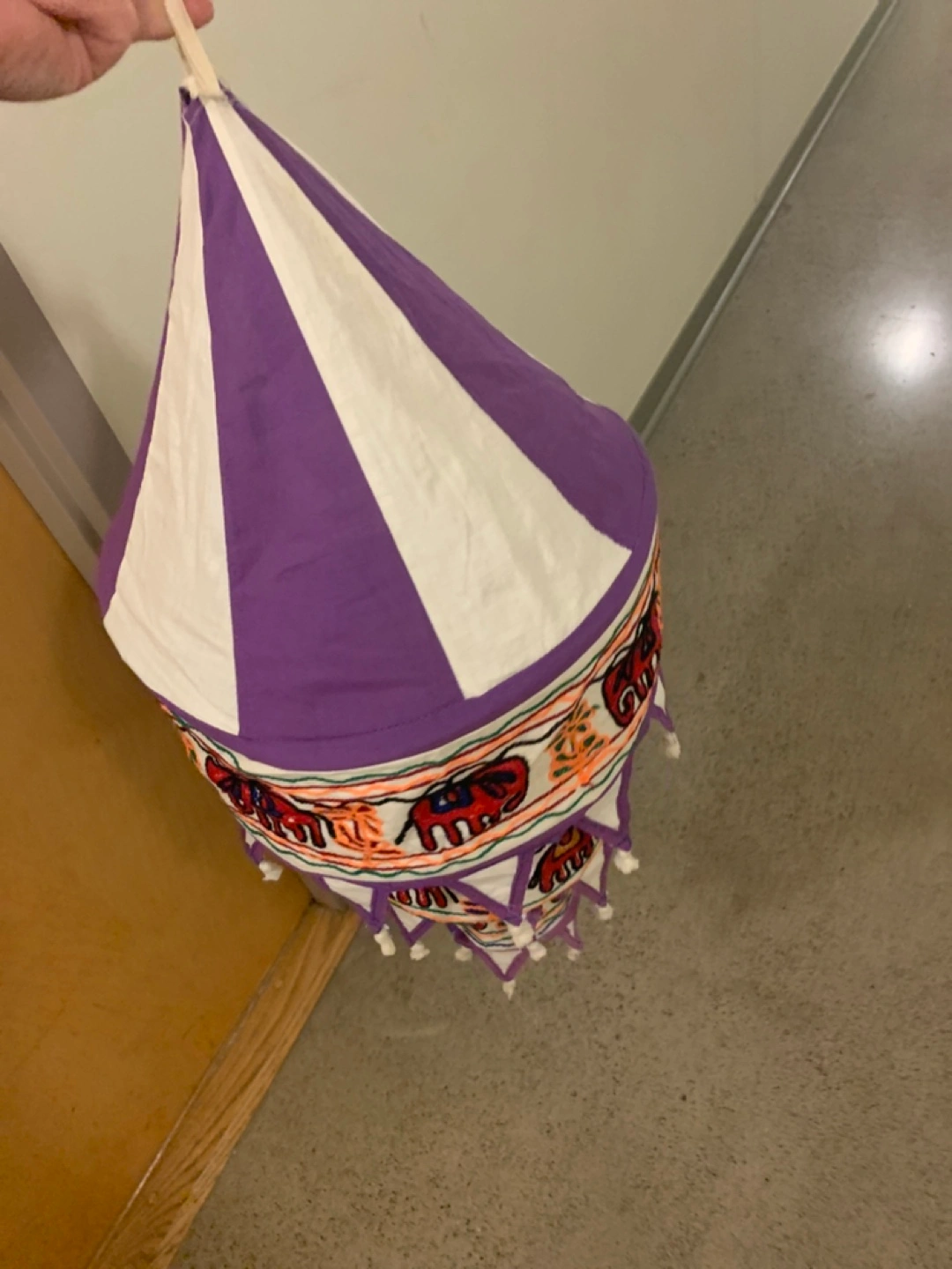 This is a unique, vintage-style hanging lamp shade. It features a purple and white design with elephant embroidery. It would be a great addition to any room!