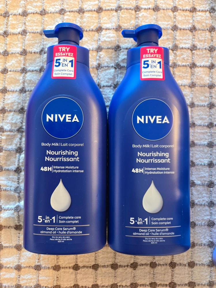 two bottles of Nivea Nourishing Body Milk, each containing 625ml. This body milk provides intense moisture for 48 hours and is enriched with Deep Care Serum and almond oil. It's designed for dry to very dry skin, offering complete care in one application