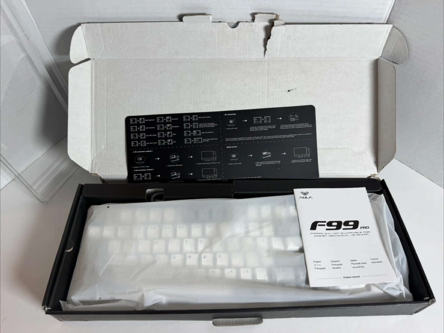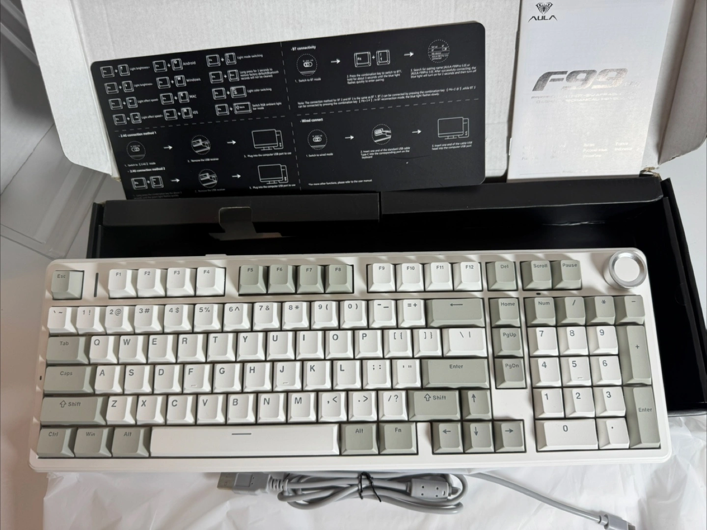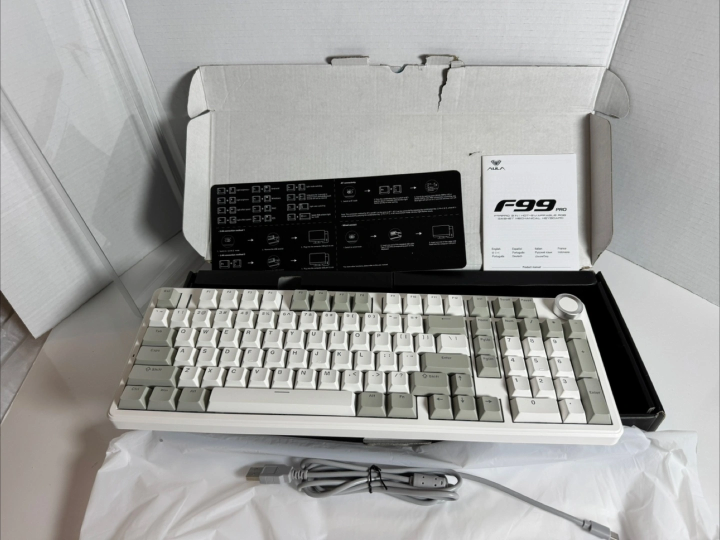 AULA F99 Pro mechanical keyboard in white & Grey. - USB, BT, Wired, and 2.4G connectivity - Includes the box and charging cable