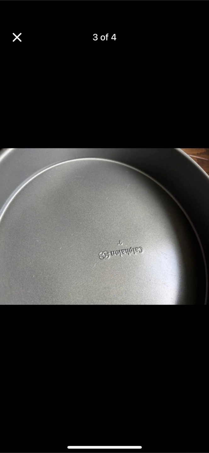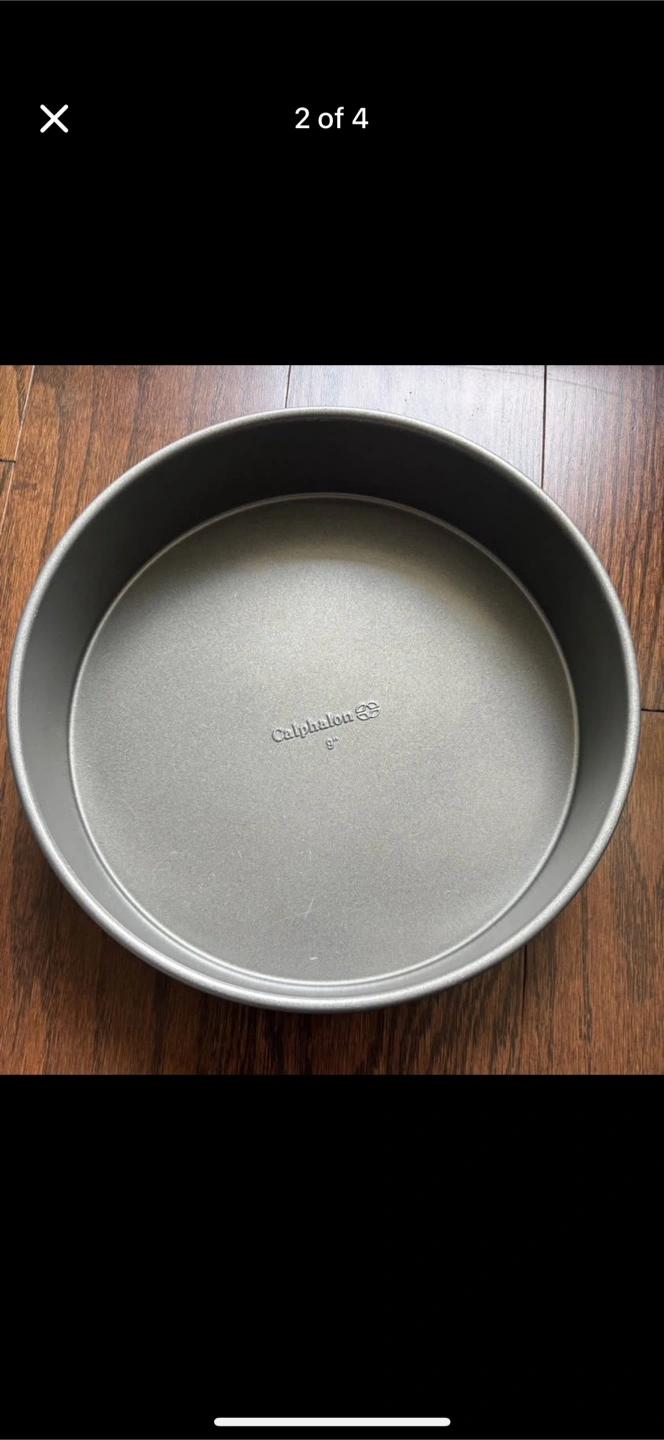 Calphalon Nonstick Bakeware, Round Cake Pan, 9-inch Dimensions: 9 x 2 inch Condition: Excellent No dents, only minor scratches (as seen in pics). Non-stick coating intact. Location: Bloor & Jane "From a smoke and pet free home"