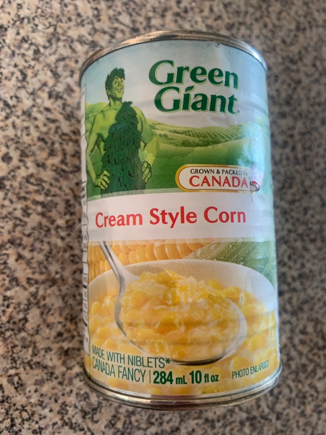 a can of Green Giant Cream Style Corn! It's grown and packed in Canada. Perfect for adding a touch of sweetness to your meals. The can contains 284 mL (10 fl oz). The expiry date is 2028 September 01, so you have plenty of time to enjoy it
