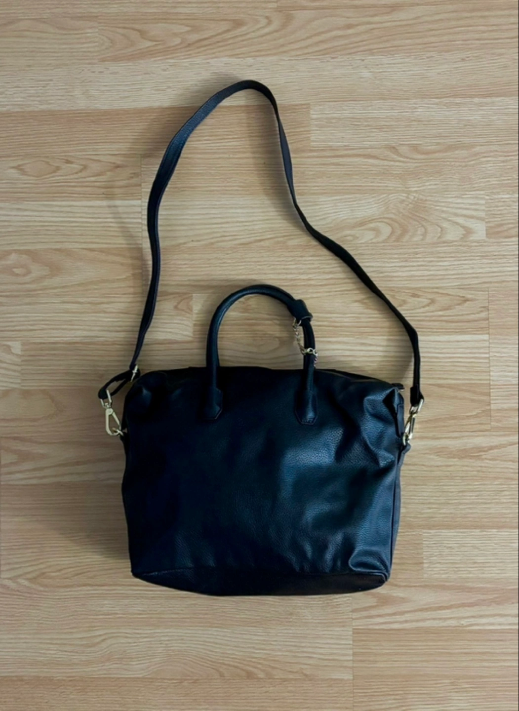 Here's a stylish black tote bag from H&M! It's a great size for everyday use, with both handles and a shoulder strap for versatile carrying options. The material is durable and the interior is spacious. New without tags. Regular price $45