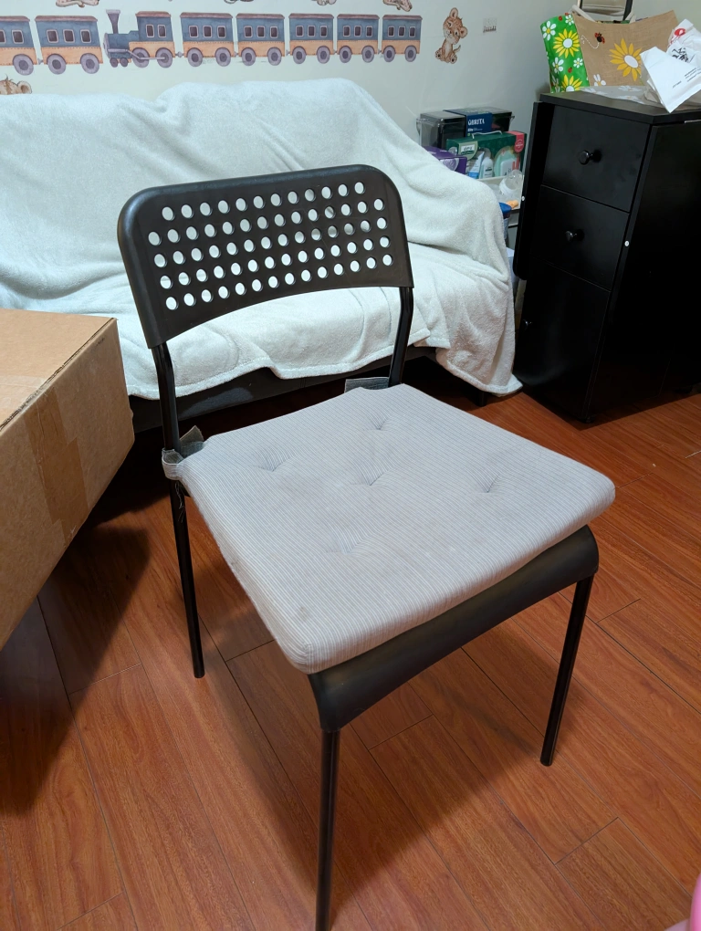 Selling a gently used IKEA Adde chair! It features a black frame and a comfortable grey cushion. Perfect for adding extra seating to your dining area or workspace. The chair is in good condition and ready for a new home!