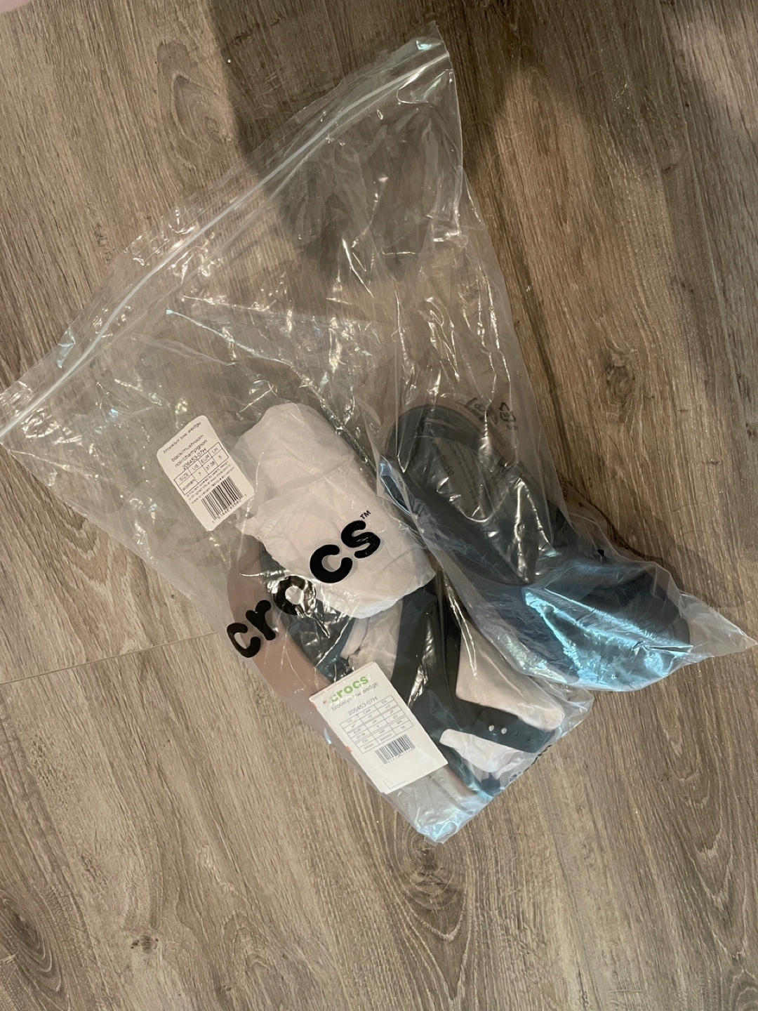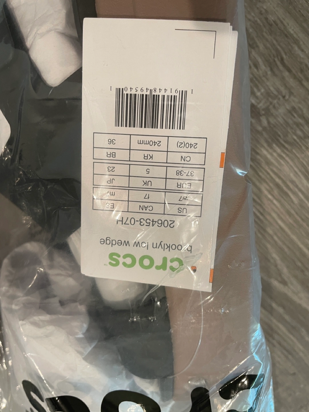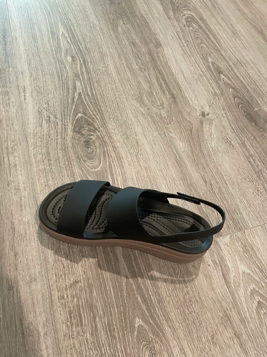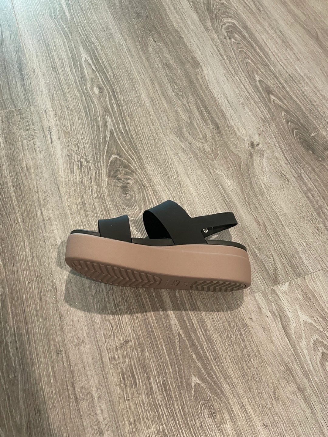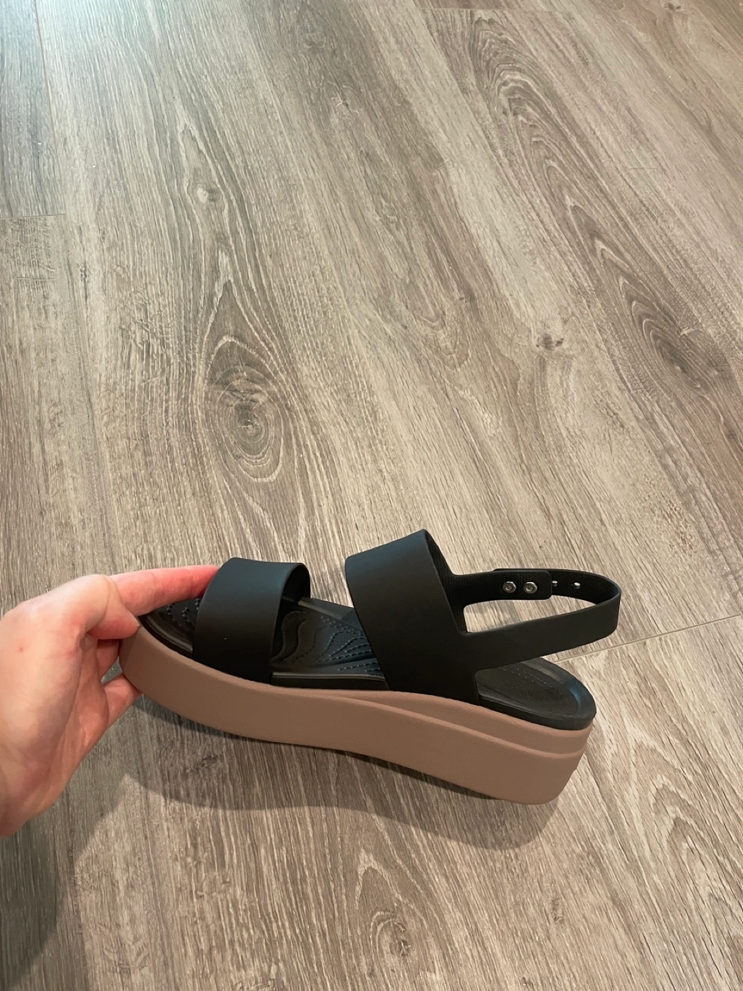 Selling a pair of Crocs Brooklyn Low Wedge sandals in black and mushroom colour! They are size US 7. Comes with original packaging. New item never used!