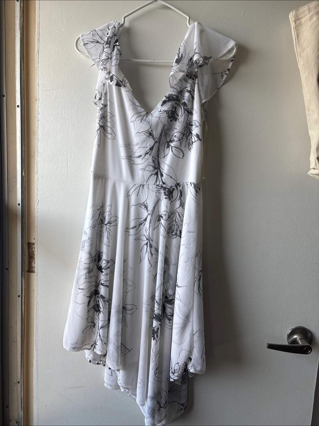 Selling a lovely Le Chateau dress in a size P/S. It's white with a beautiful floral pattern. Perfect for a special occasion or just feeling fancy!