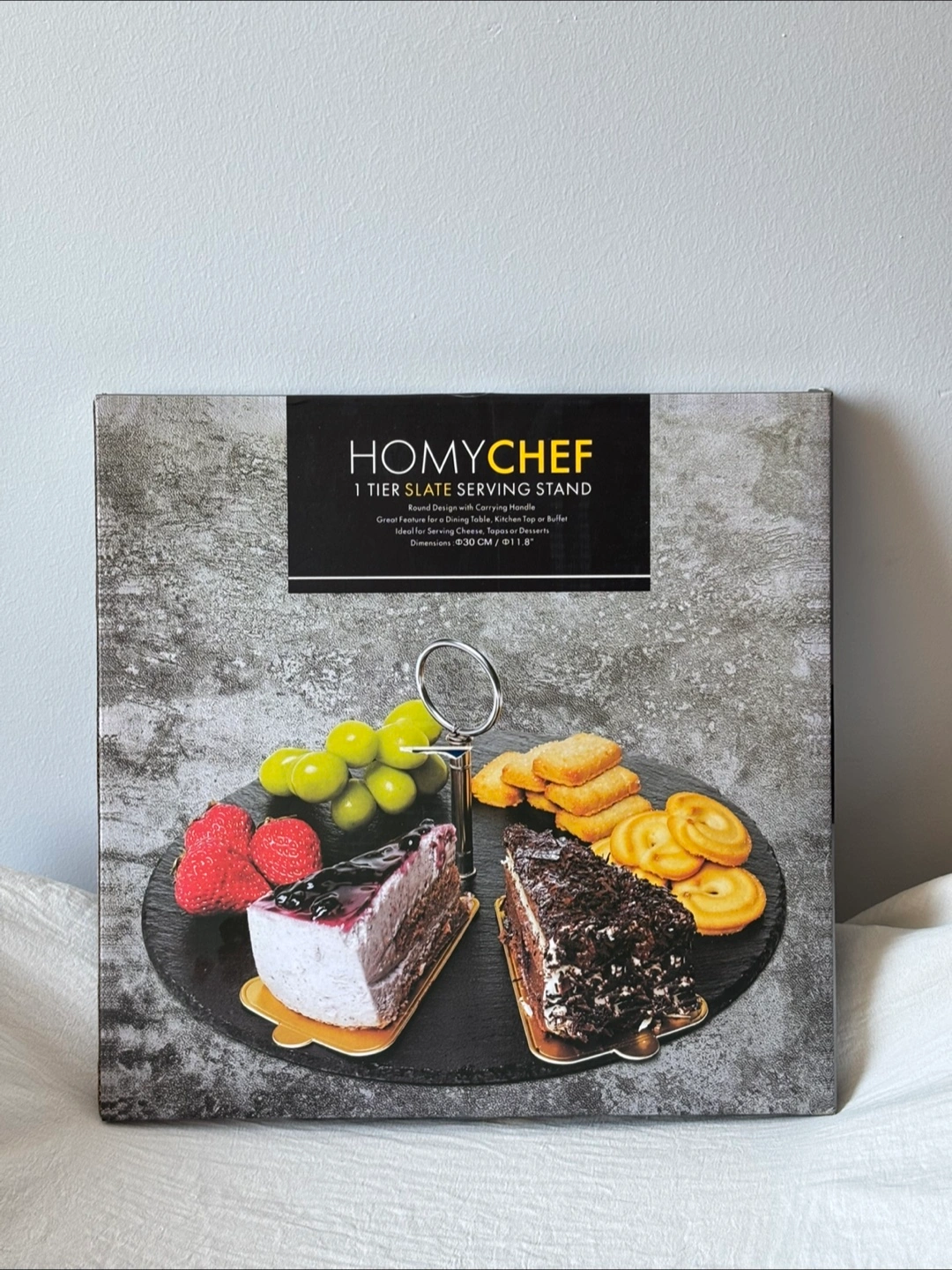 Selling a HOMYCHEF 1 tier slate serving stand! It has a round design with a carrying handle, making it a great feature for a dining table, kitchen top, or buffet. Ideal for serving cheese, tapas, or desserts. Dimensions: 30 cm / 11.8" ✅Willing to meet-up halfway for purchase over $50 ✅Check out my other listing (all clothes for $5 | Baby Stuff on SALE | Home & Kitchen) ✅Pick-up and cash only