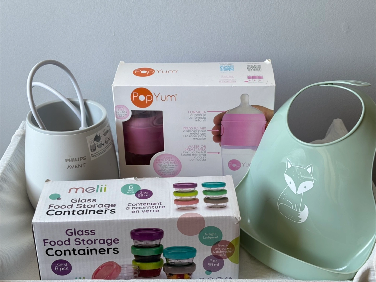 Selling a baby bundle with a variety of useful items! Included are: - Philips Avent bottle warmer - PopYum 9oz/260ml bottle - Melii Glass Food Storage Containers (set of 6, 2oz/59ml each), airtight and leakproof, freezer, microwave, and dishwasher safe ❤️FREE❤️ - A cute bib with a fox design ✅Willing to meet-up halfway for purchase over $50 ✅Check out my other listing (all clothes for $5 | Baby Stuff on SALE | Home & Kitchen) ✅Pick-up and cash only