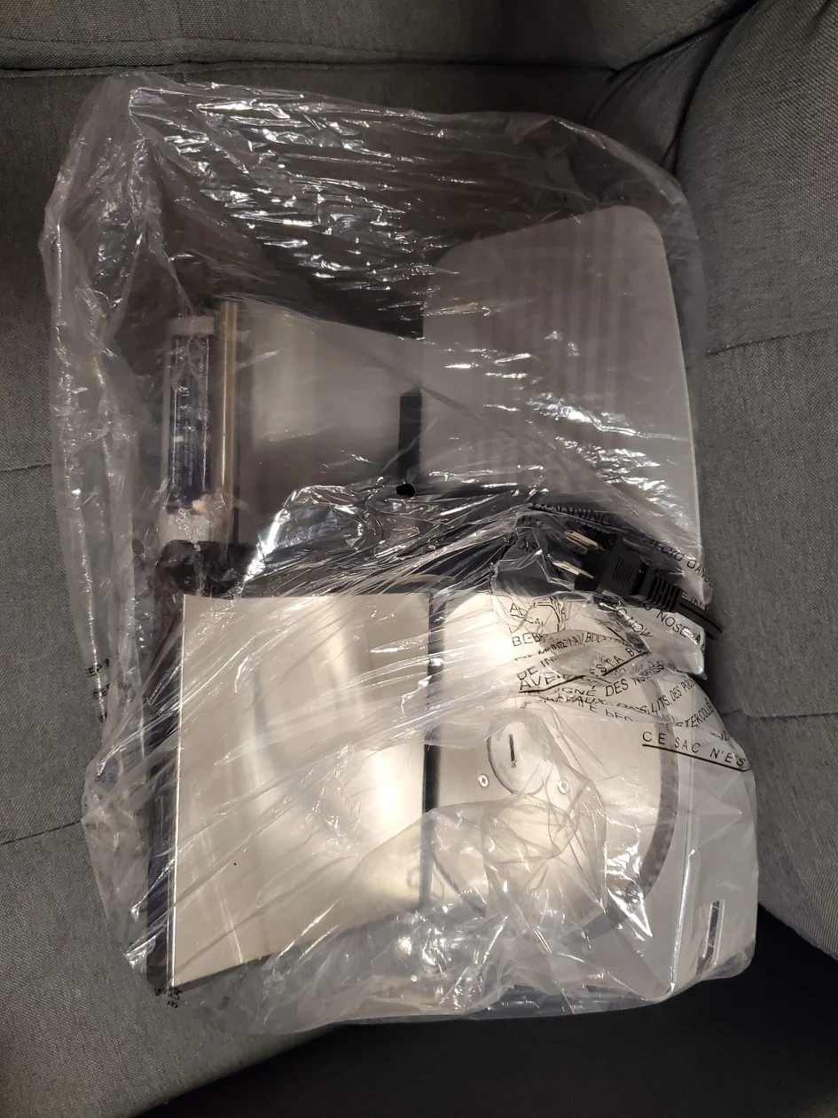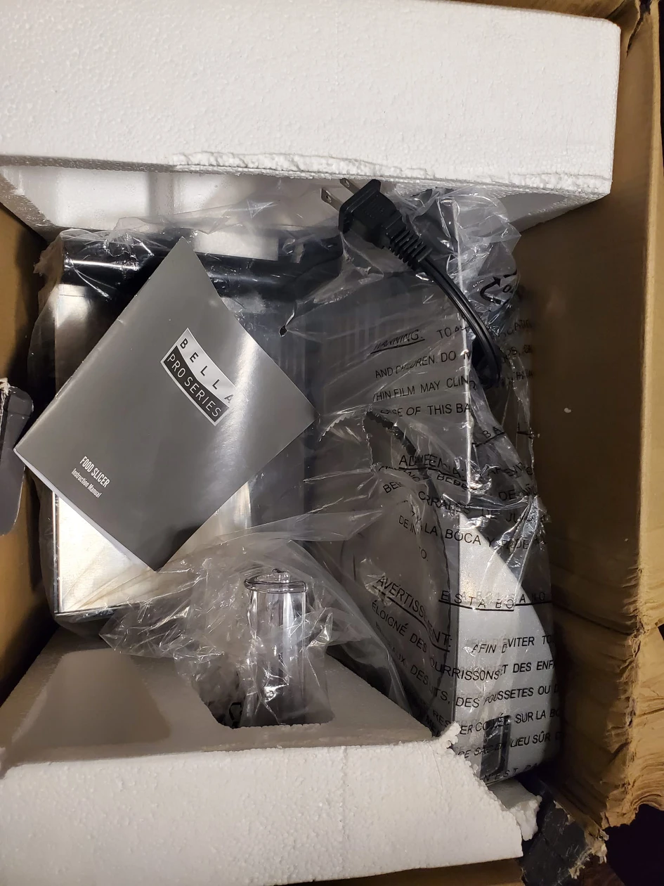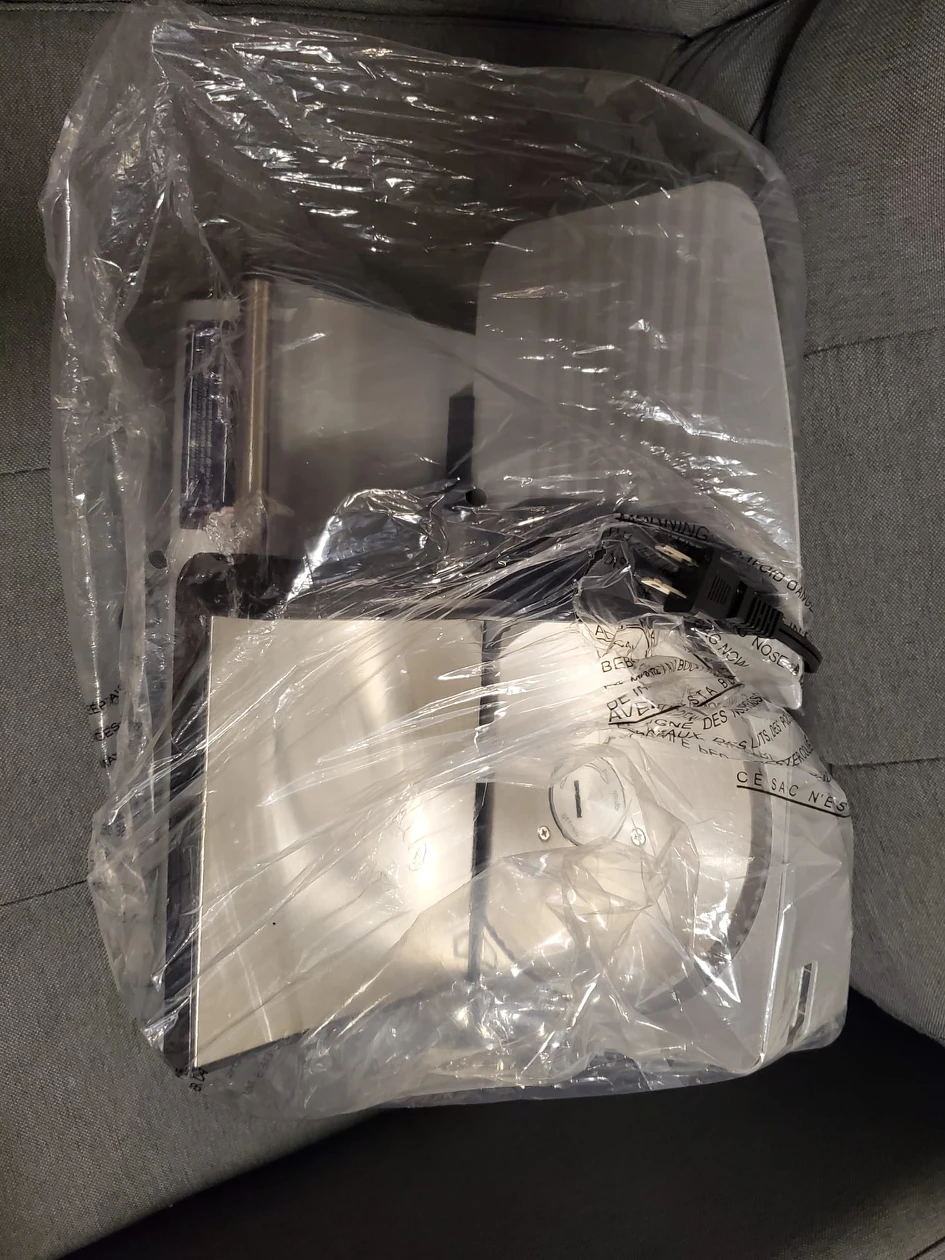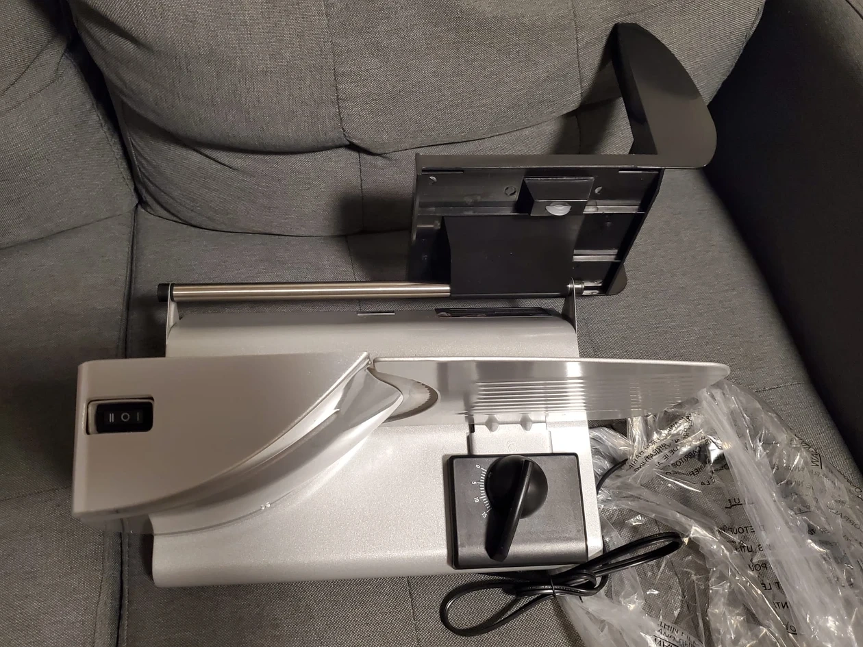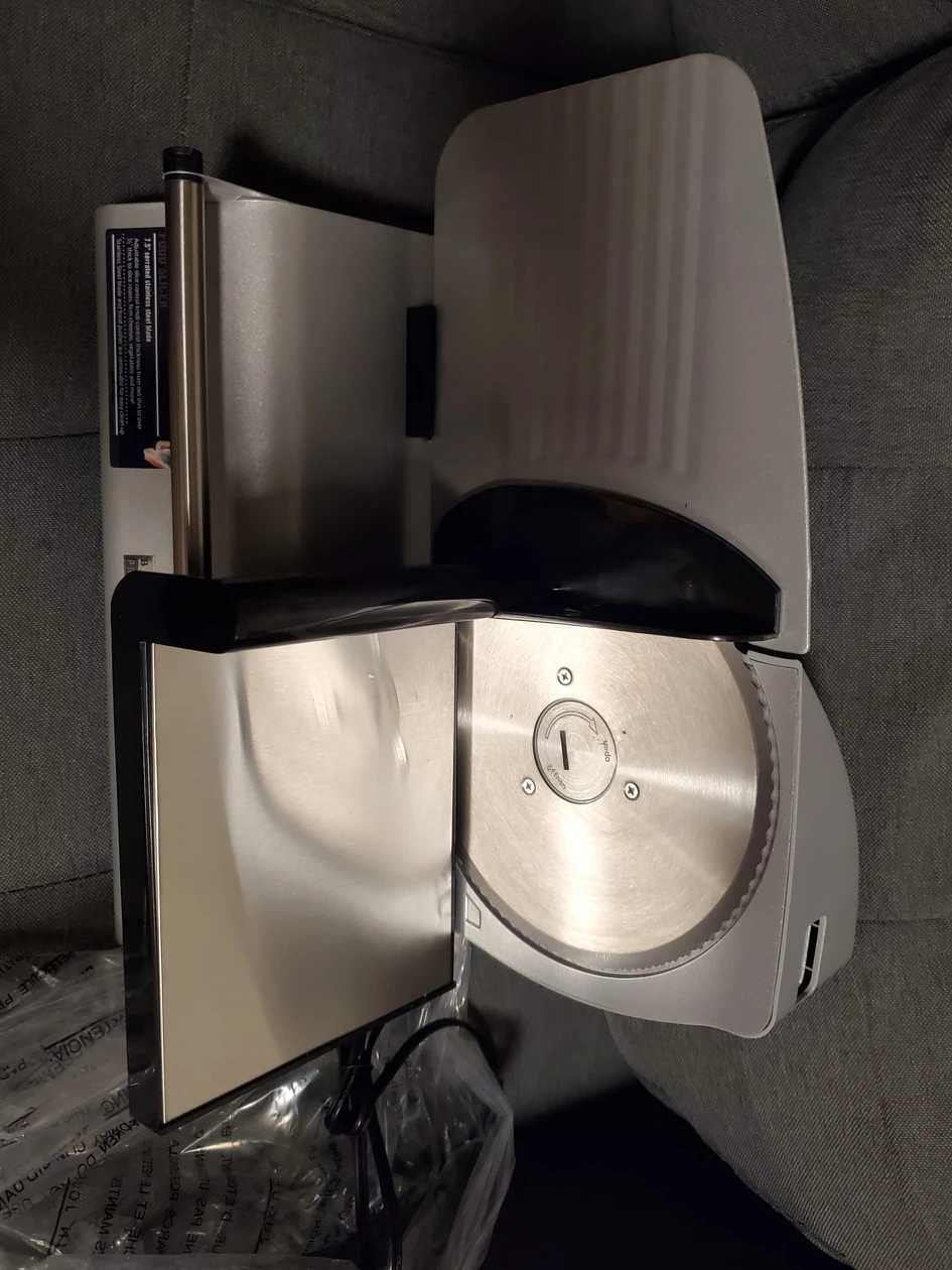 Powerful 7.5" serrated stainless steel blade Adjustable slice control knob Stainless steel blade Food pusher with teeth to secure food in place while slicing Suction cup feet secures meat slicer to countertop adding stability while slicing Pick up location downtown toronto
