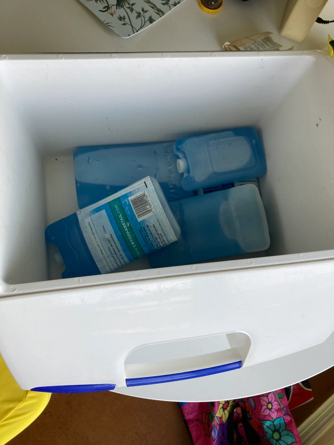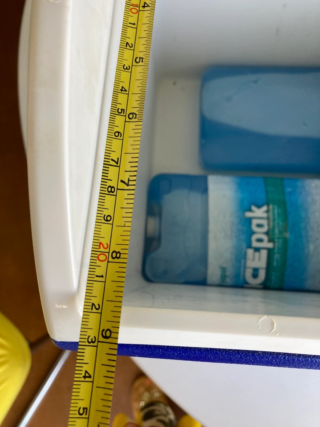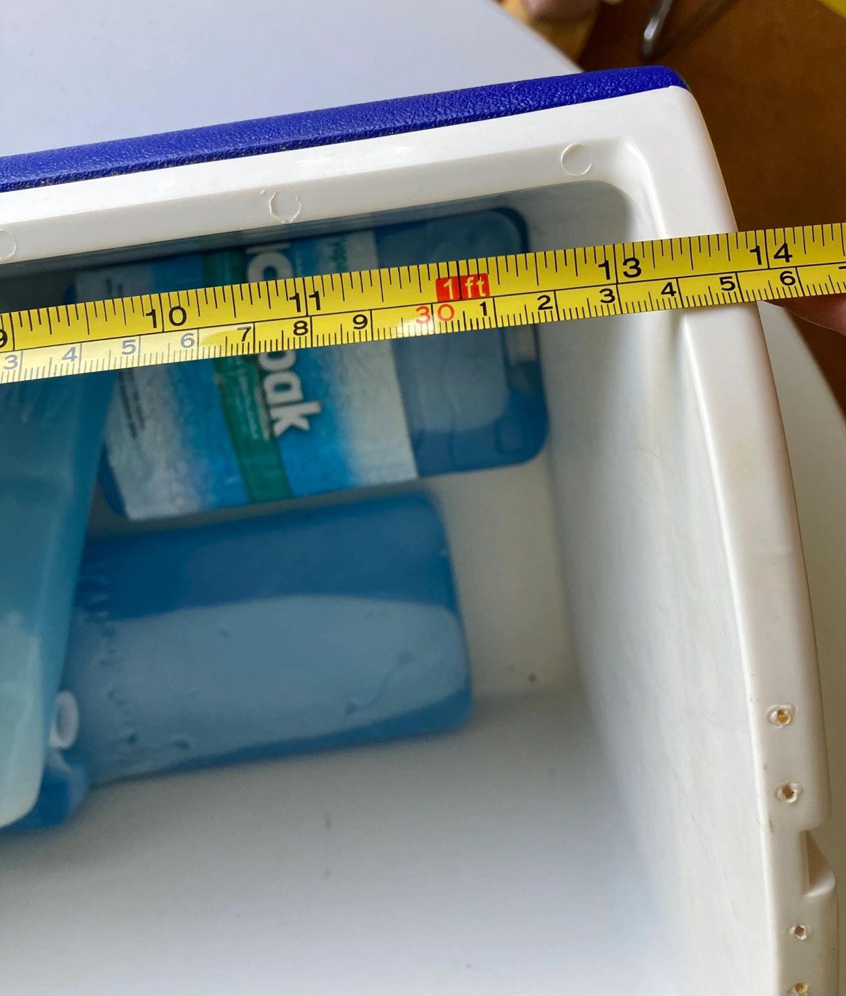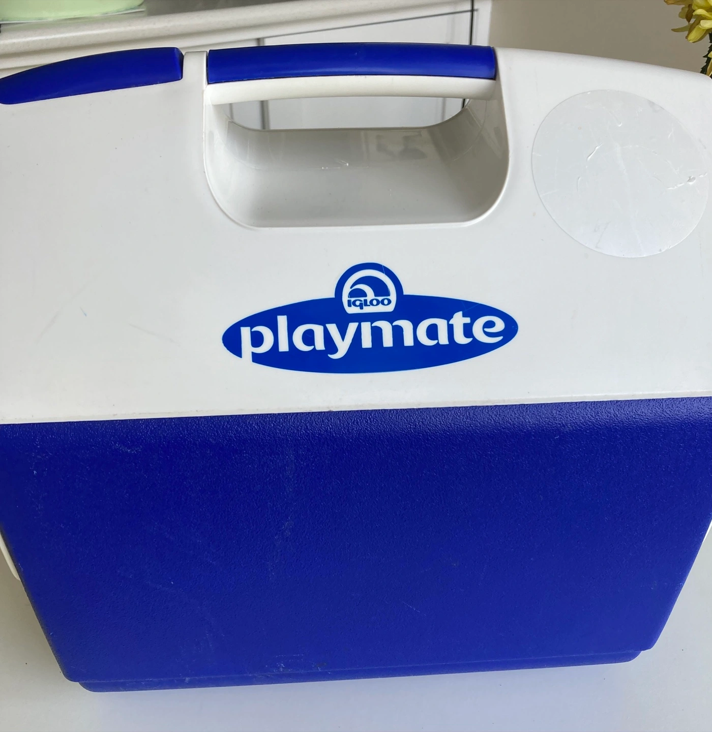 Selling an Igloo Playmate cooler in blue and white! It's in great shape and ready to keep your drinks and snacks cool on the go. The cooler measures approximately 14 inches in length and 9 inches in height 9” deep. 5 dry ice packages included