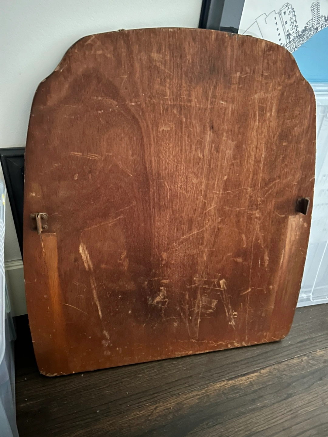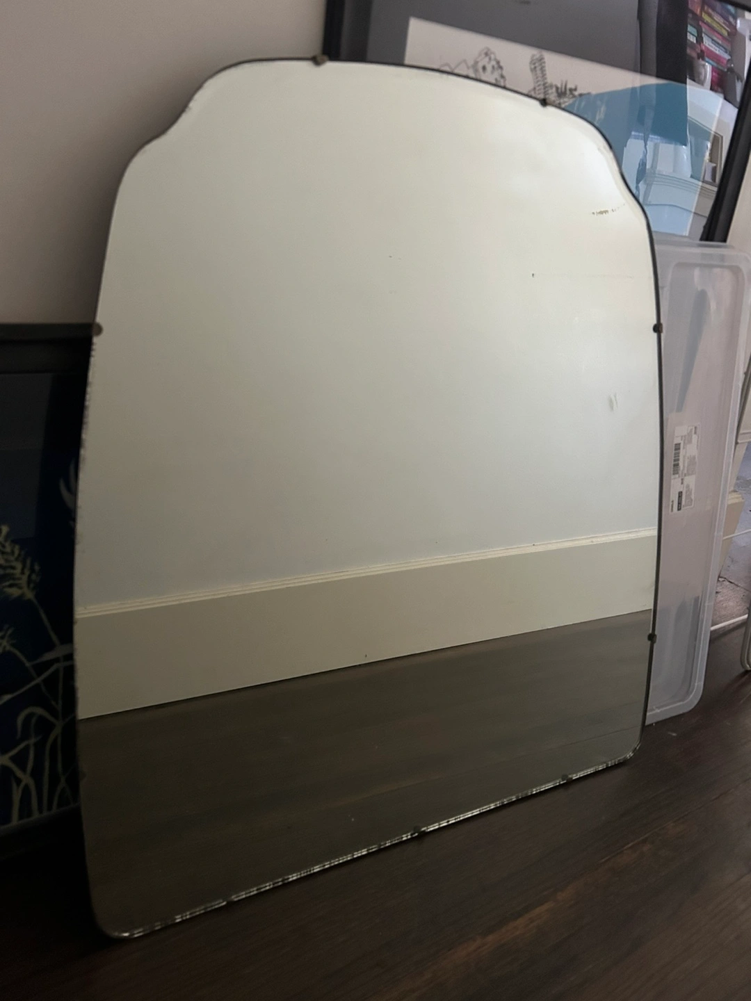 In excellent used condition, this mirror is about 70 yrs old. Bought as a project with the intention of refinishing the wood and using it as a mirror above a dresser. Years have passed and ideally don't want to move the mirror again. The glass is thick on proper wood. A light sanding and restain is all that would be needed to perfect the back. A bit of polish to the metal attachments should be all that is needed.