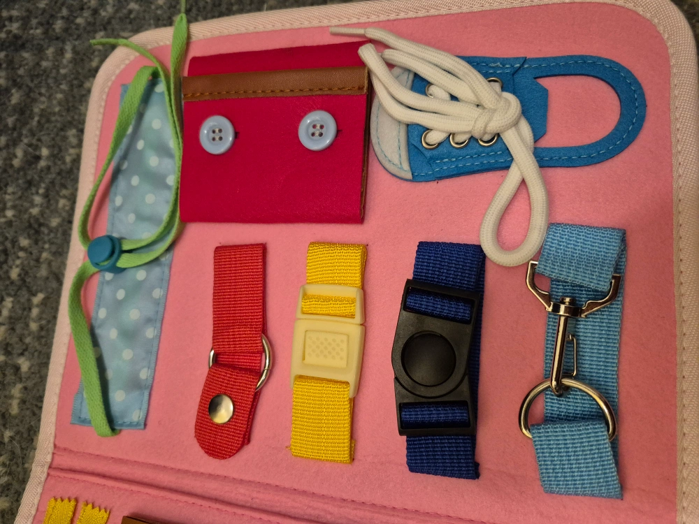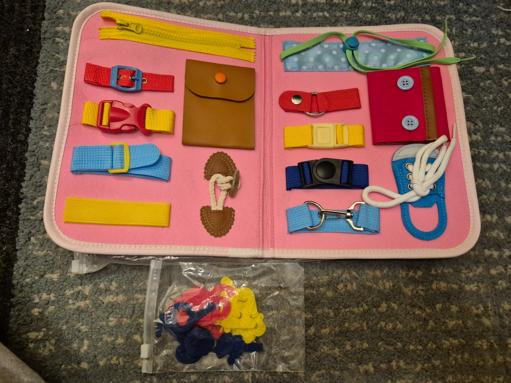 This busy board is great for toddlers who are learning to develop fine motor skills. It has a variety of activities including zippers, buttons, buckles, and snaps. It also comes with a bag of extra pieces. It's in great condition and ready for a new home!
