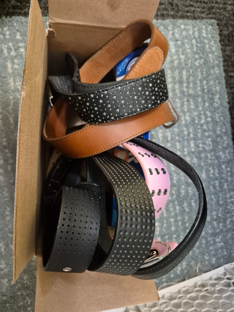 Selling a collection of assorted belts! There's a variety of styles and sizes, including a black belt with star details and a classic brown leather belt. Perfect for adding some flair to your outfits 5 dollars a belt. deal for lot or more