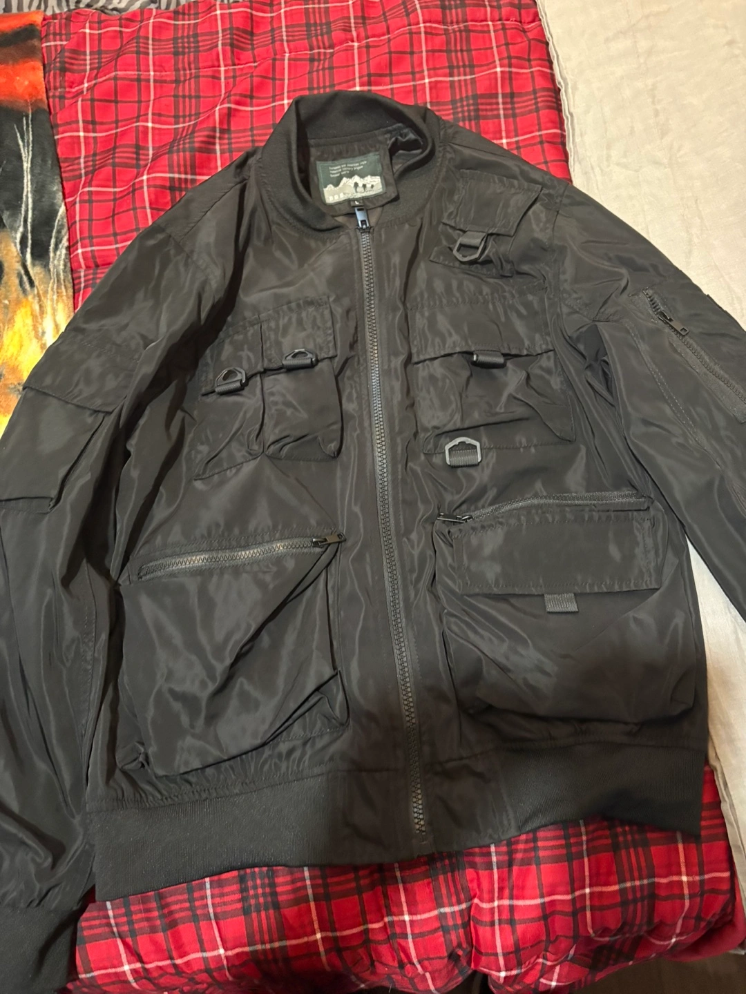 Selling a black bomber jacket with lots of pockets. Good for tactical jobs sports outdoors jobs It's in great condition and ready for a new home!