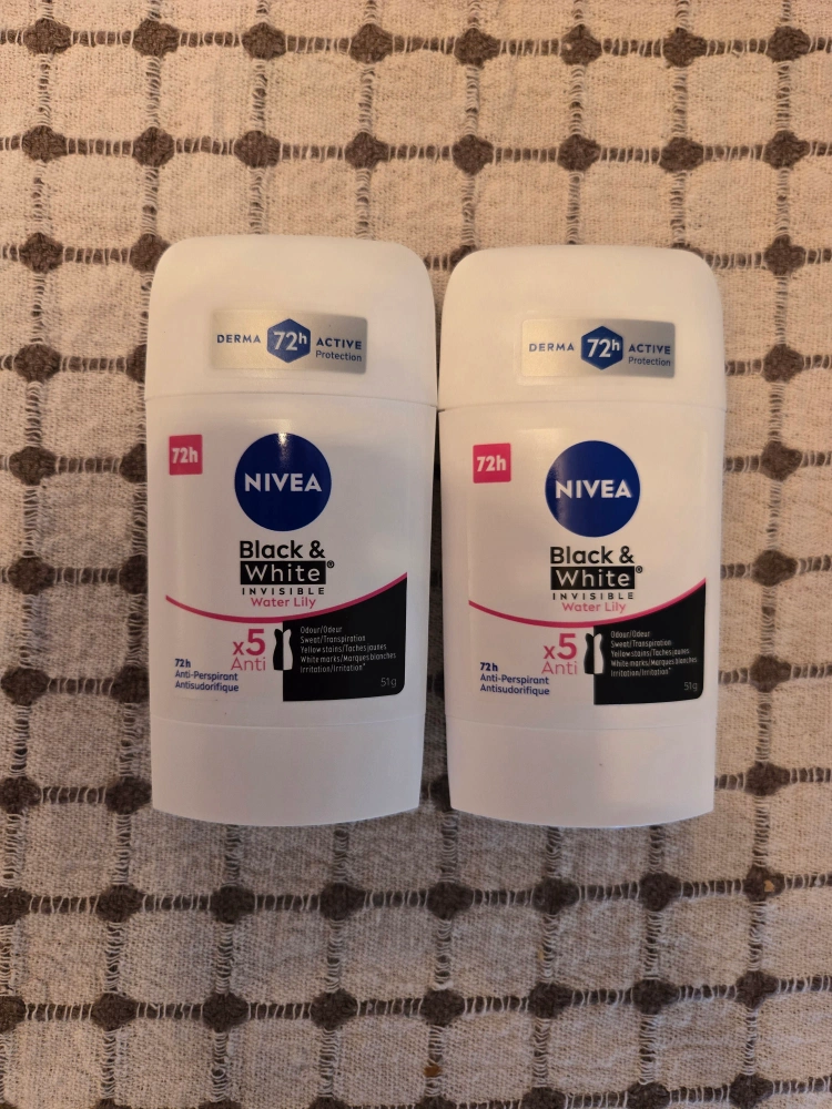 Selling two Nivea Black & White Invisible Water Lily antiperspirant sticks! They provide 72h active protection and are designed to prevent odour, sweat, yellow stains, white marks, and irritation. Each stick contains 51g of product.
