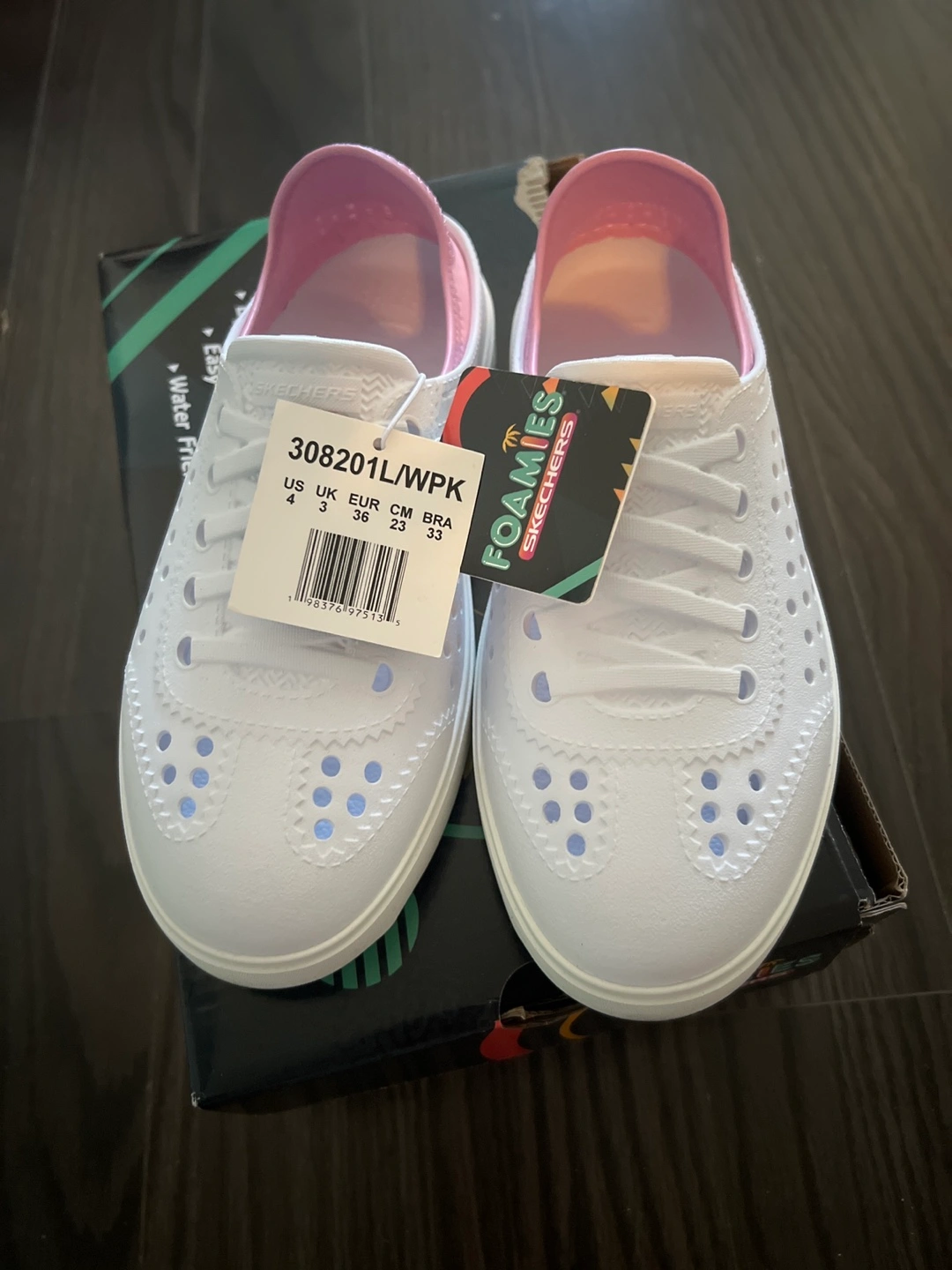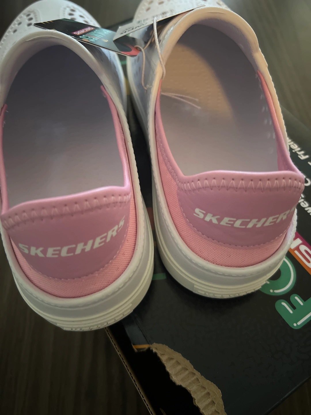 These Skechers Foamies Breezy Steps clogs are brand new in box! They're a women's size US 4. The colour is white with a pink trim. They are lightweight and machine washable too!