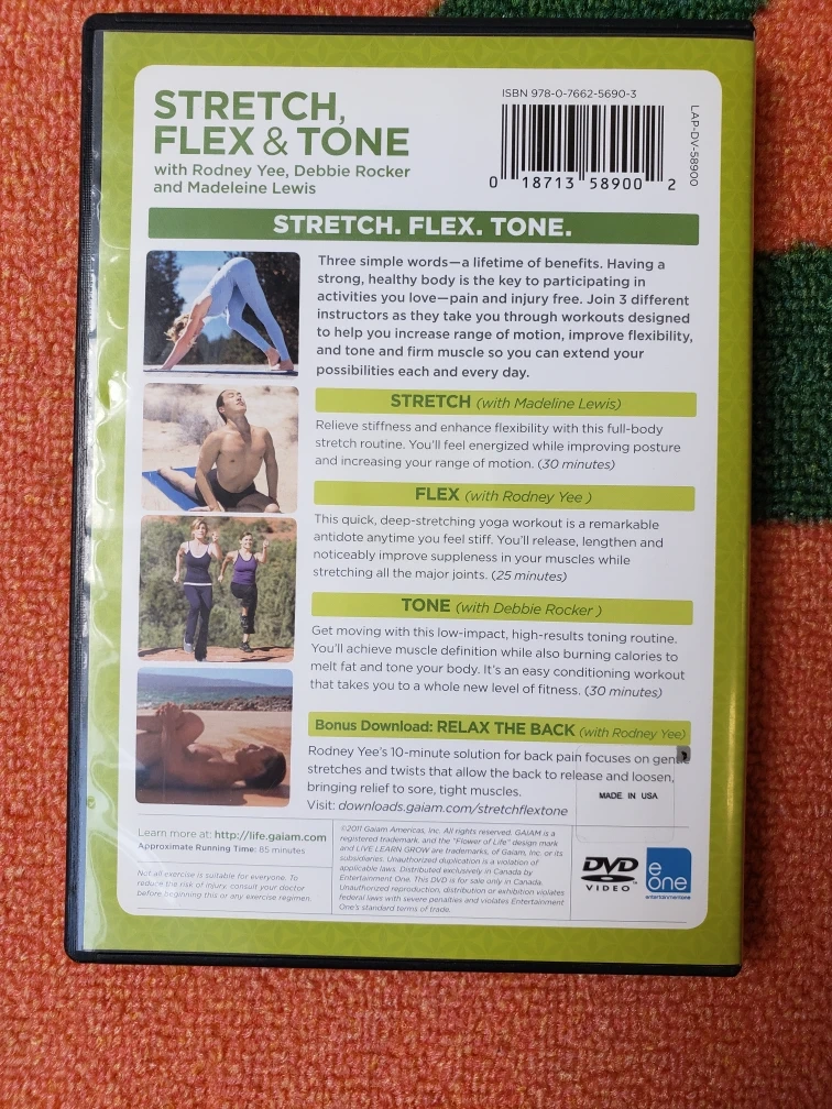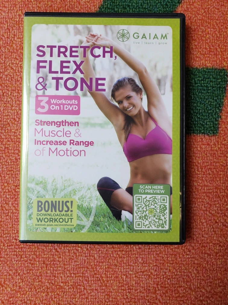 Looking to strengthen muscles and increase your range of motion? This Gaiam Stretch, Flex & Tone DVD includes 3 workouts on 1 DVD. It also has a bonus downloadable workout!