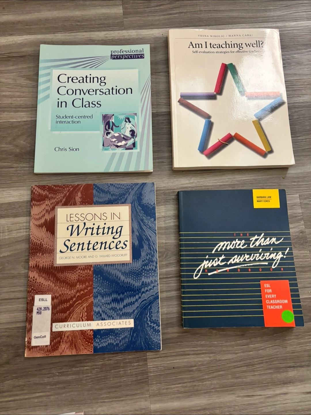 Selling a set of ESL teacher books, perfect for classroom resources! Includes: - Creating Conversation in Class by Chris Sion - Am I Teaching Well? by Vesna Nikolic & Hanna Cabaj - Lessons in Writing Sentences by George N. Moore & G. Willard Woodruff - The More Than Just Surviving! Handbook by Barbara Law & Mary Eckes