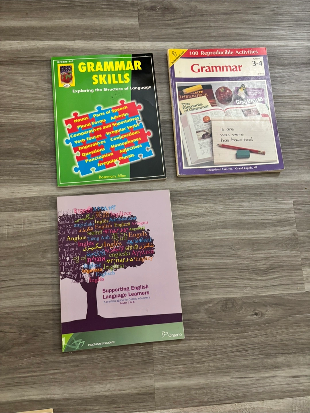 Selling a set of grammar and language learning books! Includes 'Grammar Skills Exploring the Structure of Language' for grades 4-5, '100 Reproducible Activities Grammar' for grades 3-4, and 'Supporting English Language Learners' for grades 1 to 8
