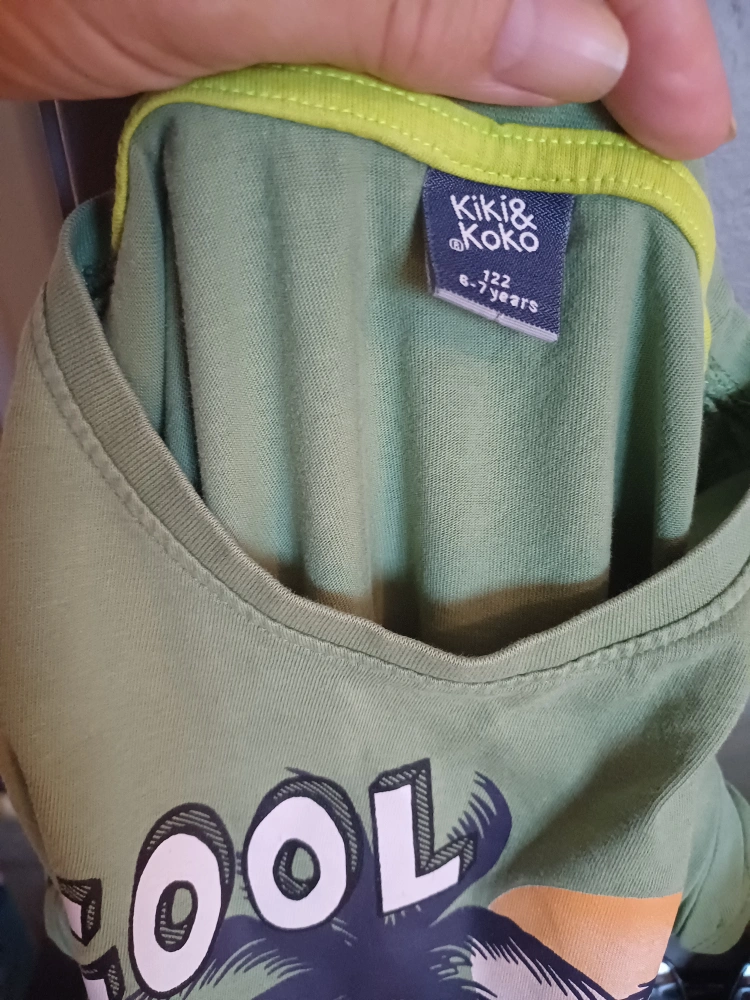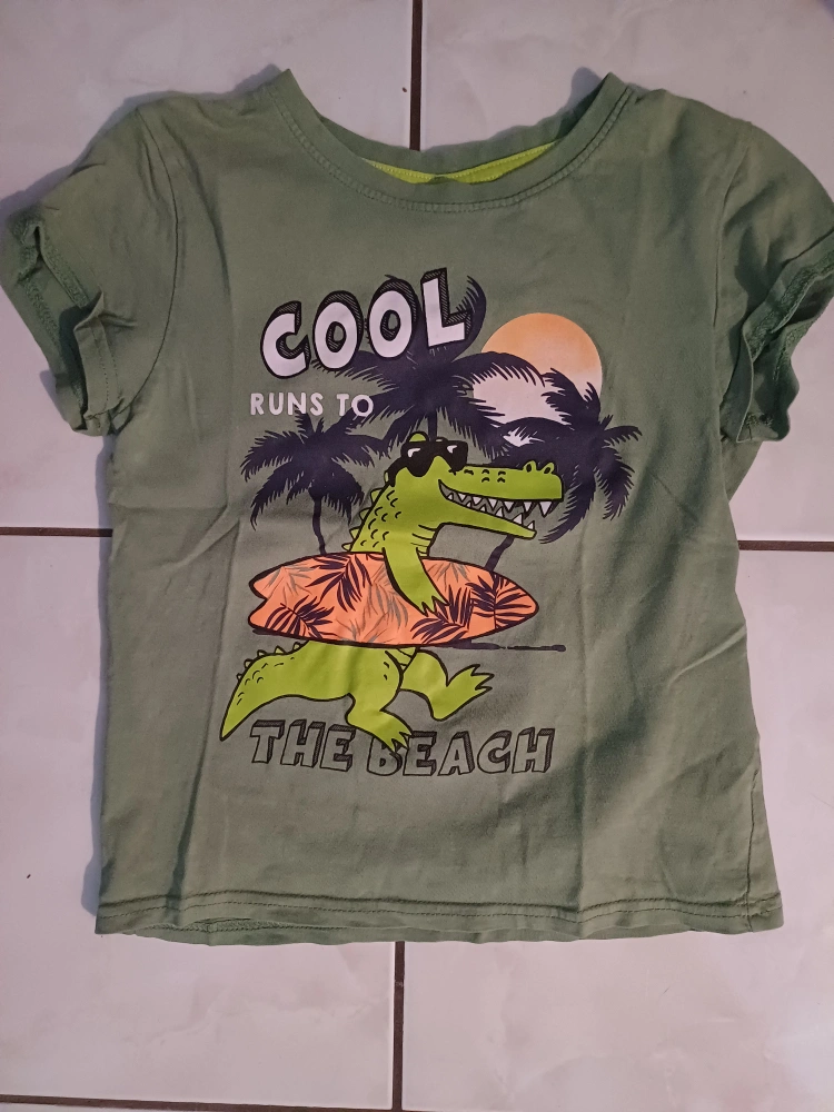 Free: Cute Kiki&Koko t-shirt for kids aged 6-7 years! It's green with a fun alligator design that says 'Cool Runs to the Beach'.