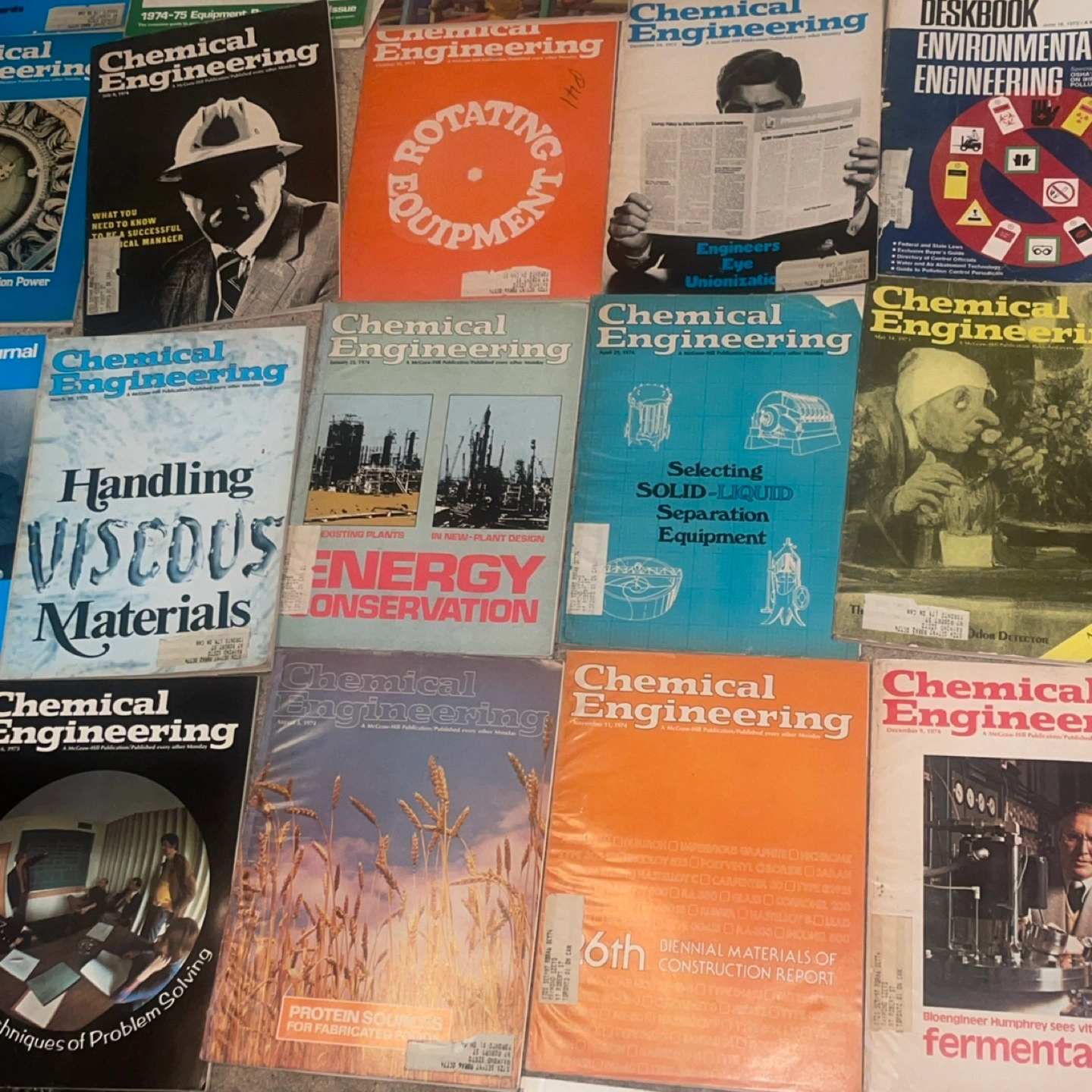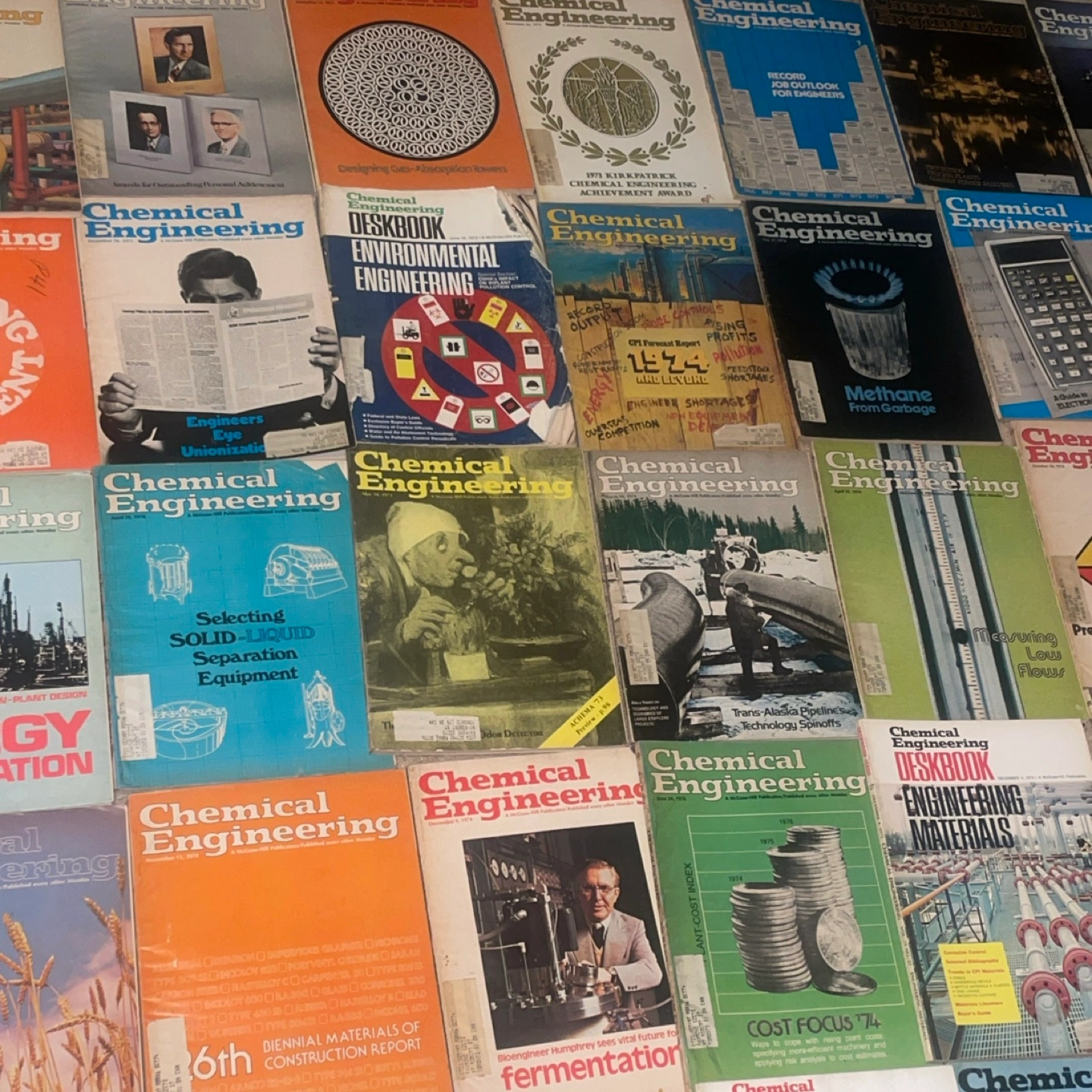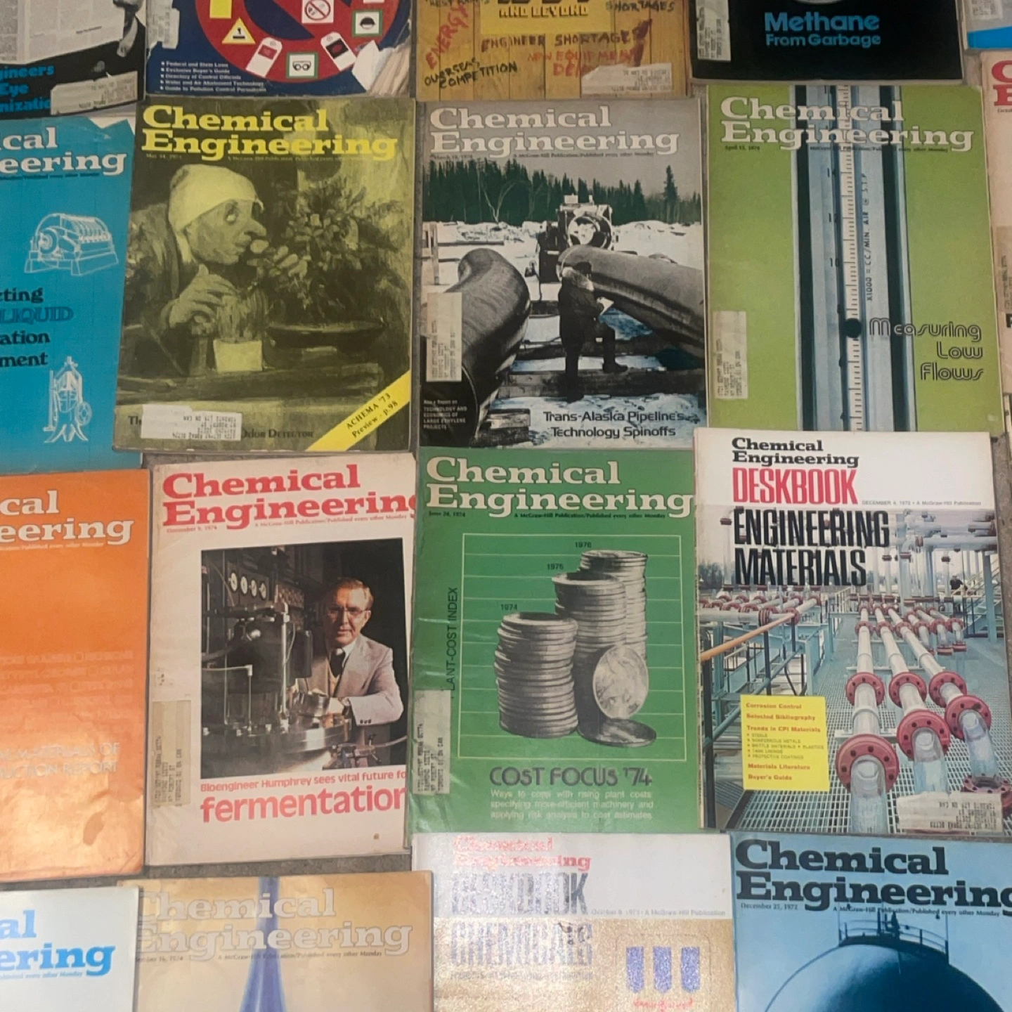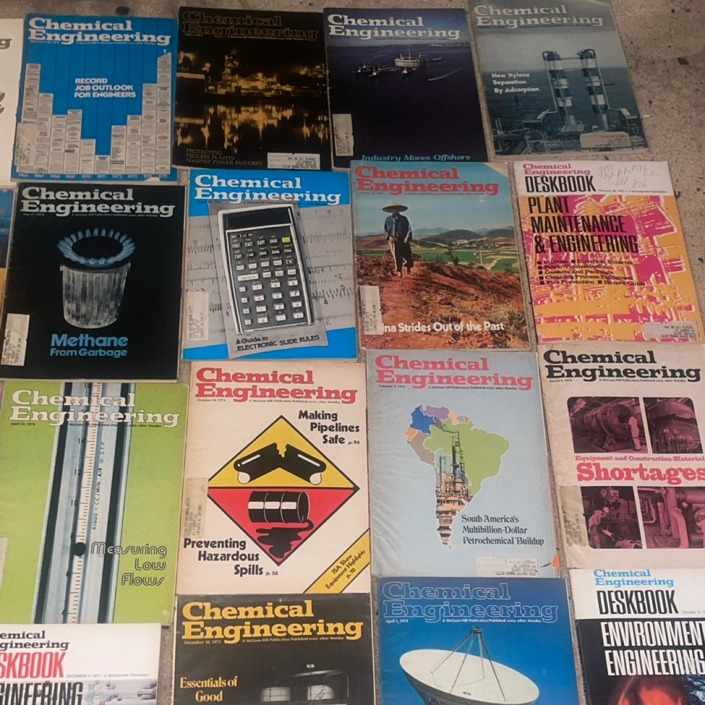 A collection of vintage Chemical Engineering magazines, perfect for collectors or anyone interested in the history of chemical engineering. All from the 70s. 62 issues total