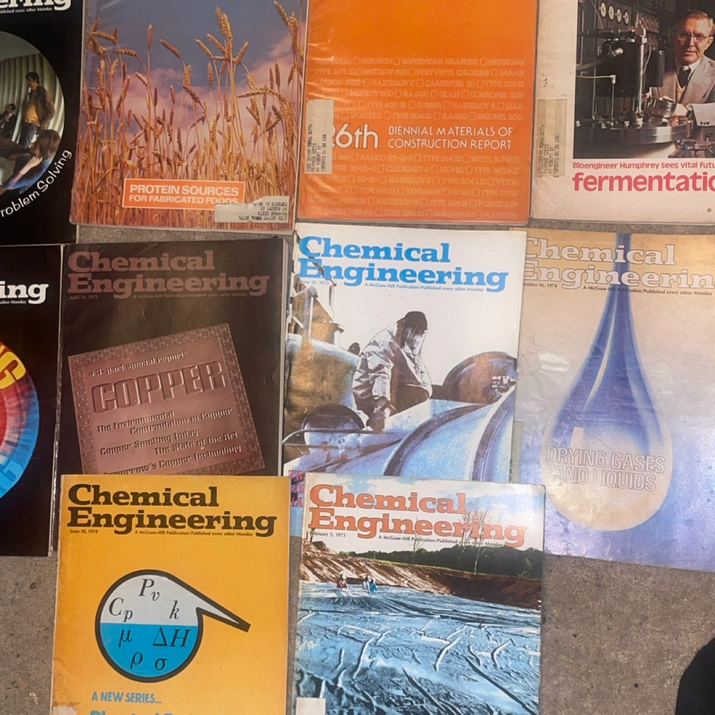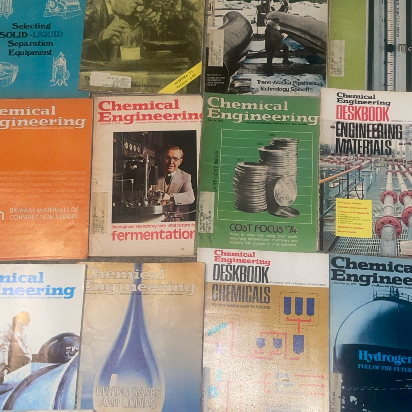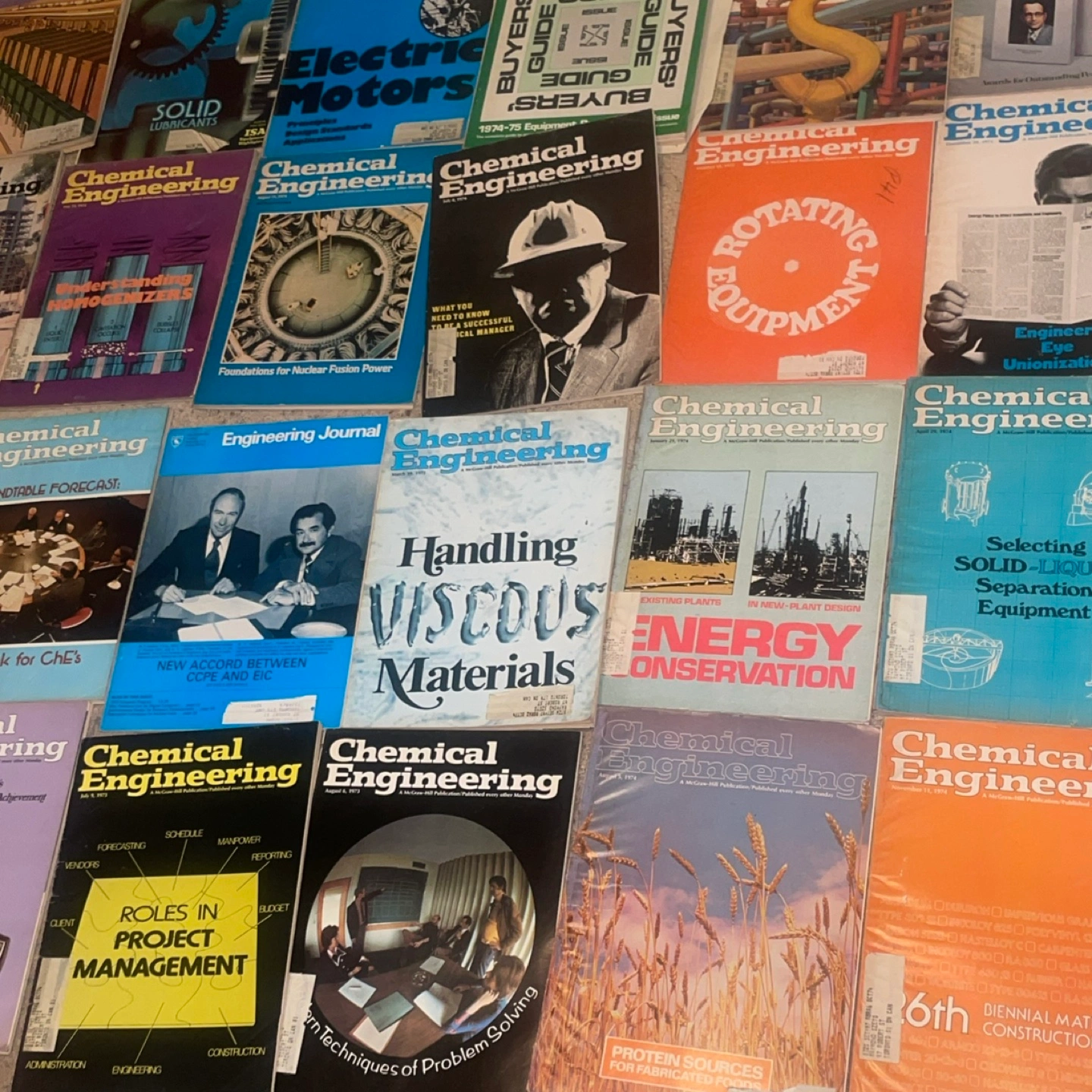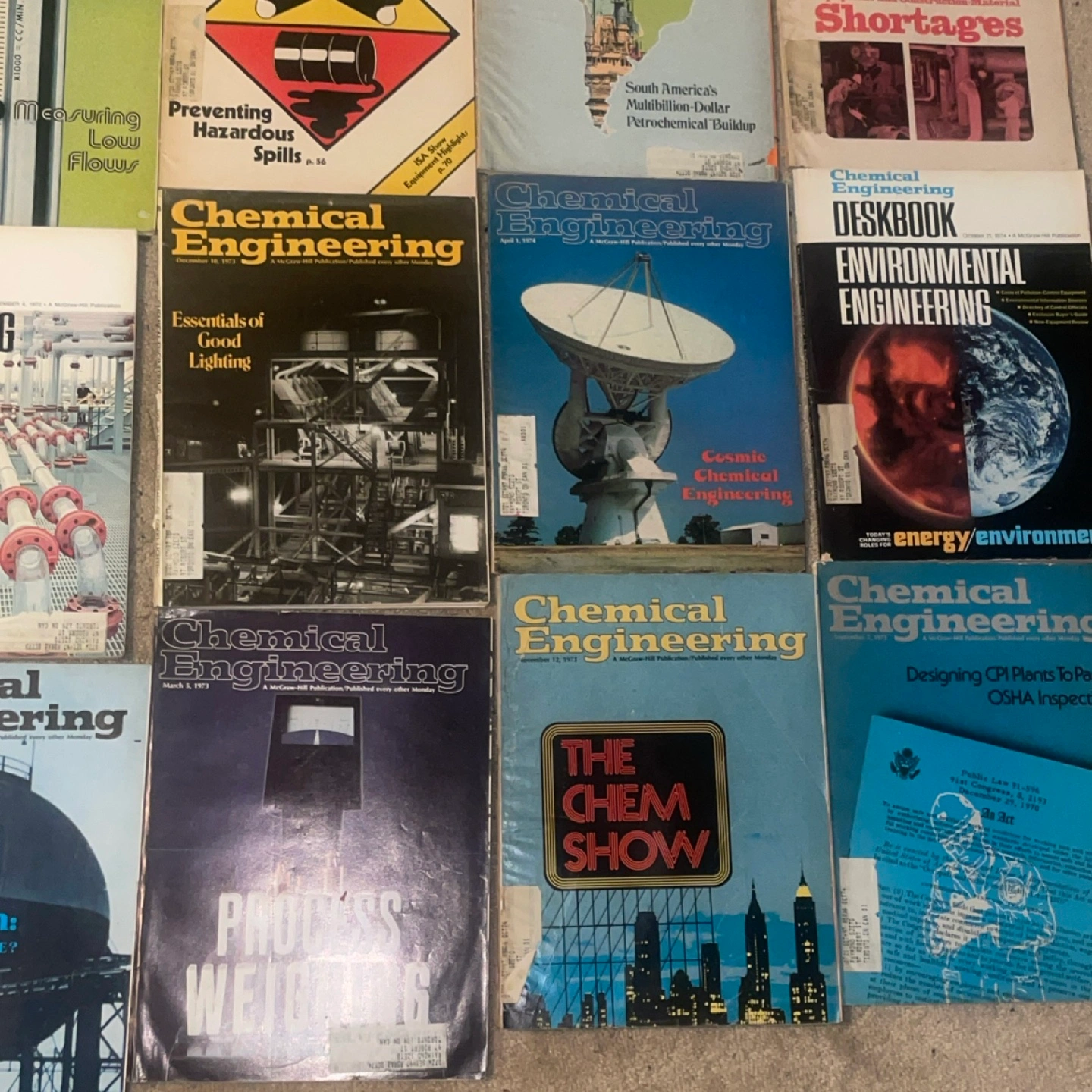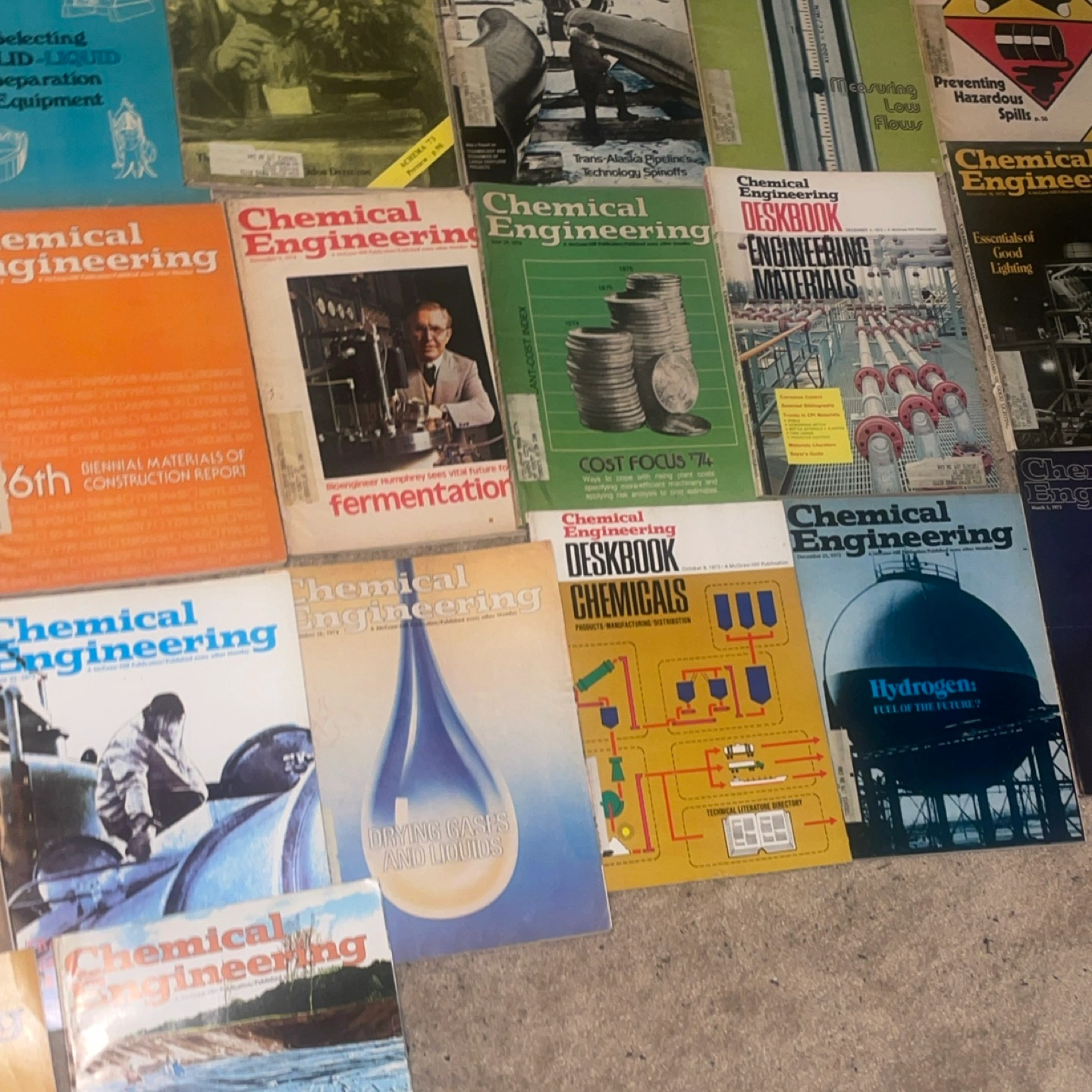 A collection of vintage Chemical Engineering magazines, perfect for collectors or anyone interested in the history of chemical engineering. All from the 70s. 62 issues total