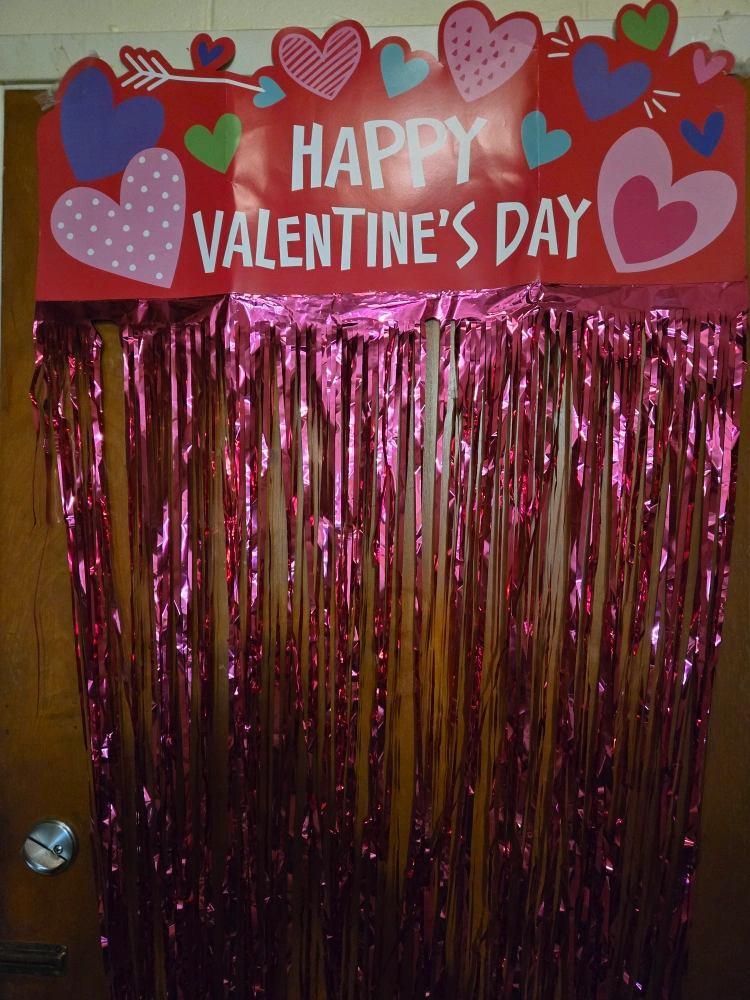 Get ready for Valentine's Day with this fun decoration! It features a 'Happy Valentine's Day' message with heart accents and a shiny pink fringe backdrop. Perfect for adding a festive touch to your celebration