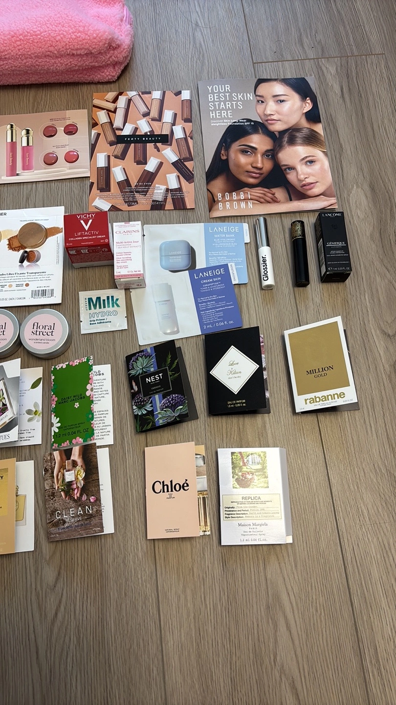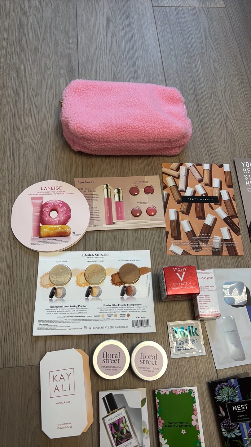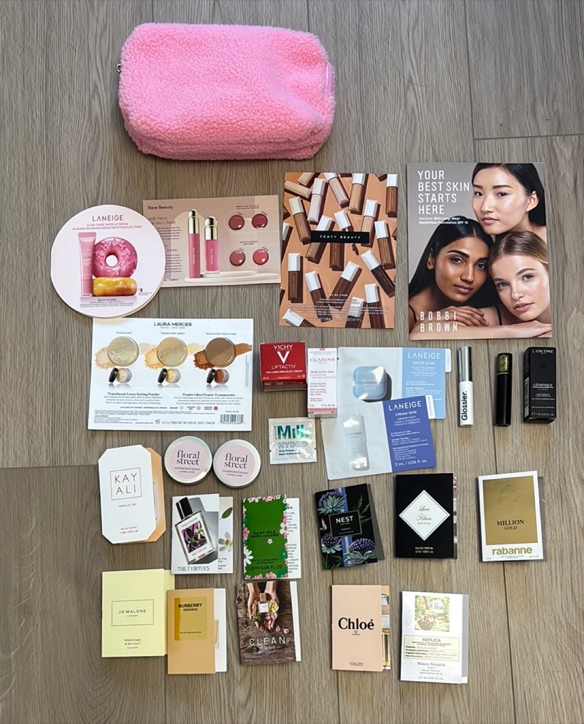 The bundle includes: 11 perfume samples 2 floral street mini scented candles 7 make up samples (foundation, concealer, lip serum, mascara etc) 6 skincare samples (Lancôme Génifique serum, Laneige tinted lip serum etc) 1 new fluffy makeup bag