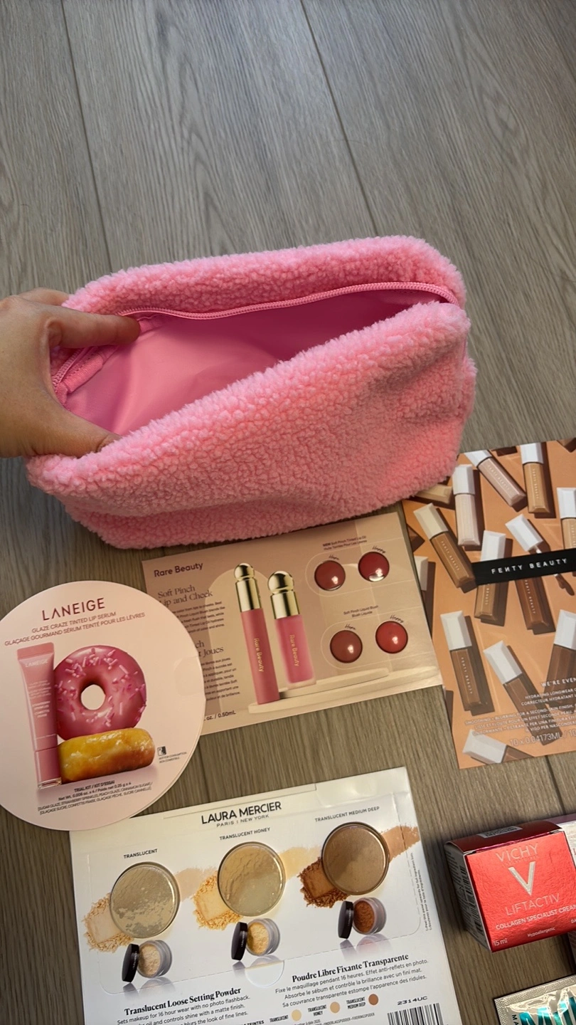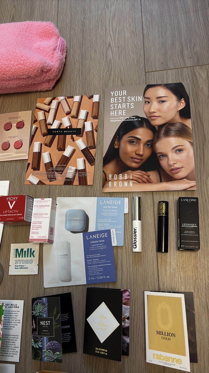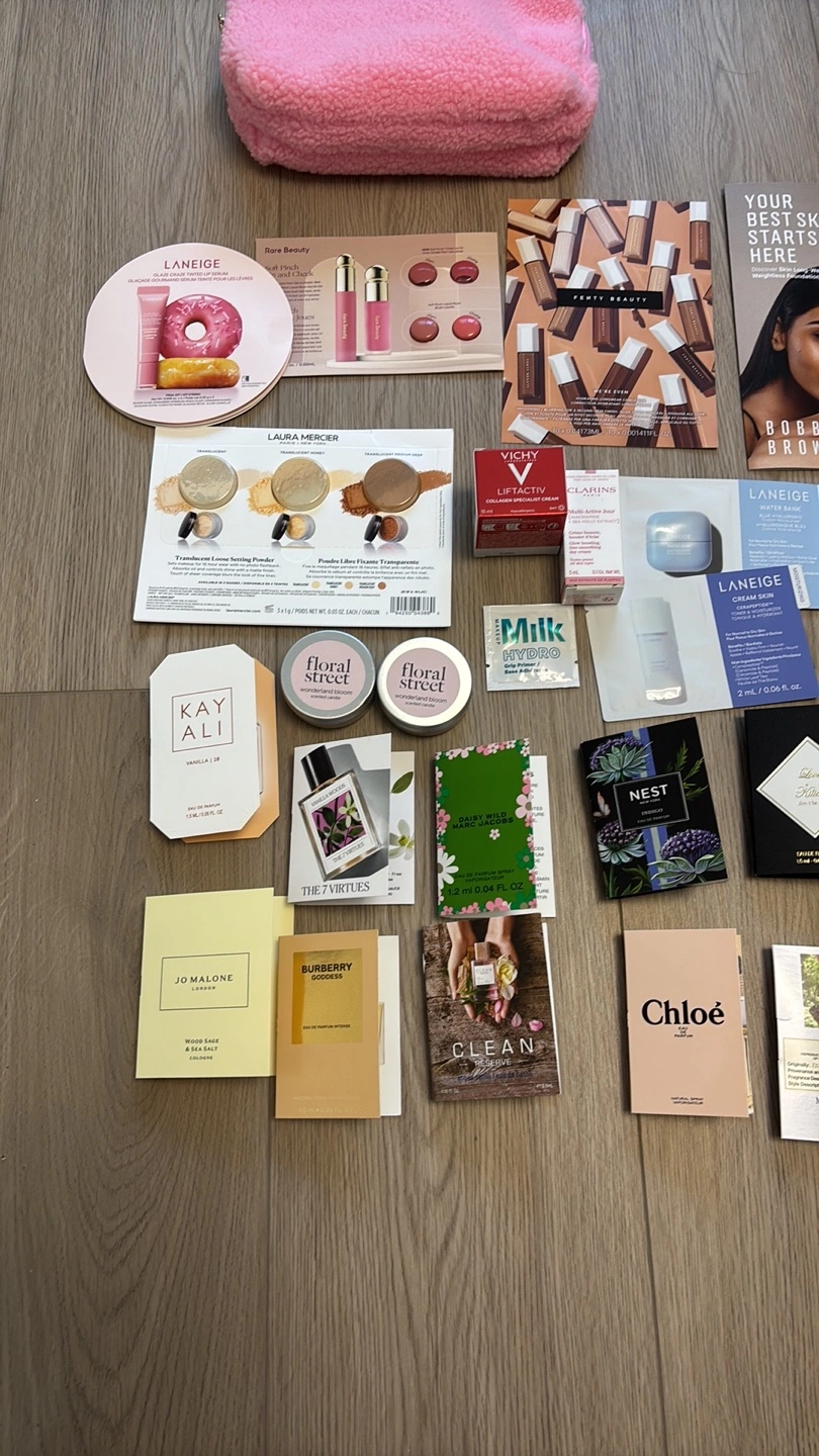 The bundle includes: 11 perfume samples 2 floral street mini scented candles 7 make up samples (foundation, concealer, lip serum, mascara etc) 6 skincare samples (Lancôme Génifique serum, Laneige tinted lip serum etc) 1 new fluffy makeup bag