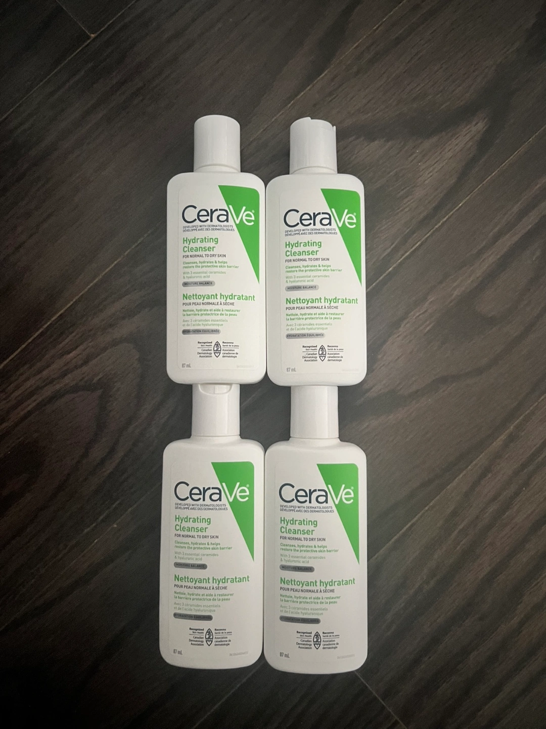 Selling four CeraVe Hydrating Cleansers, perfect for normal to dry skin! These cleansers hydrate and help to restore the protective skin barrier. Each bottle contains 67 mL of product $3 each or $10 for 4