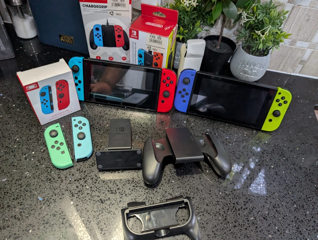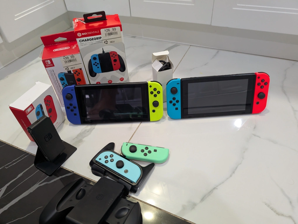 Selling a Nintendo Switch bundle with various accessories. It includes two Nintendo Switch consoles, each with its own set of Joy-Cons in different colours. Also included are charging docks and grips for comfortable gaming sessions. Perfect for multiplayer fun! Best offer only serious people