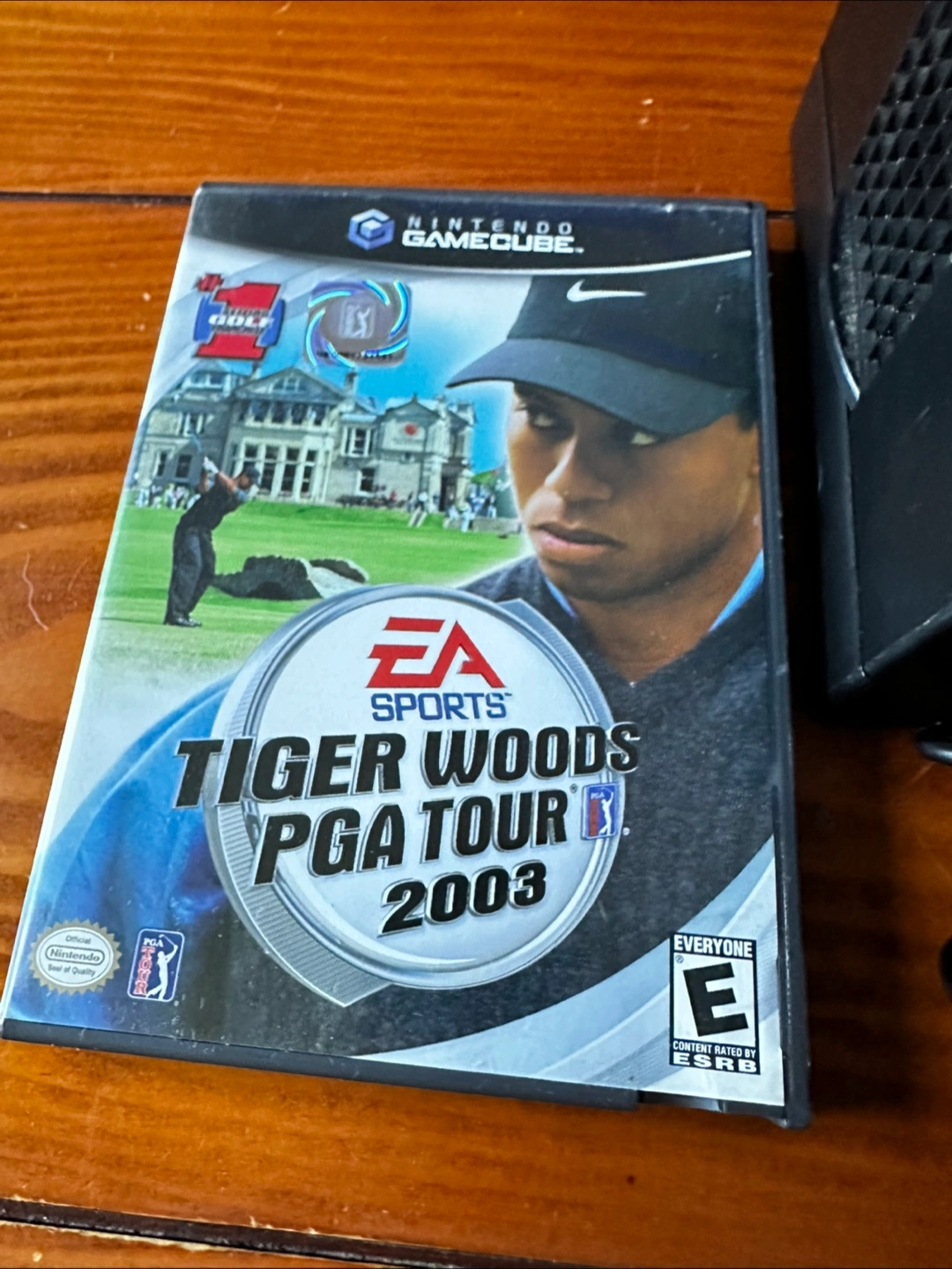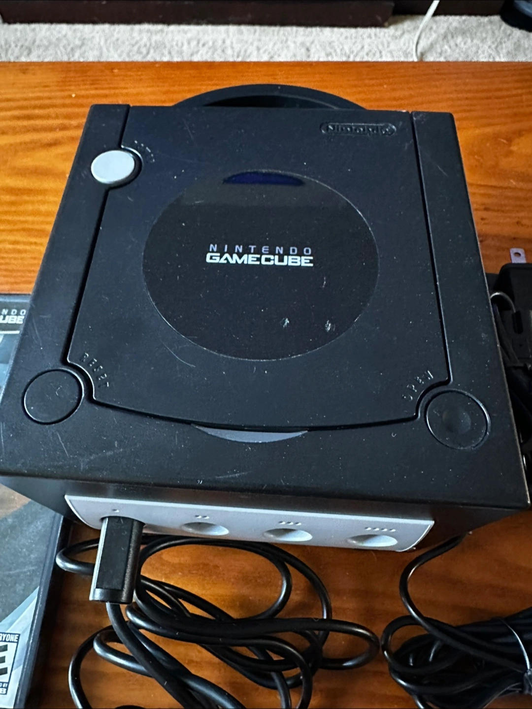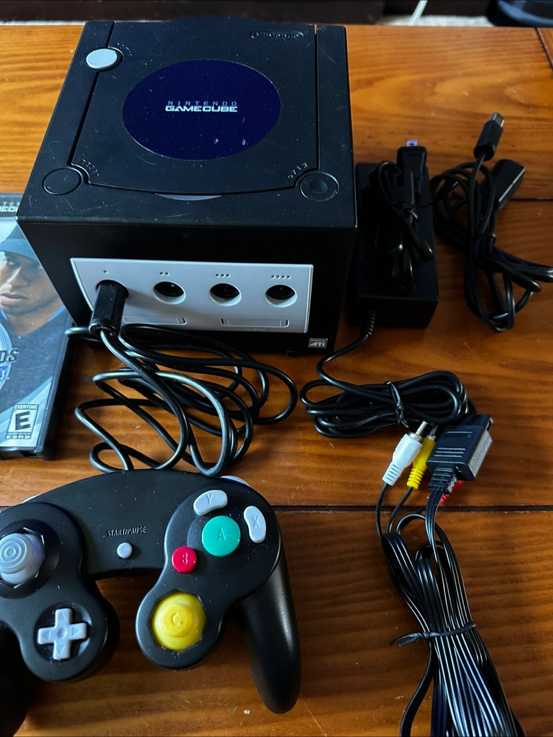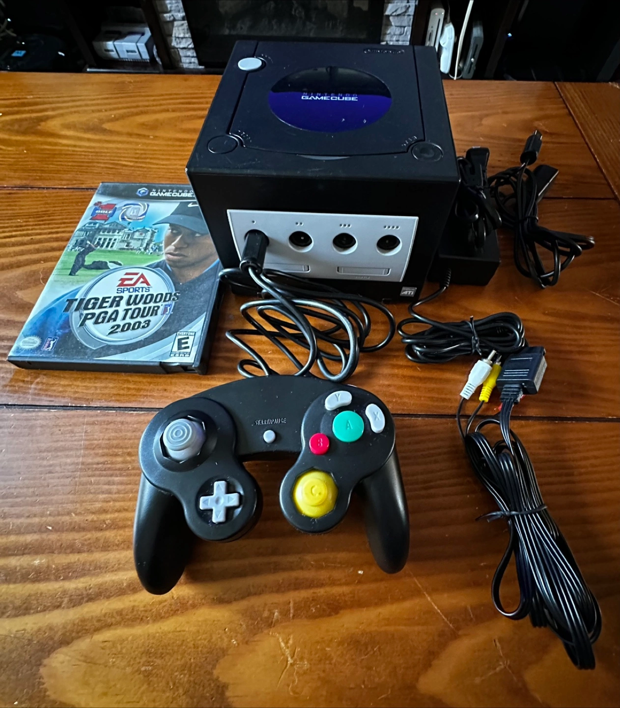 Selling a black Nintendo GameCube! It comes with 1 controller with 3 foot extension cable, power adapter, AV cable, and the game Tiger Woods PGA Tour 2003