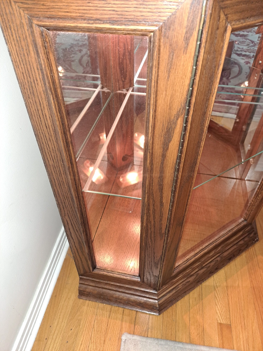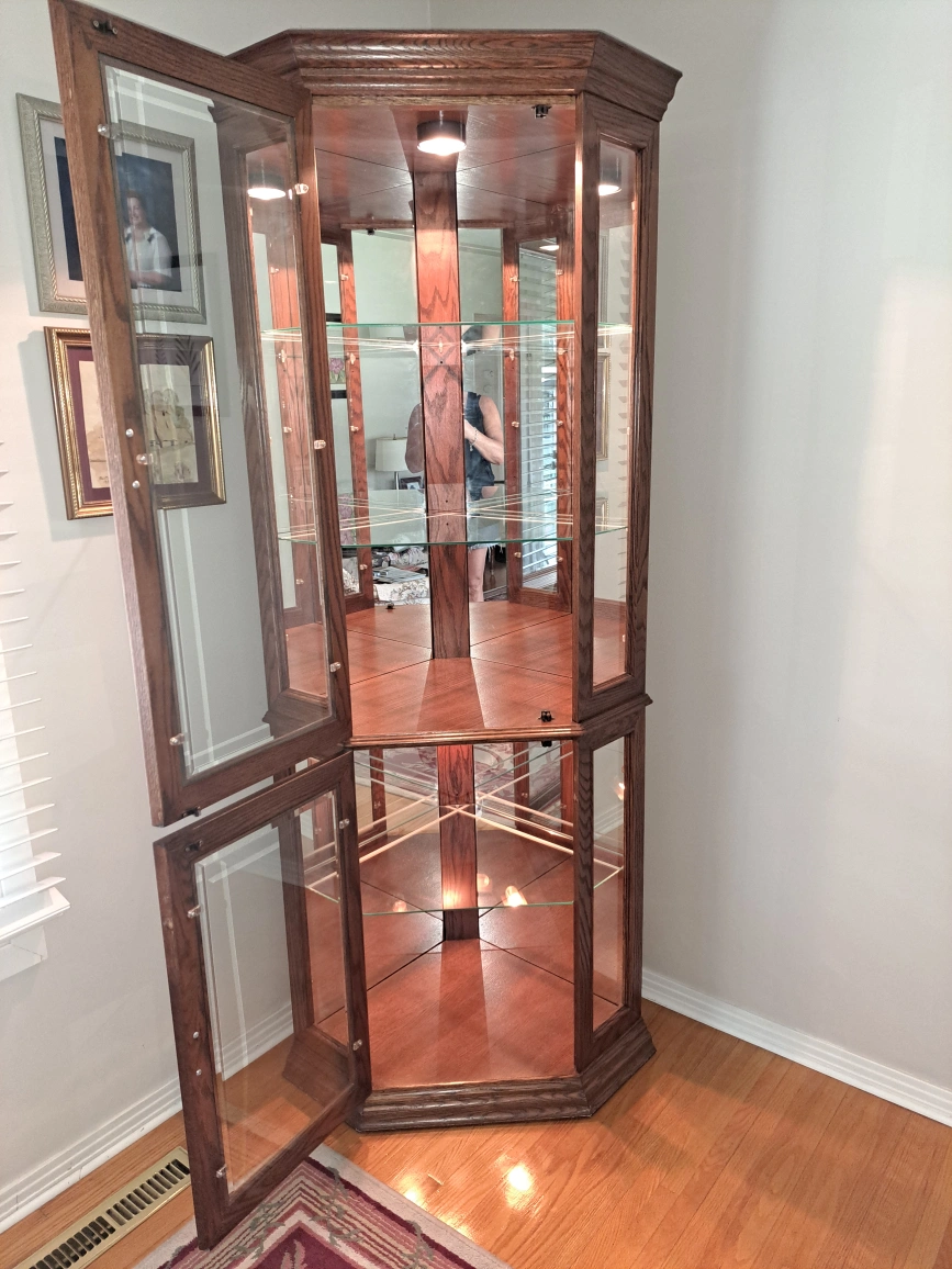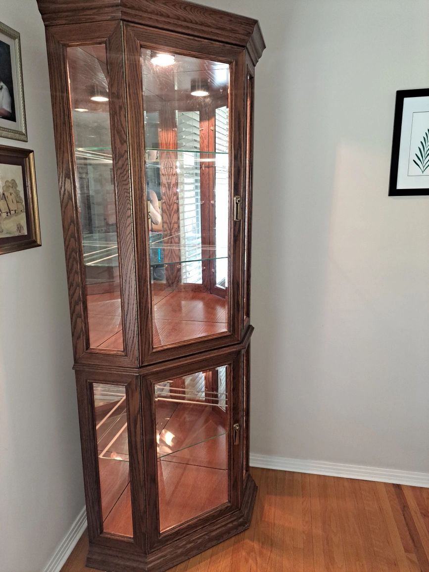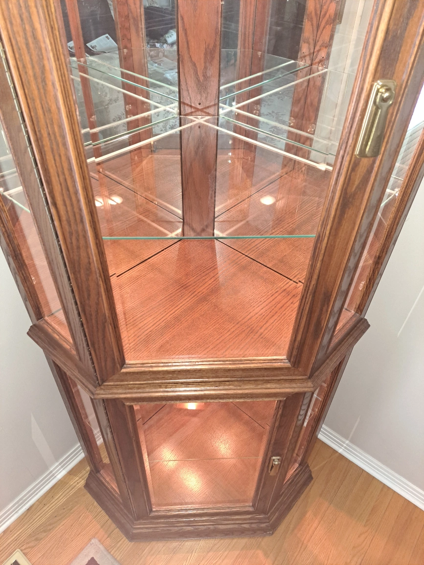 Selling a lovely oak corner curio cabinet! It features glass shelves and mirrored back panels, perfect for displaying your favourite items. The cabinet is in excellent condition and ready to add a touch of elegance to your home. One piece 73.5" tall 20.5" along the wall 1 side 33" across Killarney area non smoking home cash only
