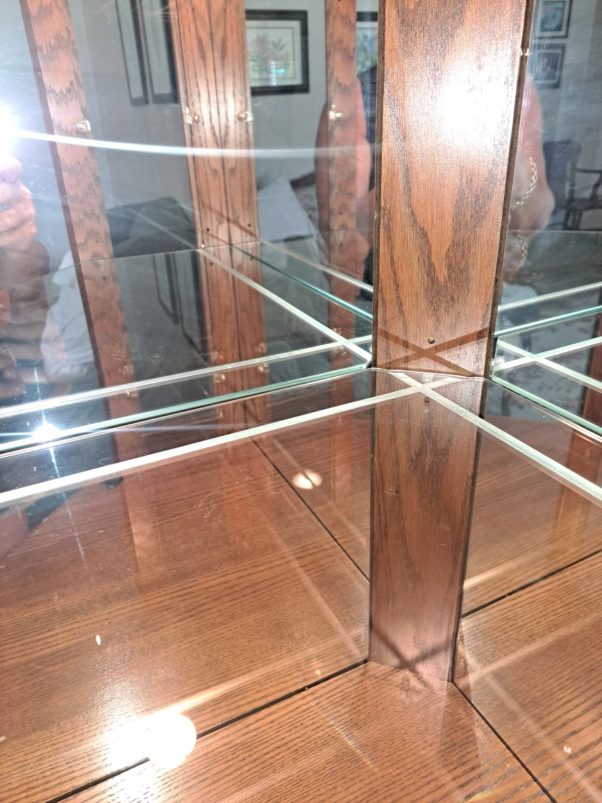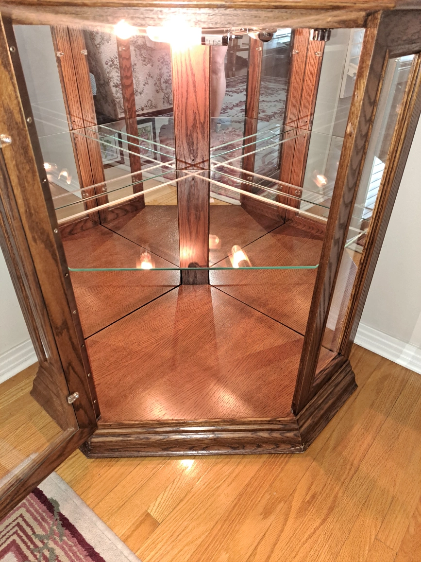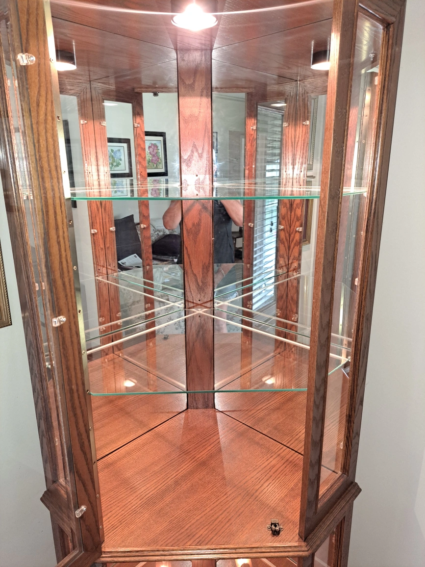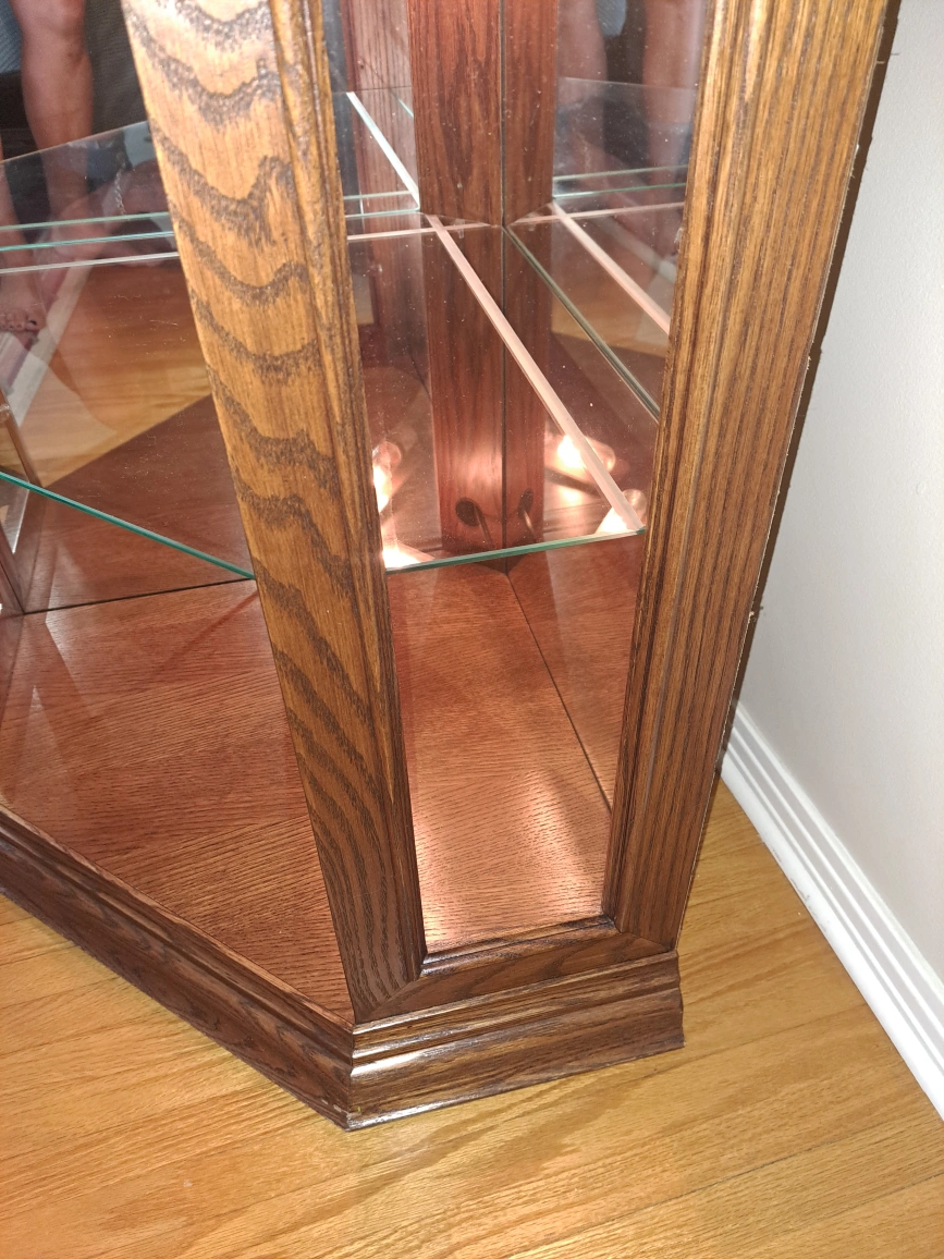 Selling a lovely oak corner curio cabinet! It features glass shelves and mirrored back panels, perfect for displaying your favourite items. The cabinet is in excellent condition and ready to add a touch of elegance to your home. One piece 73.5" tall 20.5" along the wall 1 side 33" across Killarney area non smoking home cash only