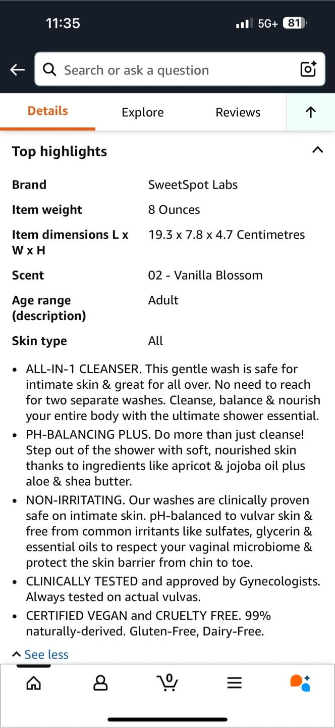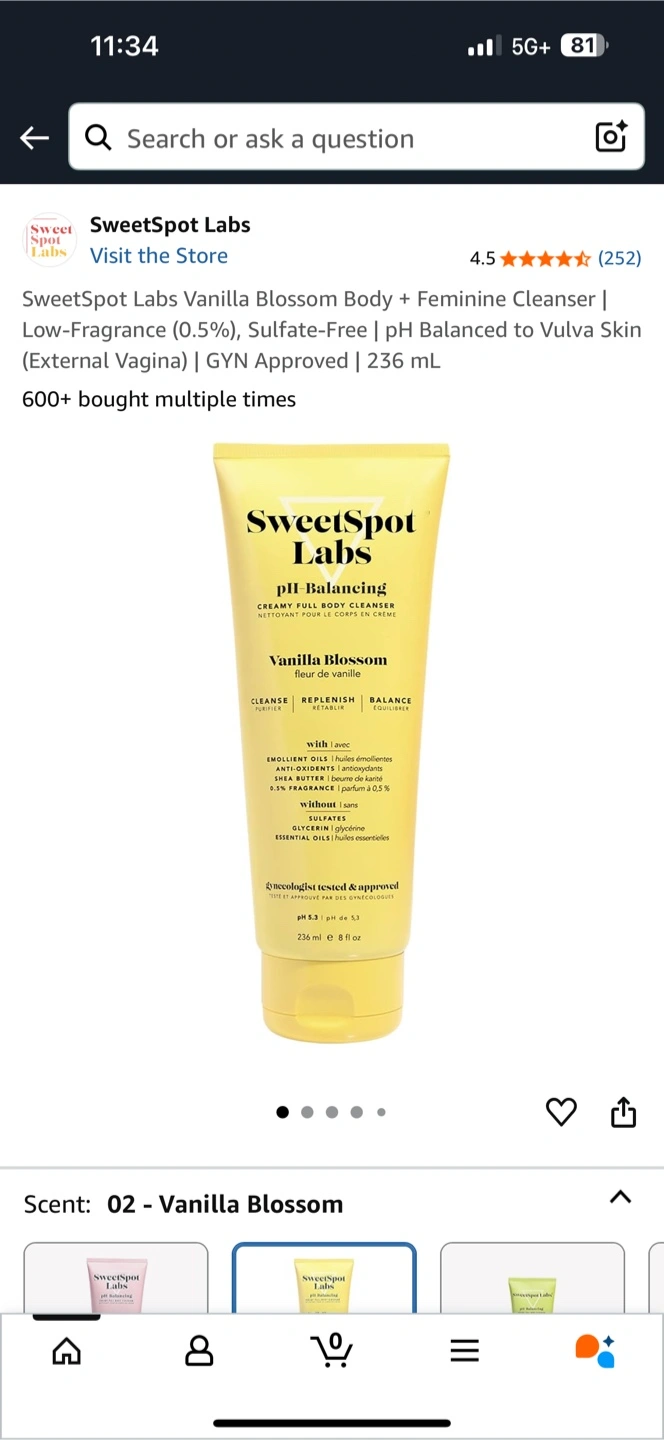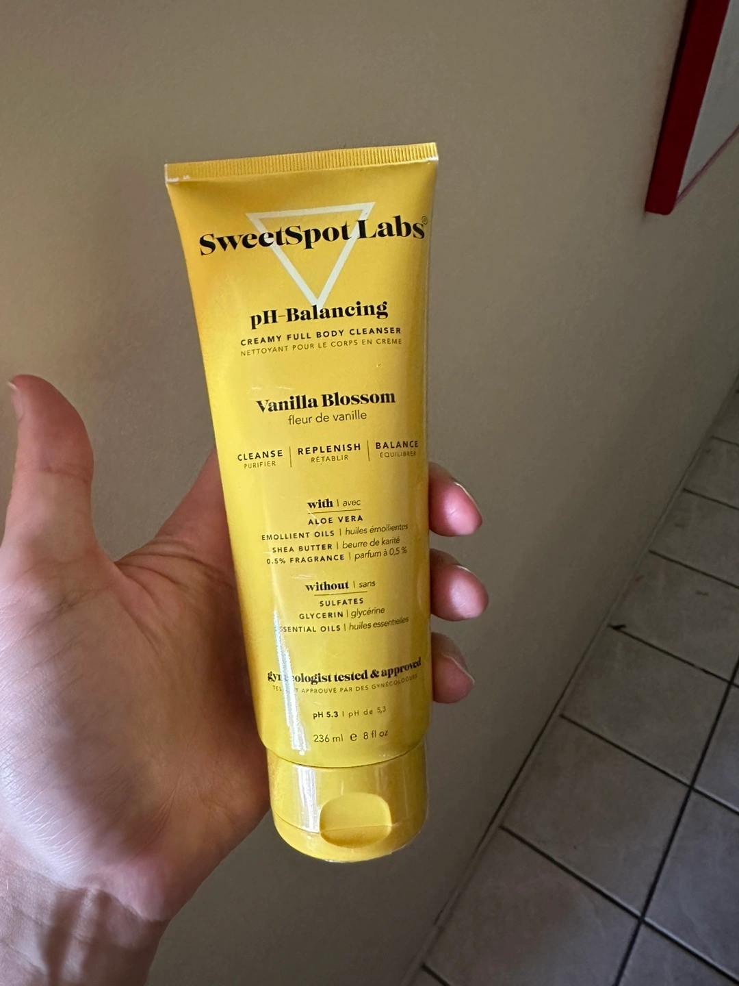 This is a SweetSpot Labs Vanilla Blossom Creamy Full Body Cleanser. It's pH-balancing and sulfate-free. This gentle wash is safe for intimate skin and great for all over! Cleanse, balance & nourish your entire body with the ultimate shower essential. It's clinically tested and approved by gynecologists, and is vegan and cruelty free