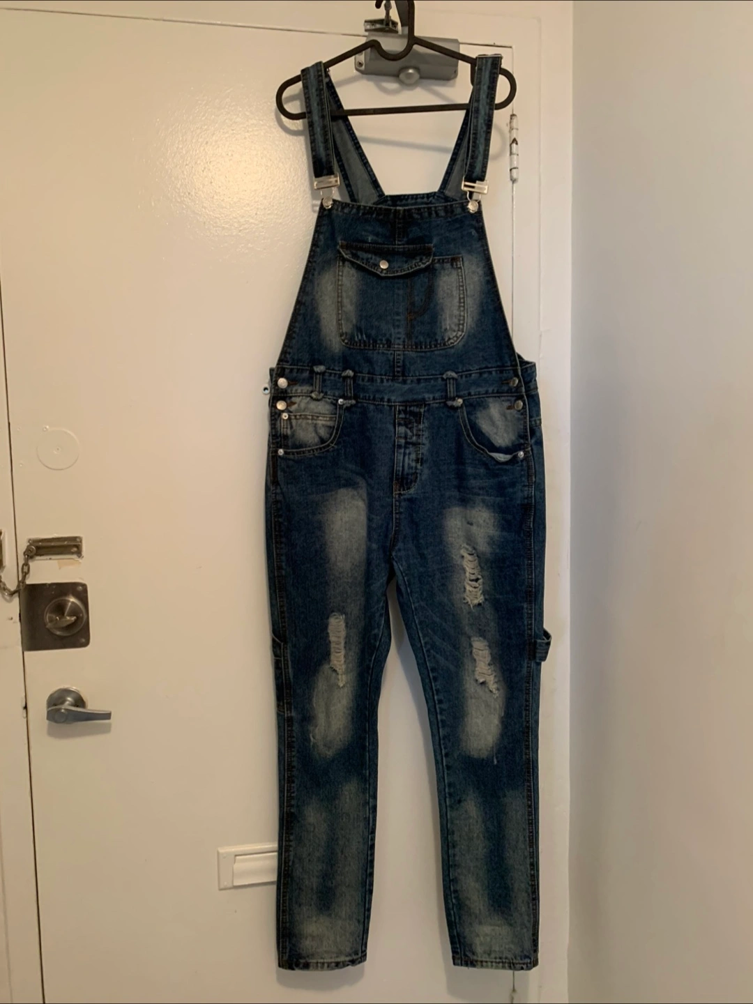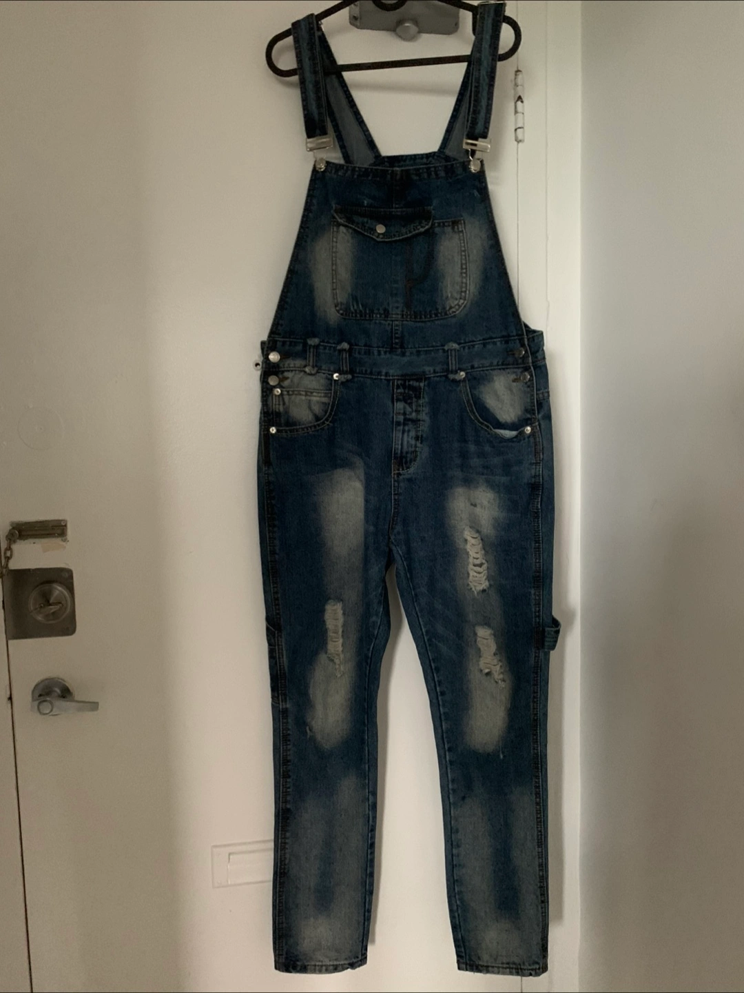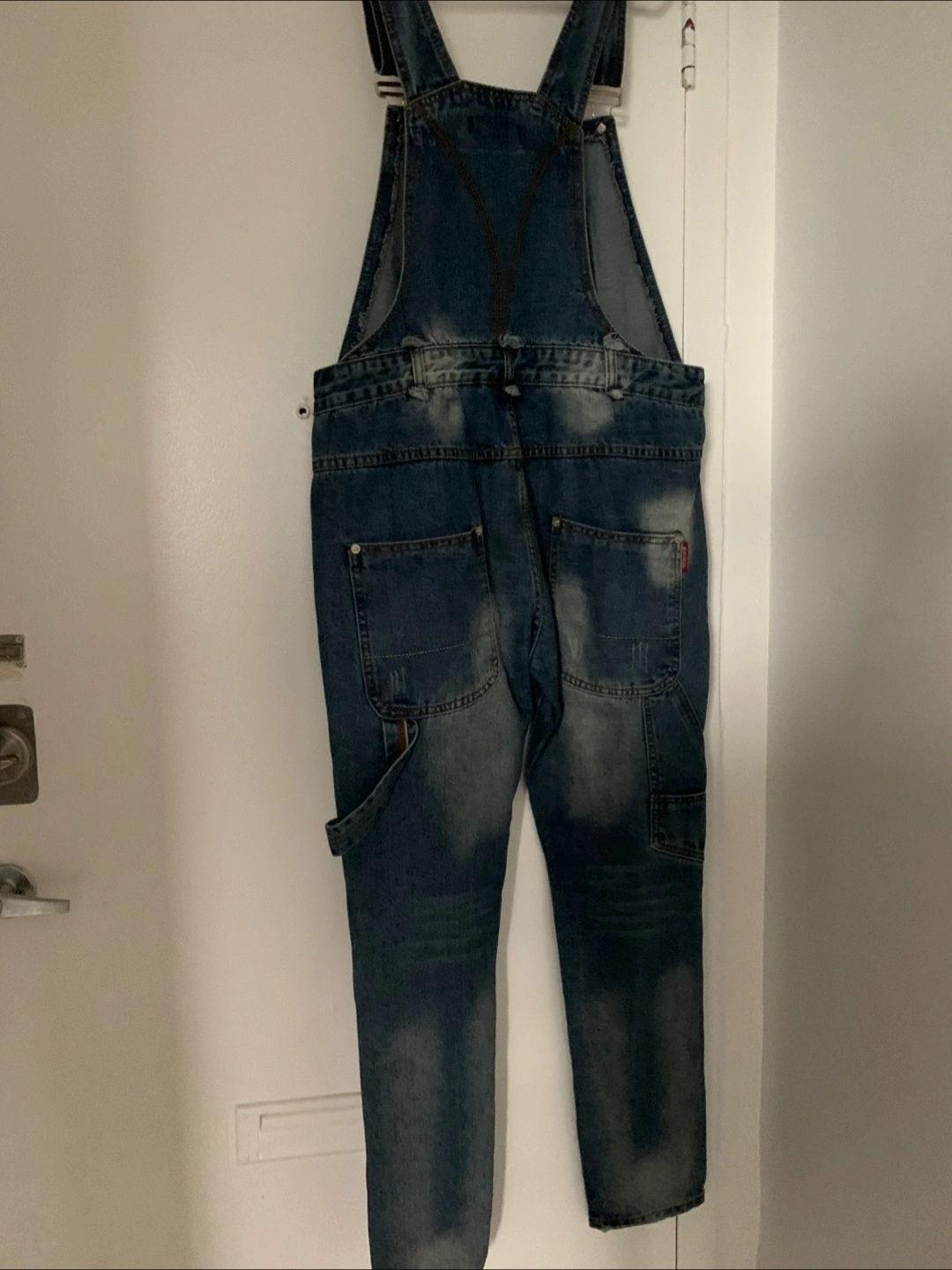 Selling a pair of denim overalls. They're in good condition, with a classic blue denim wash. Perfect for a casual, comfy look!