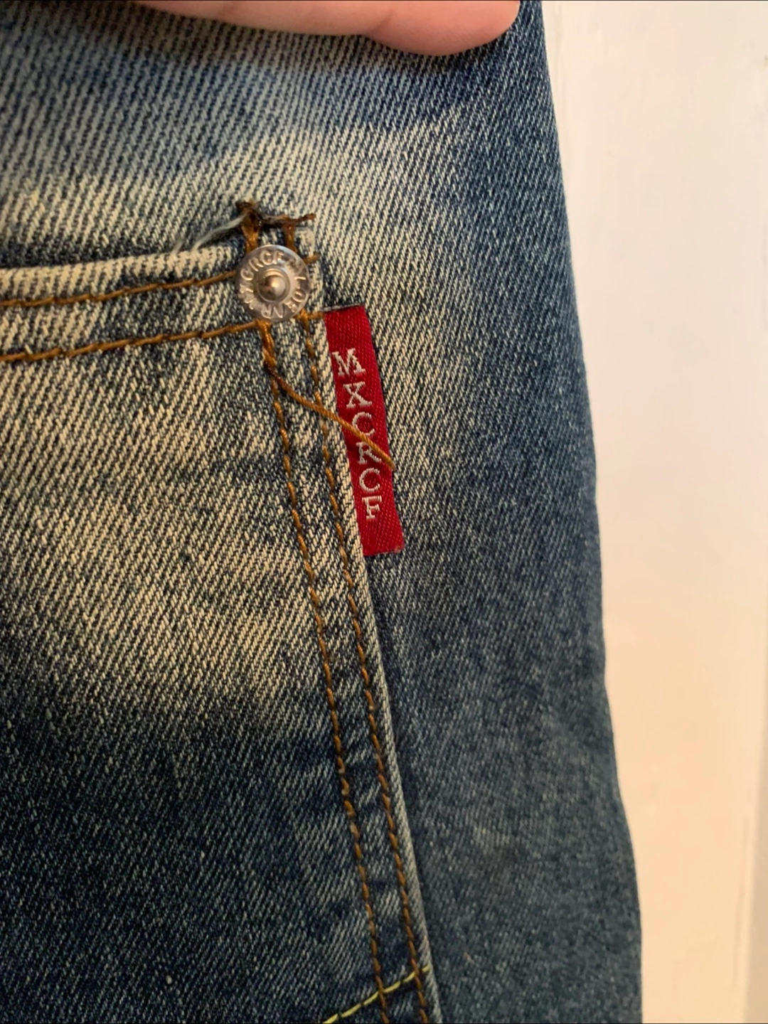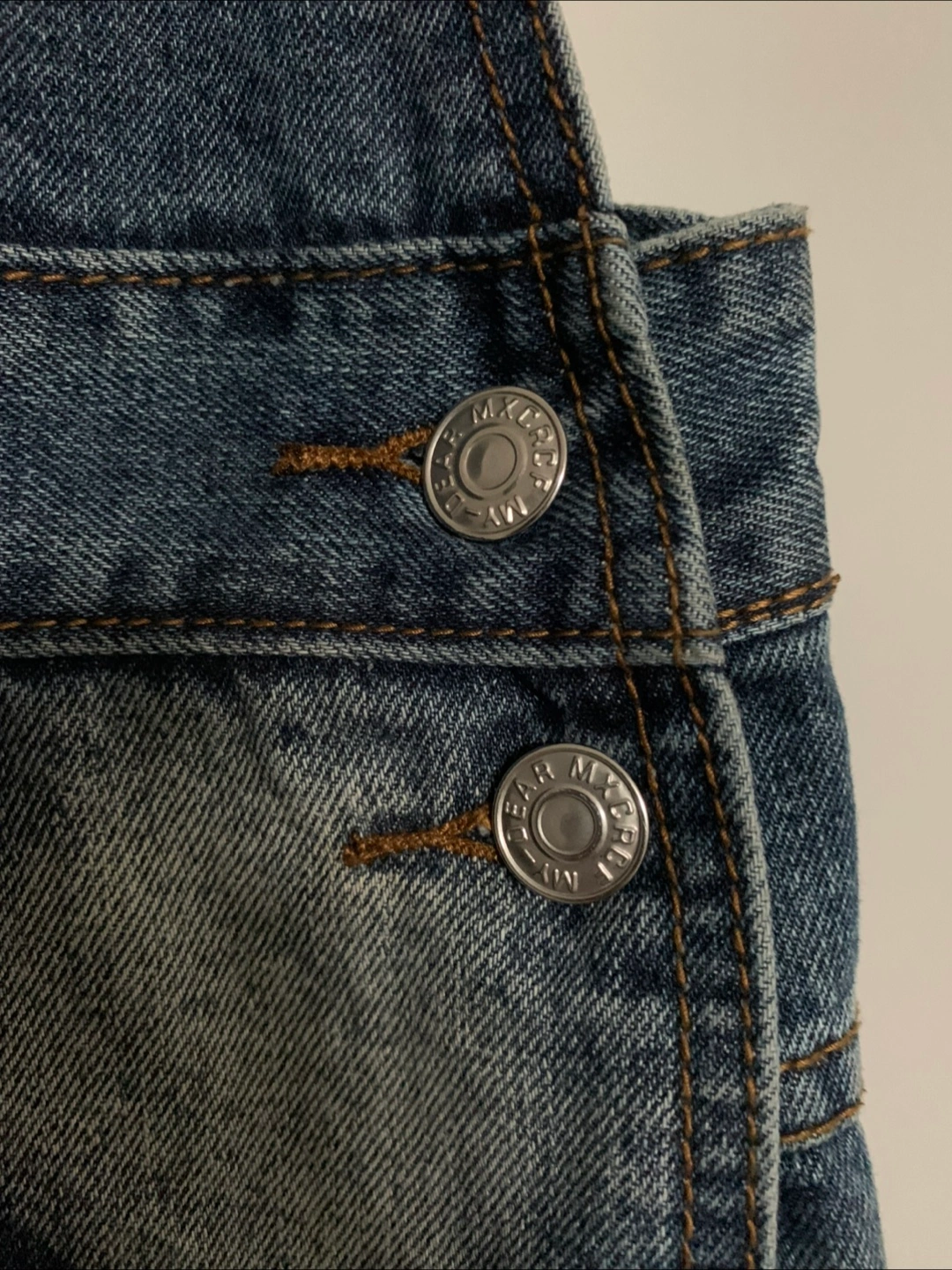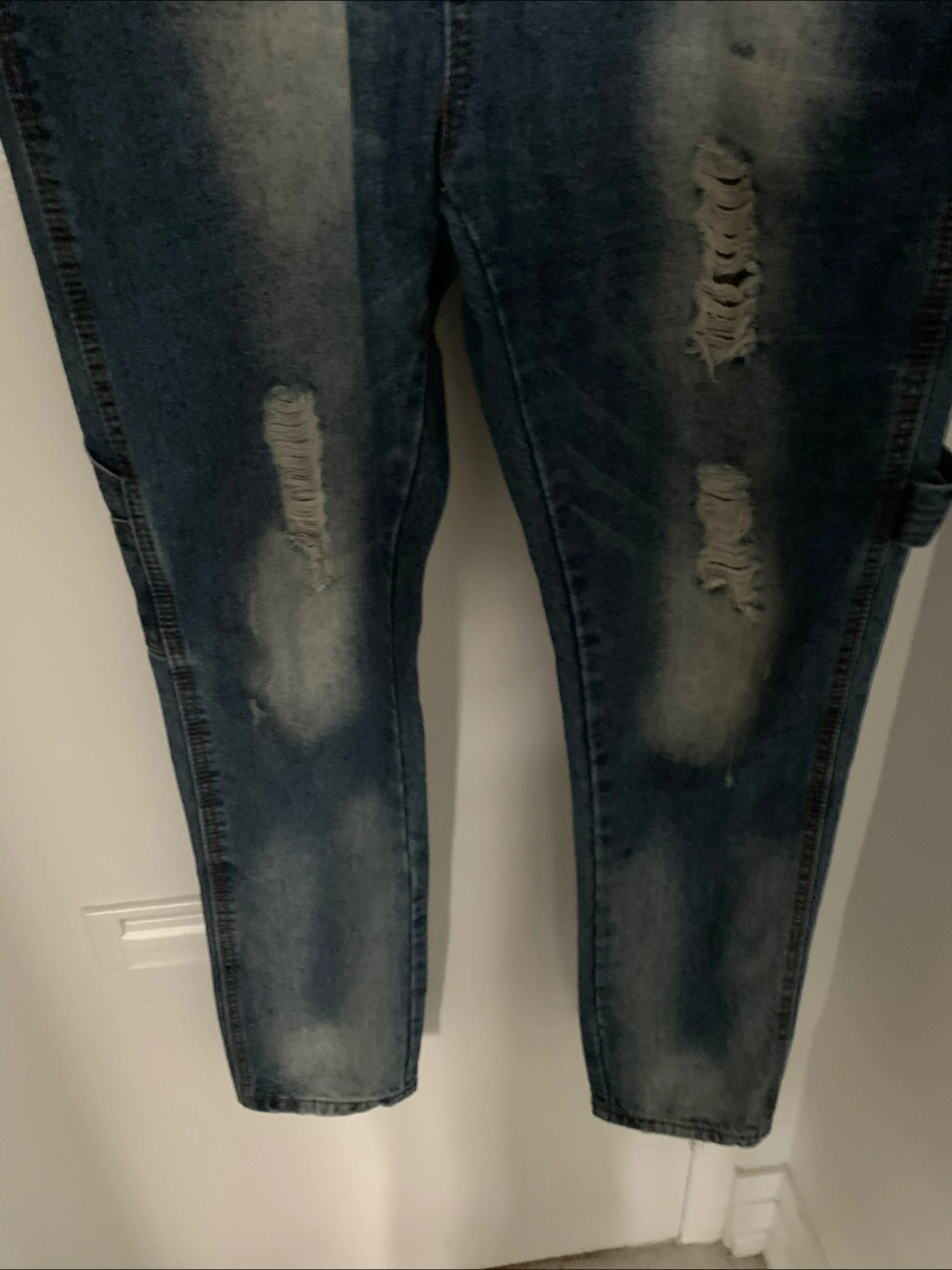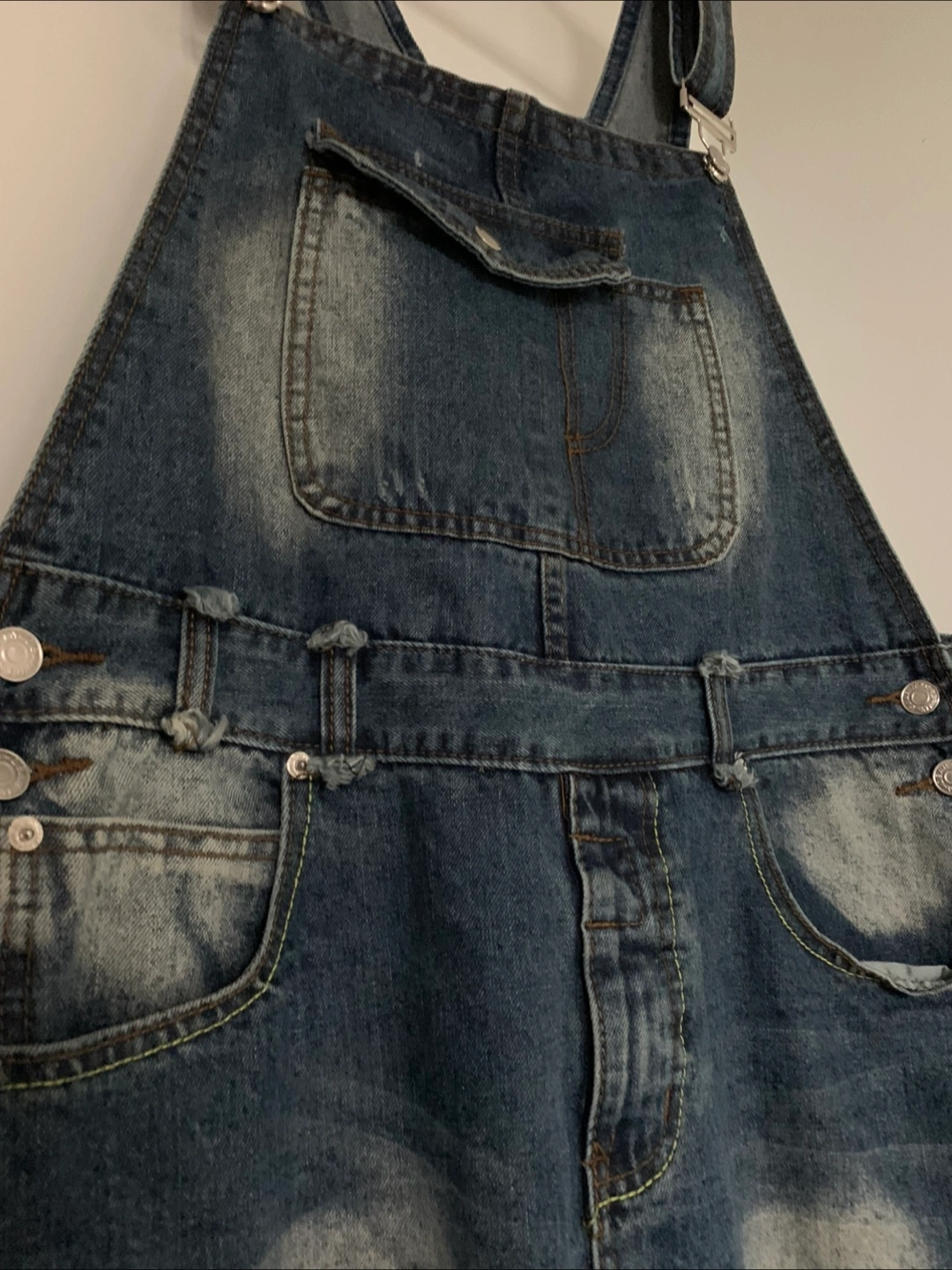 Selling a pair of denim overalls. They're in good condition, with a classic blue denim wash. Perfect for a casual, comfy look!
