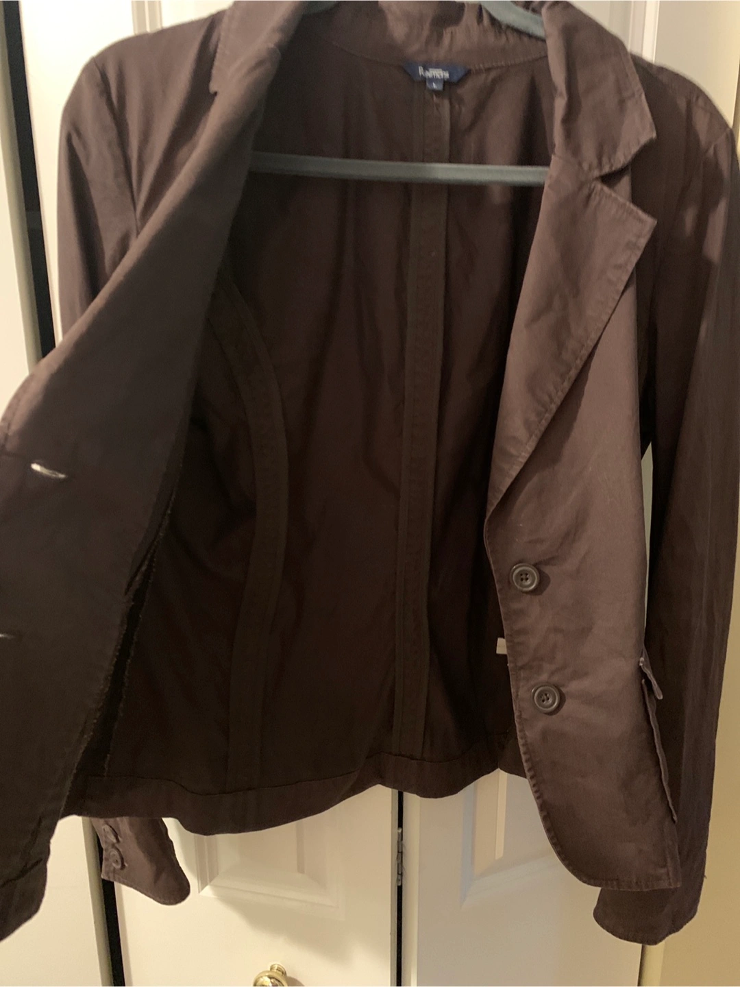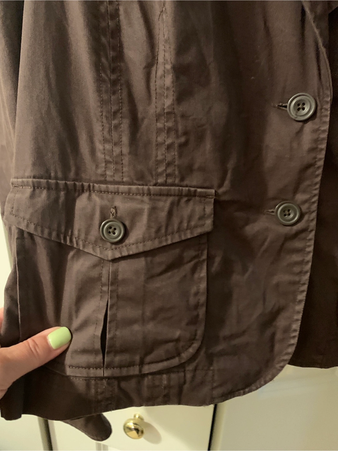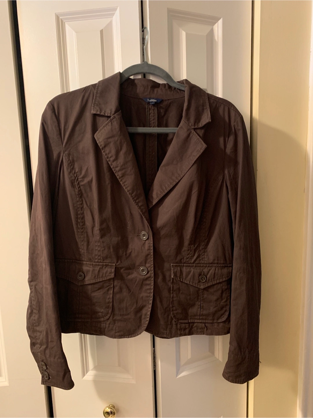 Selling a gently used Reitmans lightweight blazer/jacket in a lovely brown colour. Brown is the new hot trend of fall🤎! It's a size L and made of a 100% cotton. It features a two button closure with two functioning flap pockets on the front. It also has two buttons on the sleeves so you can roll them up if you choose. It sits just below the waistline on most. Perfect for layering and elevating your look without too much bulk. Would look great with a pair of jeans and brown leather booties! Cash only please.