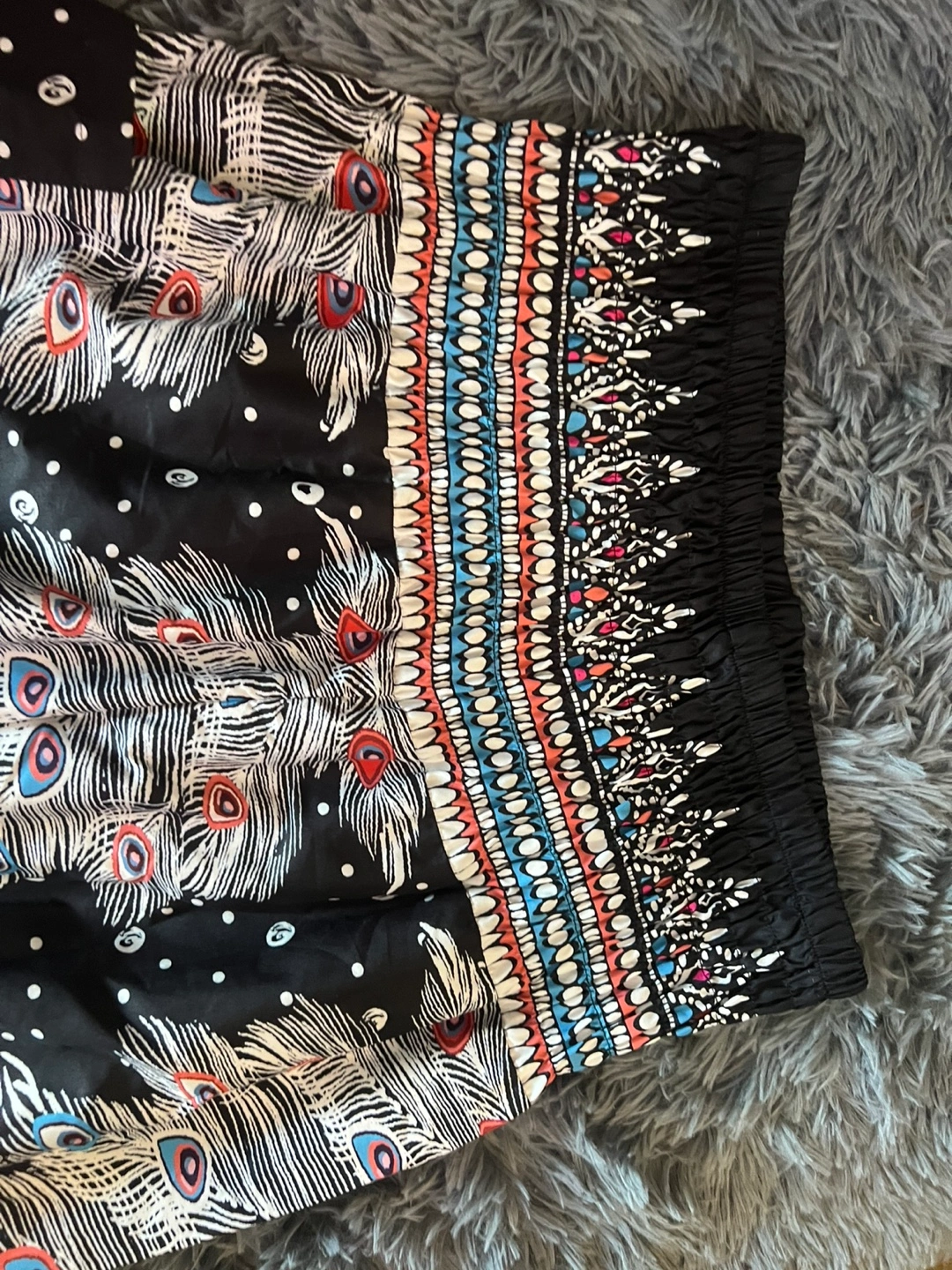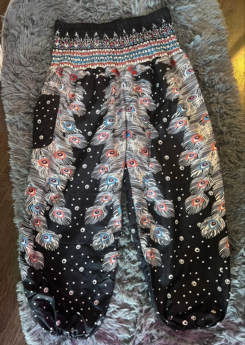 Super comfy and stylish harem pants! They're a size 2XL and made of 100% polyester. The pattern is a fun peacock feather print on a black background. Perfect for lounging or a casual day out!