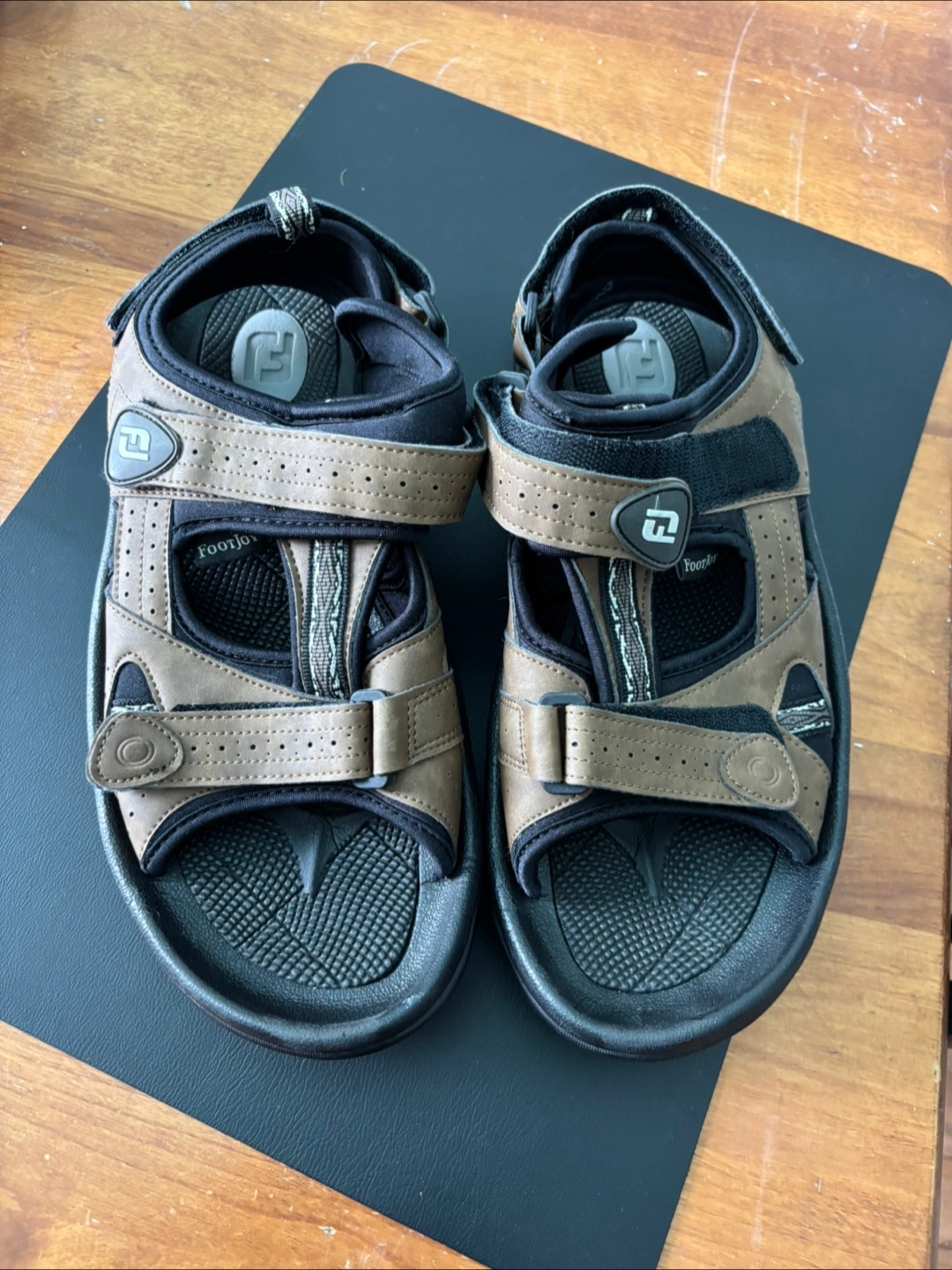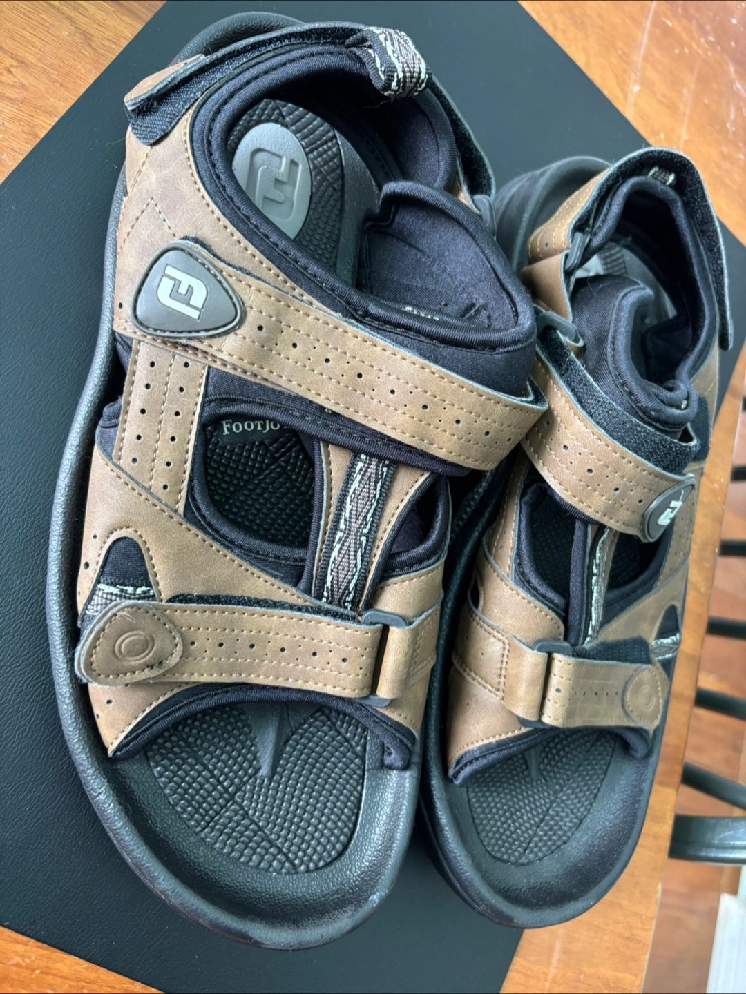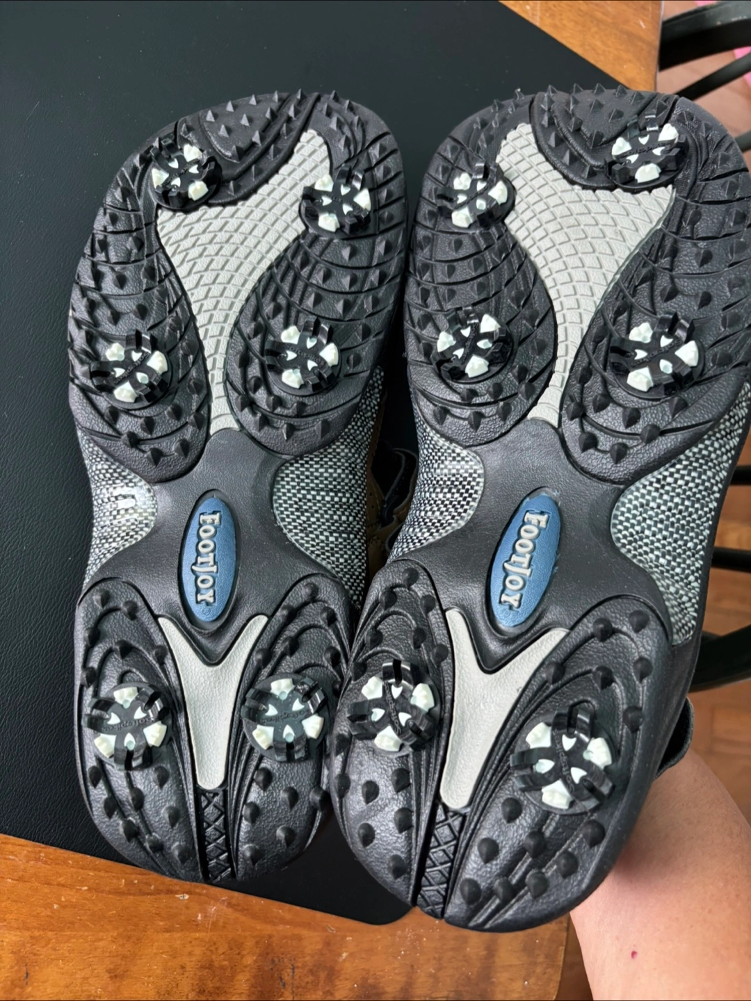 Synthetic leather (PVC) for easy care and water resistance, providing the look and feel of leather. • Fit: Adjustable hook-and-loop straps for a customized fit. & • Outsole: DuraMax rubber outsole for turf-gripping performance and durability. & • Cleats: Equipped with Pulsar cleats by SoftSpikes. & • Last: Newport last, characterized by a full oblique toe, full across forefoot, full instep, and standard heel. Size 12 Like new